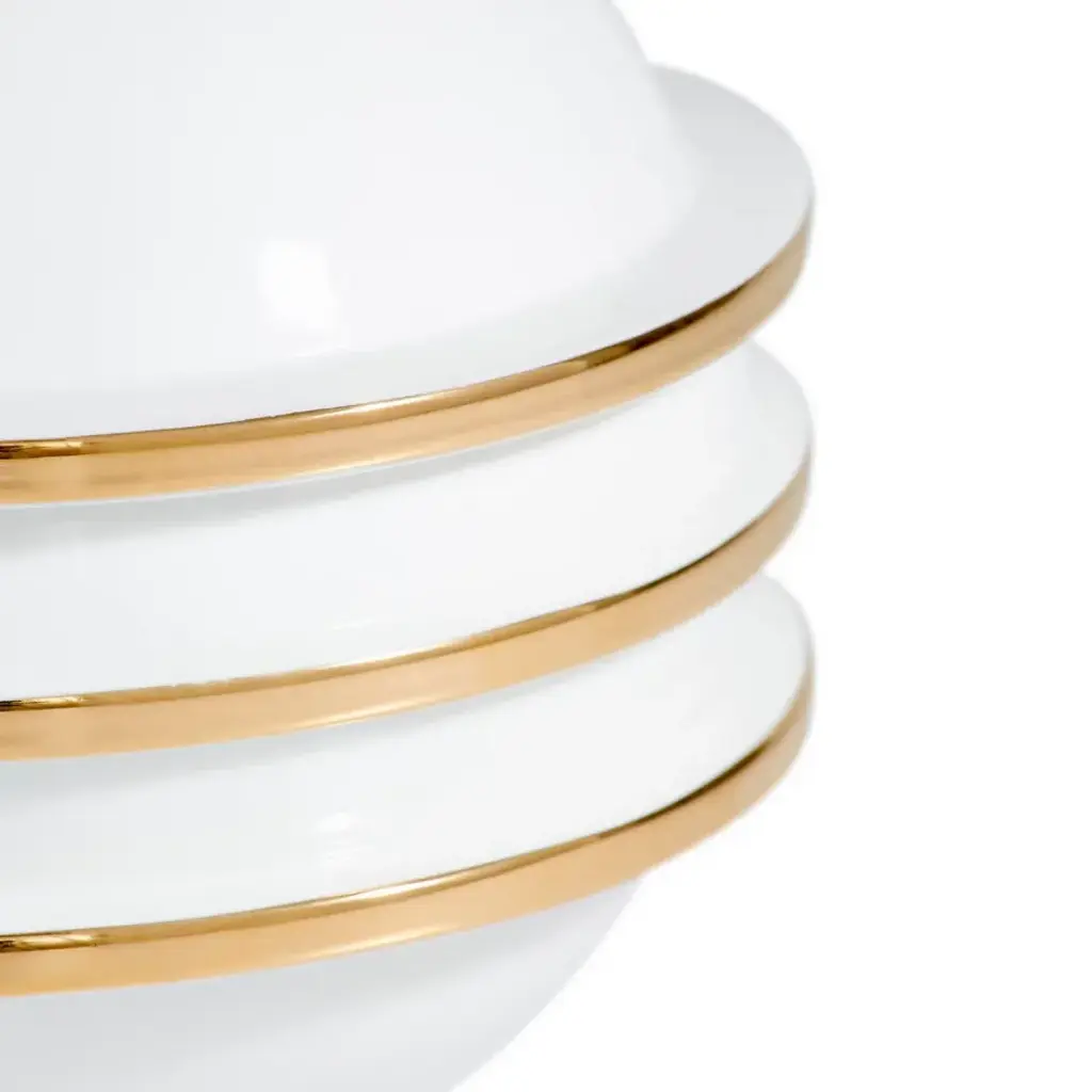 Space Age Glamour.Elemental porcelain vessels accented with rings in gleaming gold. Deliver glossy out-of-this-world glamour to your tablescape or mantel. Retro rad in a minimalist loft or beyond modern in a luxe lair.