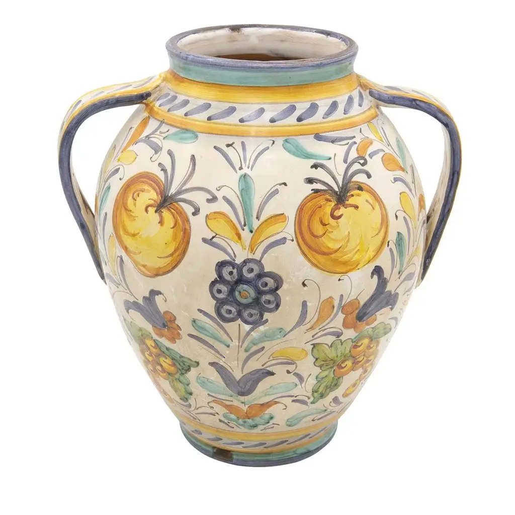A stunning objet d'art, this vase was entirely crafted by hand of ceramic by master artisan Lorenza Adami. Expression of the iconic tradition of Renaissance pottery, this vase showcases delicate curves, two handles, and a superb hand-applied decoration. Over a white background, a palette of blue, yellow, and turquoise creates a fresh and elegant decoration at the center of which stands out a blue fleur-de-lis, the symbol of the city of Florence. Either displayed alone or in combination with of the Orciolo Vase with Red Florentine Fleur-De-Lis, this piece will make a statement in any interior.