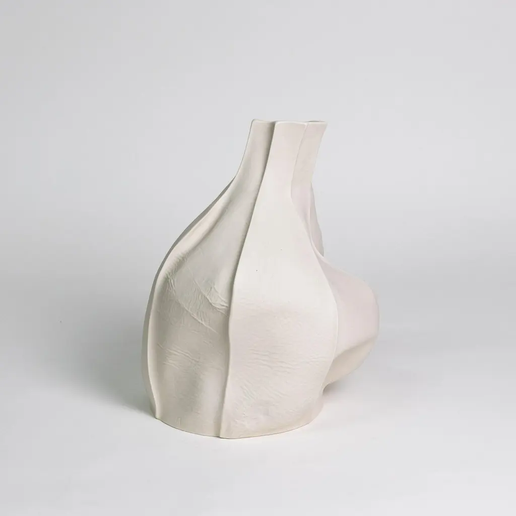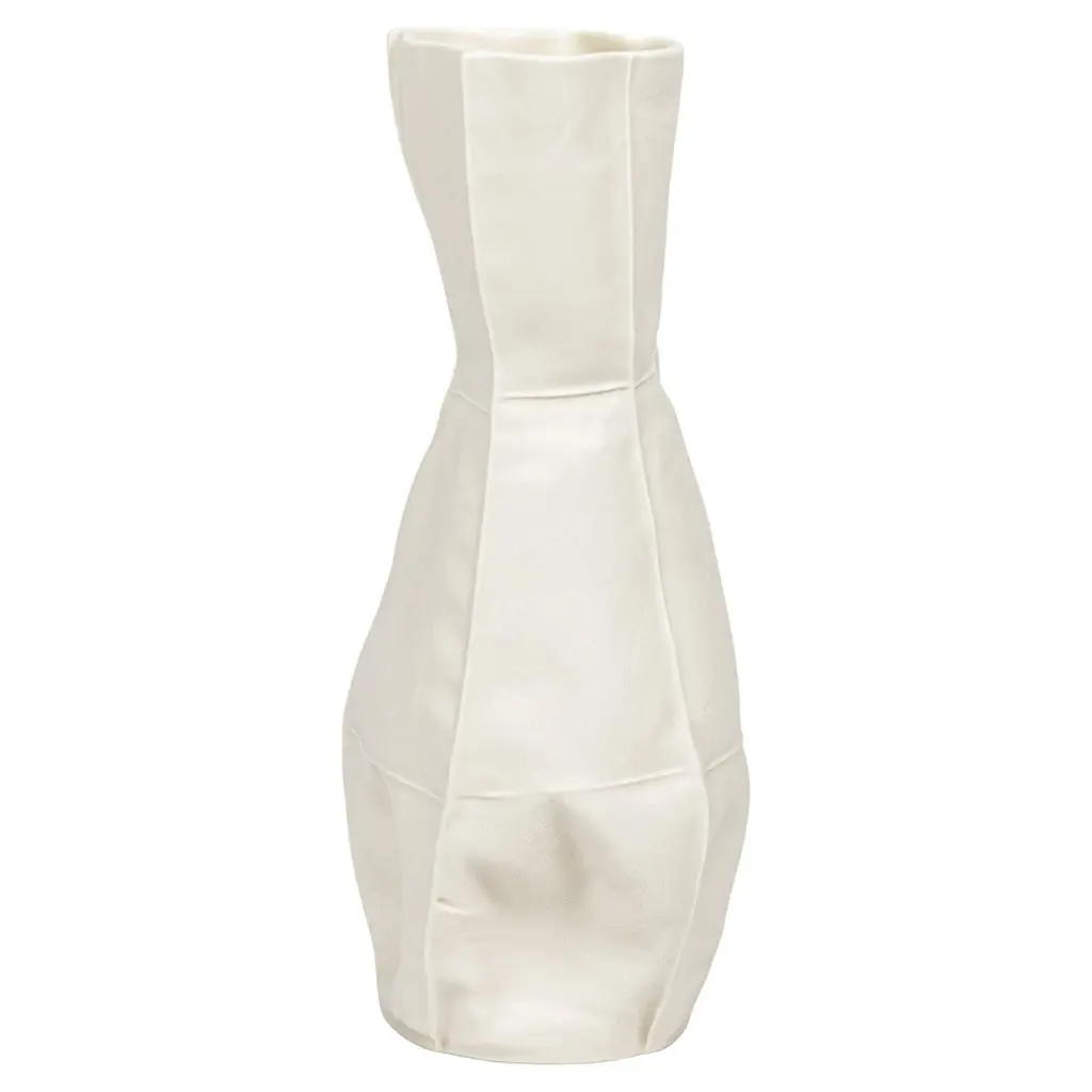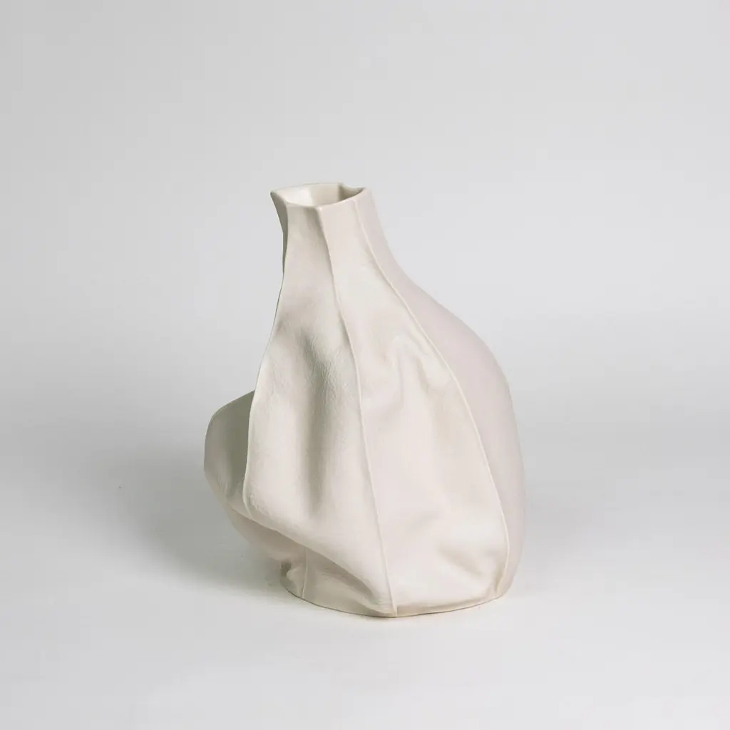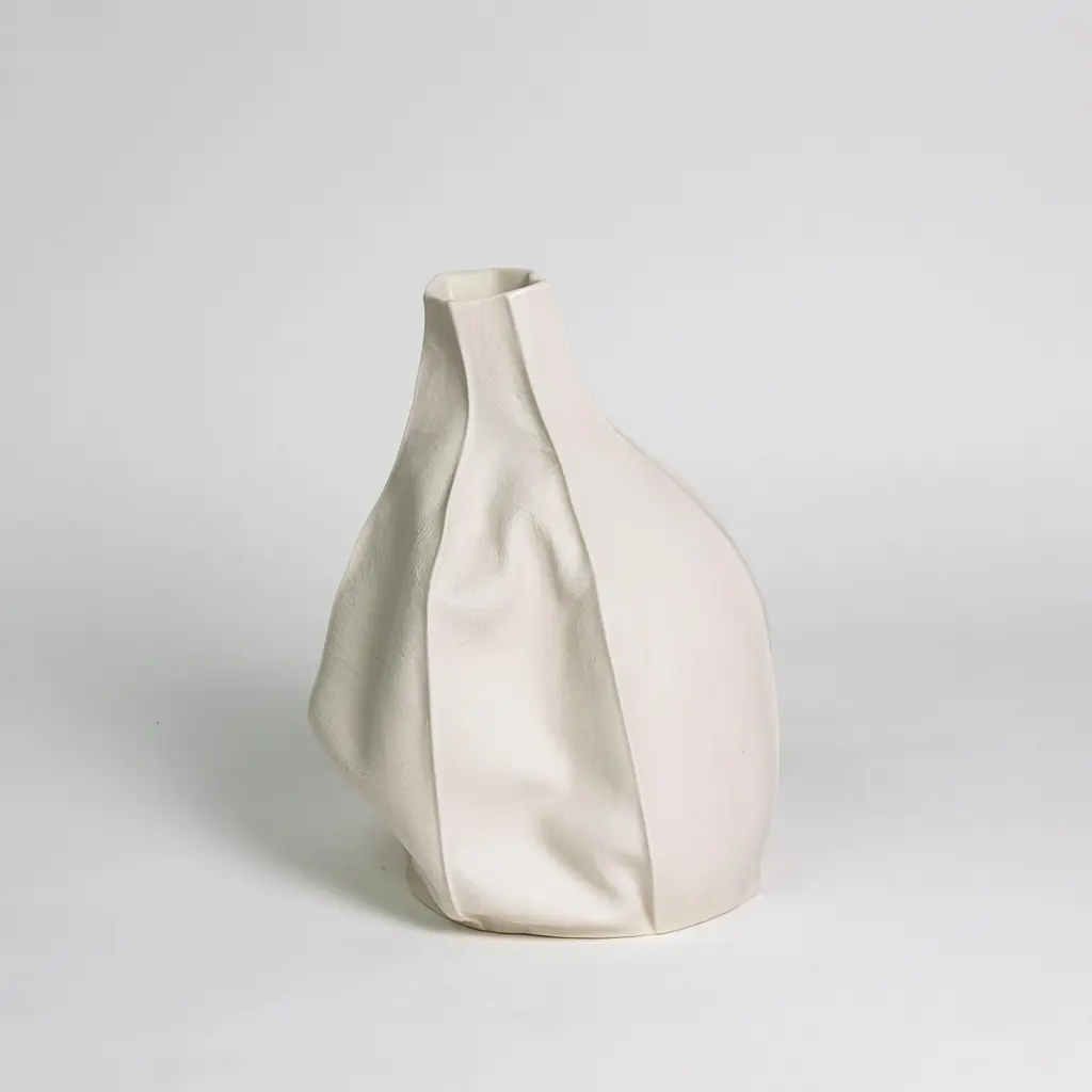 Kawa Vase 10Organic white ceramic vase with textured raw porcelain exterior surface and clear glazed interior. As a result of the production process each item is one-of-a-kind.Vases are watertight and will hold water for flower arrangements.7.5" dia. x 10.5" h Kawa Series by Luft TanakaThe unusual and painstakingly honed technique used to create the Kawa Series is distinct to Luft Tanaka Studio. Each Kawa piece begins as a sketch on paper. With the assistance of 3-D modeling, we create patterns for a leather mold. After the mold is sewn and prepared for casting, liquid porcelain is poured inside, over time forming a thin wall along the leather surface. The mold is then carefully cut open at the seams and delicately peeled off the porcelain.Kawa Series Background InfoThe Kawa Series was initially conceived in early 2012, when Luft’s thesis project at the Parsons School of Design called for a varied collection of eye-catching objects. Guided as he often is by his wabi-sabi tendencies, Luft became obsessed with devising a new system of production where process dictated form—and where objects created in multiples could still be one-of-a-kind. He experimented with a number of mediums over the course of a few months, but his aha-moment came one afternoon when he stumbled upon a discarded leather couch on a Manhattan curb. (“Kawa” is Japanese for “leather” or “skin.”)Luft had been studying the process of slip-casting, a traditional ceramic technique used to create nearly-identical objects—though typically using solid plaster molds. His technical understanding allowed him to see an opportunity in that curbside leather couch, so he did what any industrial design student would do: He took his utility knife out of his bag, stripped the couch of its leather, and brought his new materials back to the studio for immediate experimentation.By testing many different types of leather, as well as different ways to fabricate the molds, Luft gradually evolved the process from a messy first batch, where many of the pieces didn't survive the kiln, to test pieces that bore the early marks of his signature: both weird and beautiful, hard and soft, expressive, and full of personality.