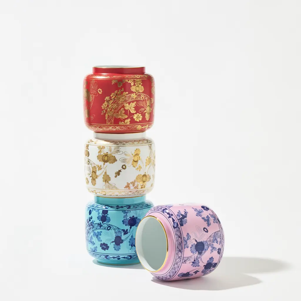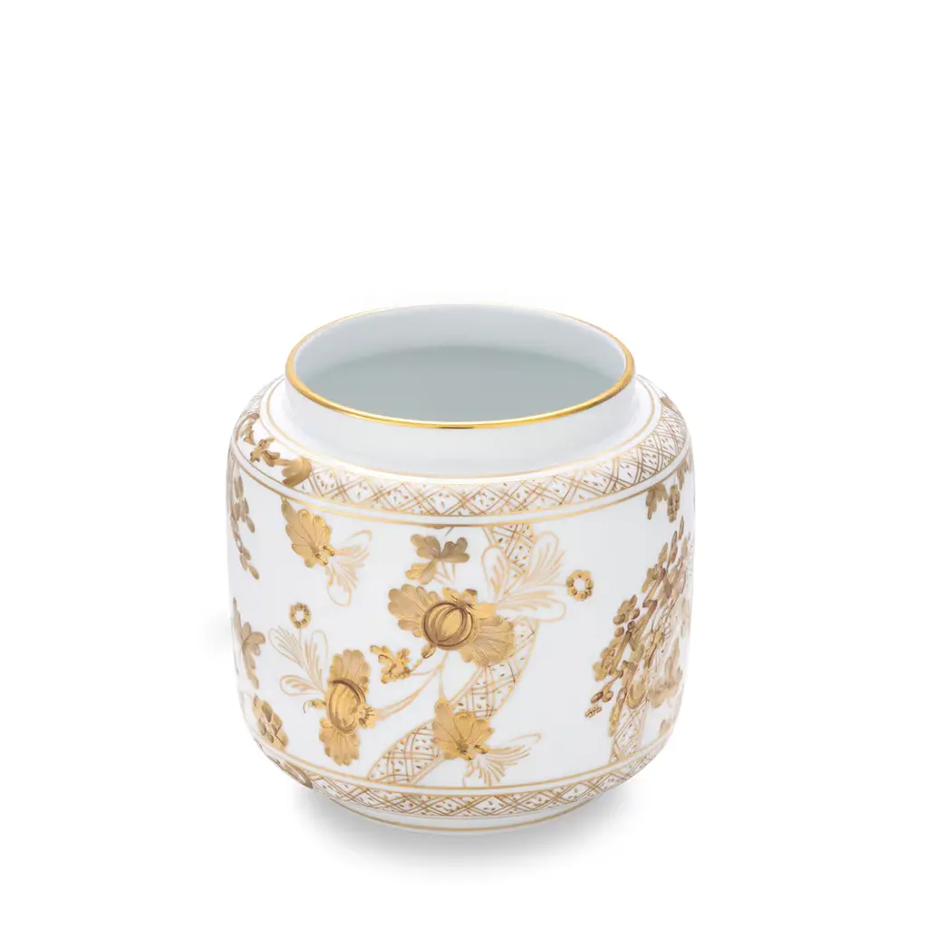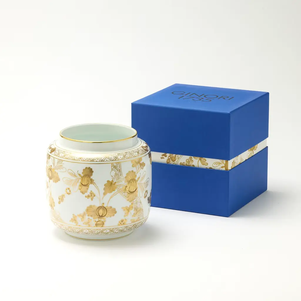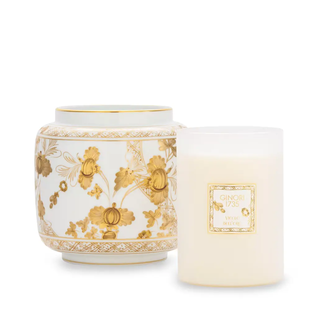The iconic Garofano (Carnation) in the aurum pattern with floral motif is beautifully reimagined in gold, adorning fine white porcelain with the expert craftsmanship of Florentine artisans. This timeless design offers versatility, allowing for elegant ton sur ton combinations with other candle holders. The vase is specifically designed for Ginori 1735’s Vicolo dell’Oro candle, filling any room with its floral-musky fragrance. Candle not included.