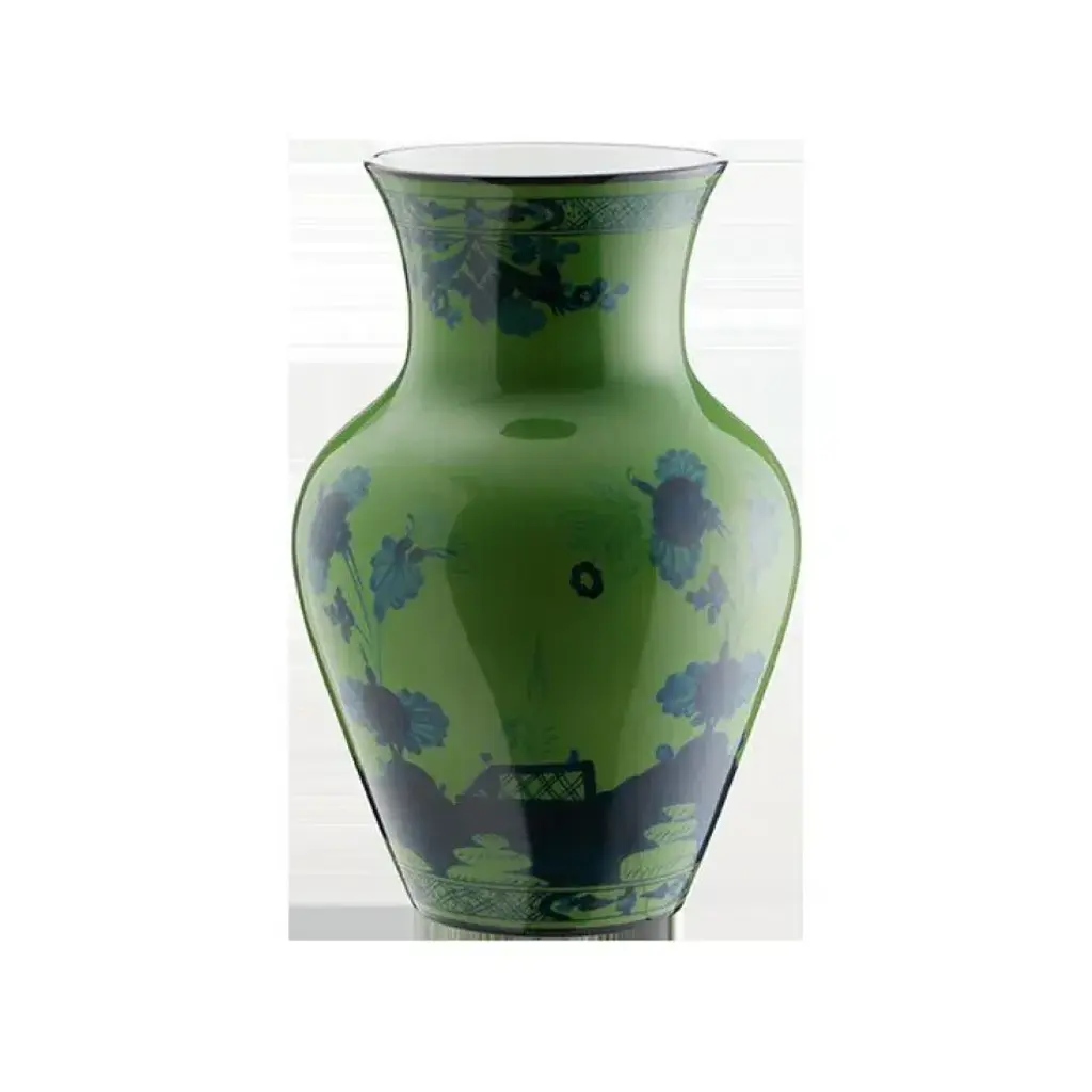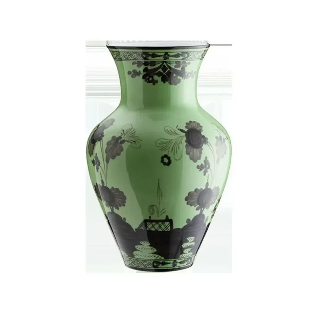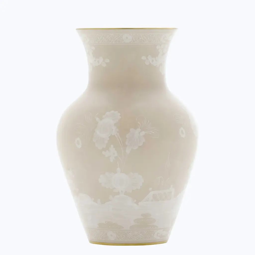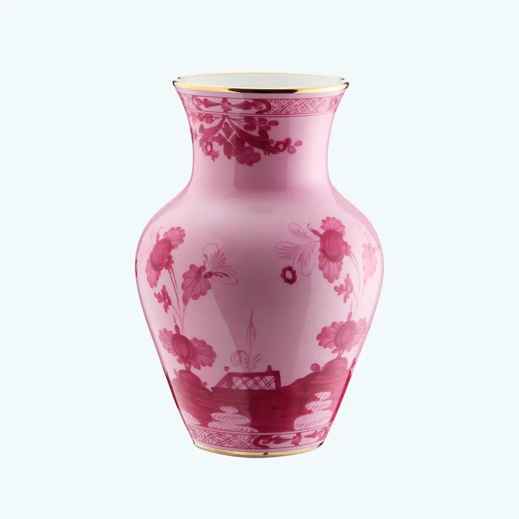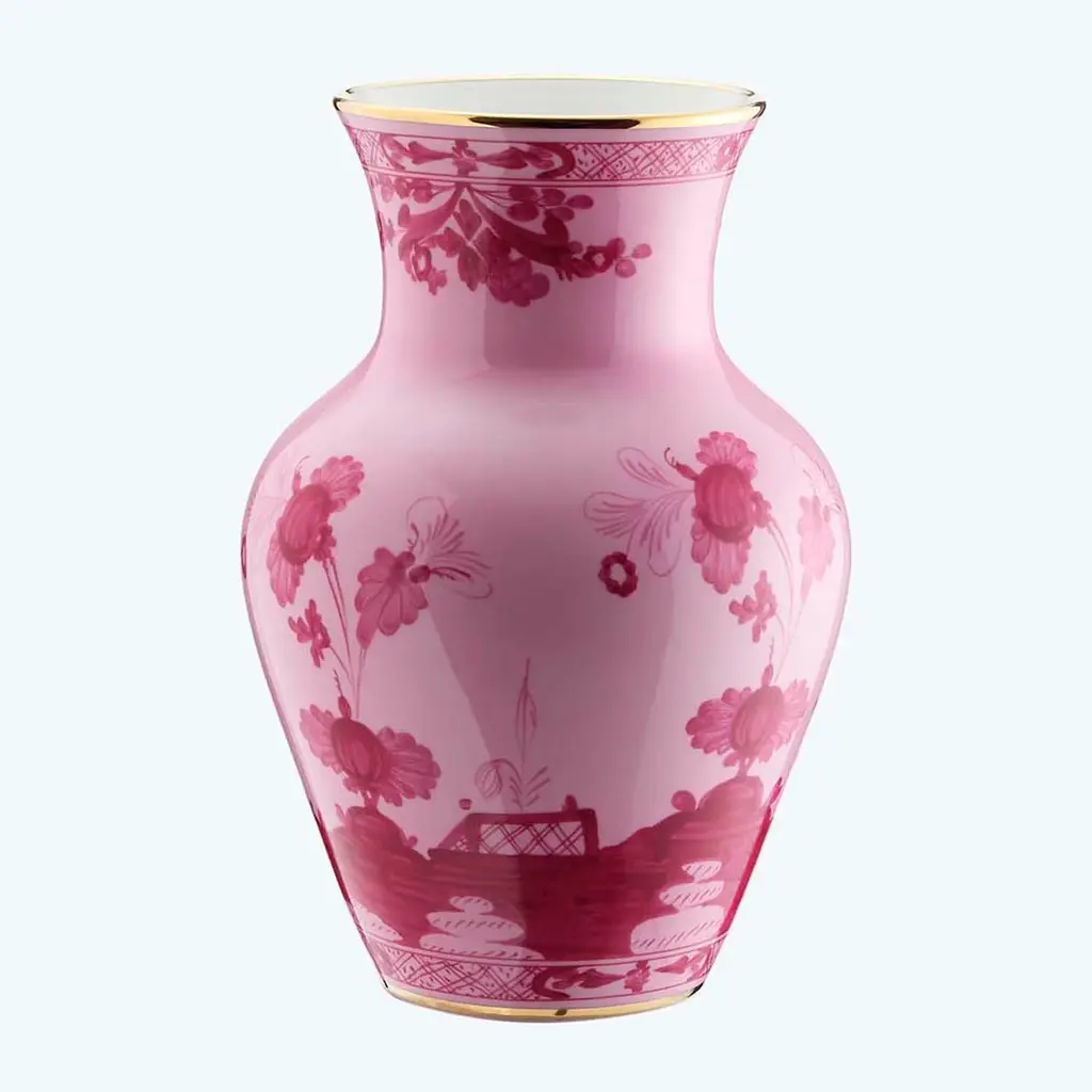 The Oriente Italiano Ming Vase by Ginori 1735 is an object of enduring beauty and exceptional craftsmanship. Made in fine porcelain by Italian artisans and inspired by ancient Asian floral motifs, this stunning vase features a hand-painted gold edge and delicate blossoms that follow the curves of its elegant silhouette. An exquisite addition to any home. Available in shades of Pervinca,Porpora, and Iris Gold.