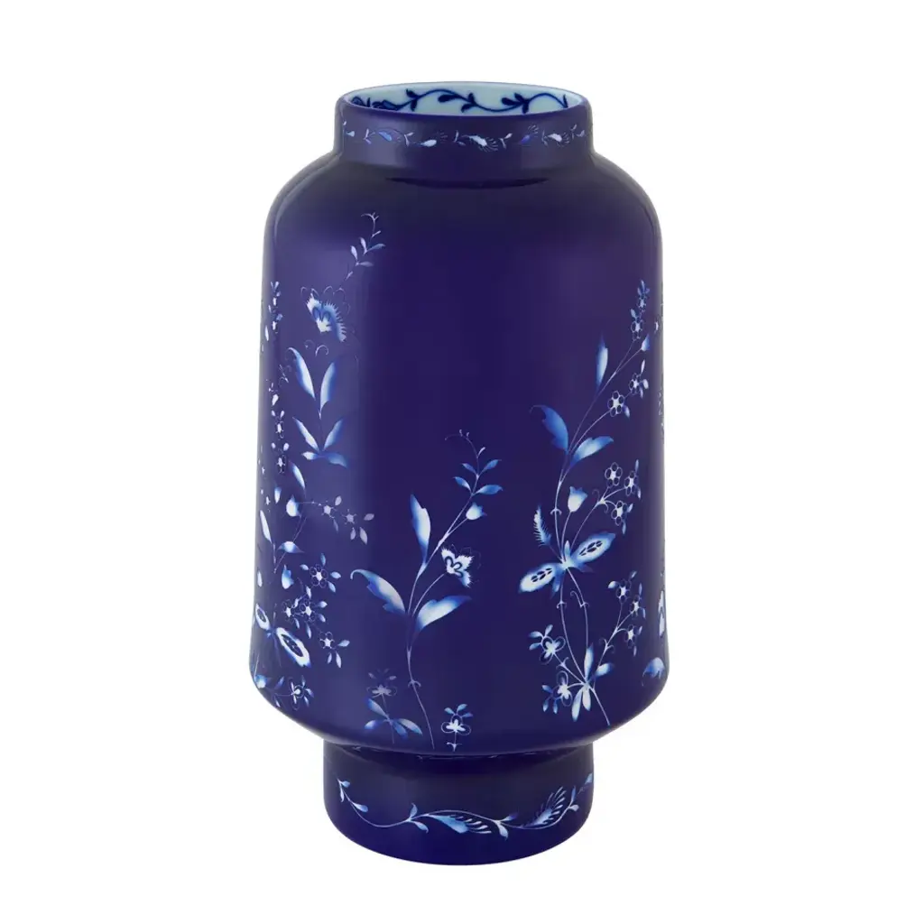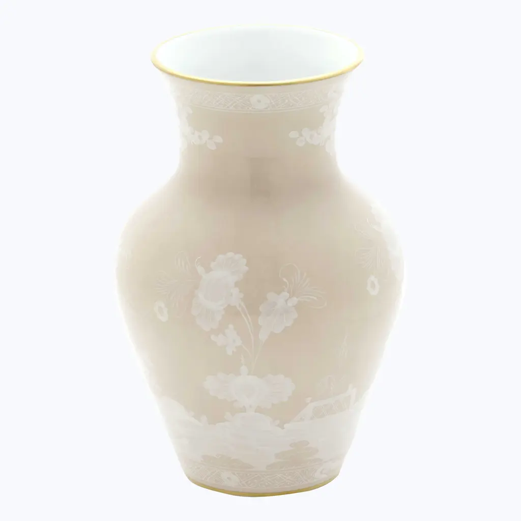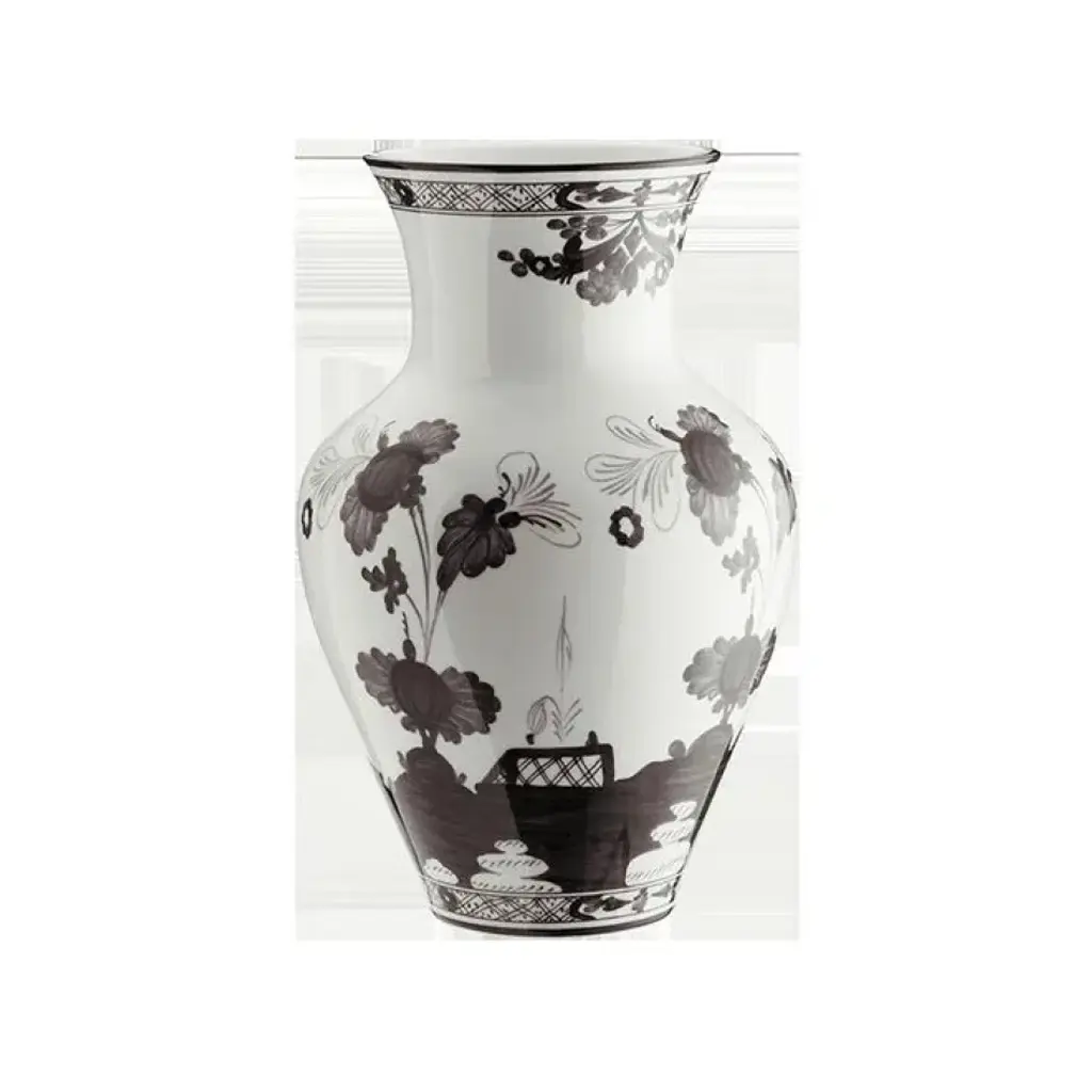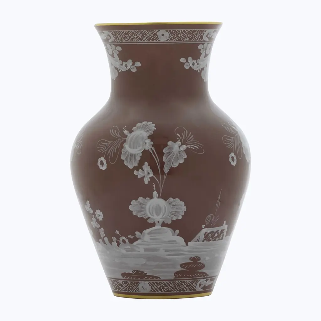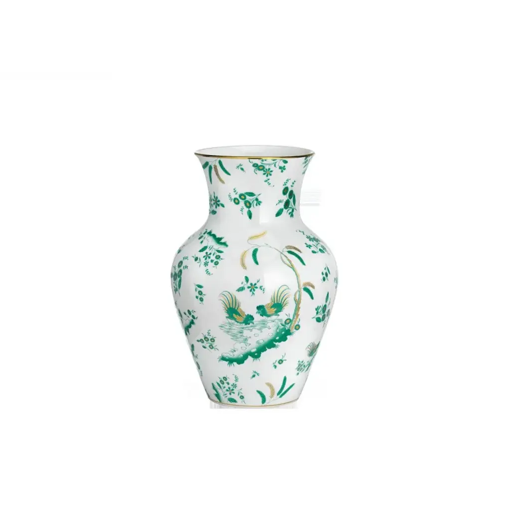 The Oriente Italiano Ming Vase by Ginori 1735 is an object of enduring beauty and exceptional craftsmanship. Made in fine porcelain by Italian artisans and inspired by ancient Asian floral motifs, this stunning vase features a hand-painted gold edge and delicate blossoms that follow the curves of its elegant silhouette. An exquisite addition to any home. Available in shades of Pervinca,Porpora, and Iris Gold.