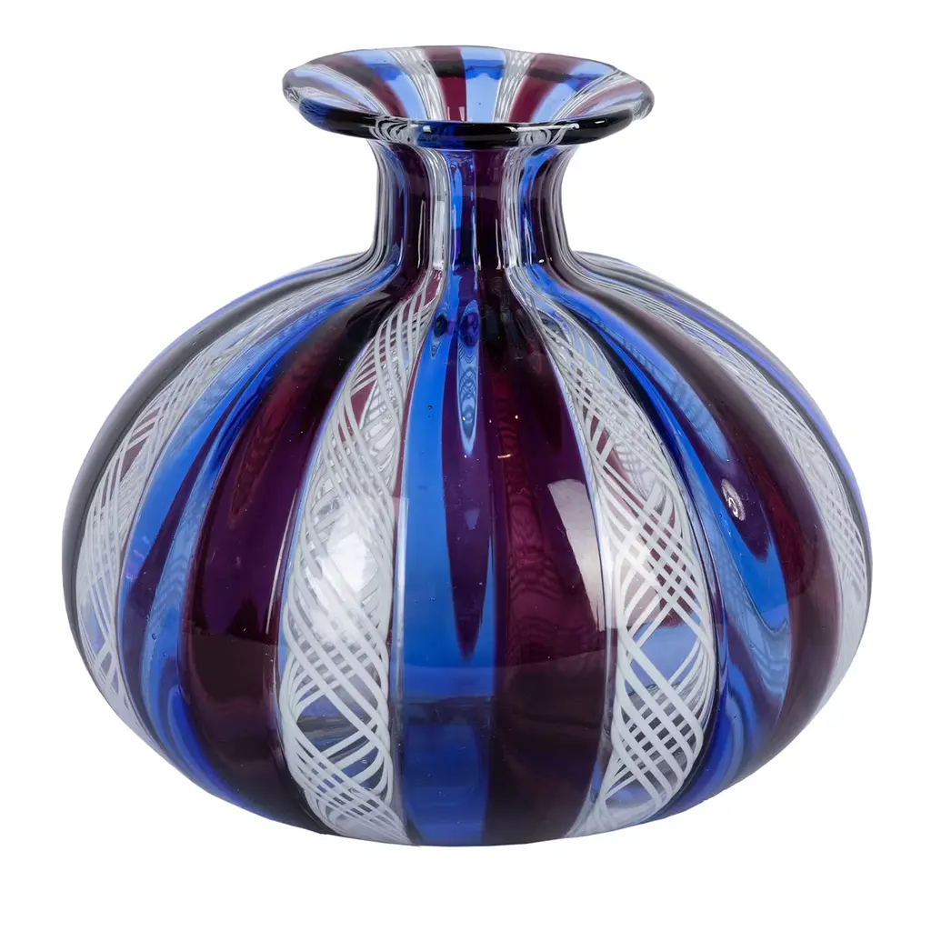 Carlo Moretti Orion Murano contemporary mouth blown Murano glass vase in clear with blue and red swirls.Part of the I Piccoli collection, small objects in size but give considerable cause for reflection, small but precious;. All the objects are limited edition, signed, dated, numbered and delivered with a “Certificate of Authenticity.”Carlo Moretti: An artisan factoryStrolling afoot through the foundations of Murano, the visitor provided with refined sensitivity, lost in a myriad of gift shops and restaurants duly arranged for mass tourism, would find himself unpleasantly surprised. Fortunately, with the aid of specific information and a brisk curiosity, she or he would come to discover a genuine artisan factory. The artisan factory bearing Carlo Moretti’s trademark.Established in 1958 by Carlo and Giovanni Moretti, it represents a unique occurrence on the island of glass, mingling entrepreneurship and authorship in the works of art created in their furnace with the close collaboration of glass masters.For over 50 years, the firm founded by the Moretti brothers has drawn the attention of the international market due to its distinctive formula, which merges the centennial craftsmanship of the island’s glass masters (handed down from father to son) with contemporary Italian design.When talking about glass, Carlo and Giovanni Moretti use a completely new language. Perhaps because they had to step up to the challenge when they were still very young, provided with that peculiar technical background which only a century-long family tradition and the artistic fertility of a place like Murano can hand down.Starting from the beginning of the 1970s, the production of the Carlo Moretti firm took a distance from the historic practice of working glass, confronting itself with a much broader horizon in which the expressive value of form is newly acknowledged.Thus the quest for new shapes, clean and essential, and the research in technical innovation, with an experimental approach both in the use of components – to obtain a highly transparent top quality glass – and in the contrivance of the most appropriate working tools. The firm’s distinctive traits.The culture of the beautiful and the essential, found in the Moretti glass production, stems from the great curiosity and attention dedicated to what lies beyond the island’s limited confines.The sources of inspiration are countless, from the colors of the lagoon to the most highly advanced human inventions. Then, there is the uninterrupted daily exchange between two different personalities having distinct fields of competence: Carlo, mainly devoted to design, teamed up with his brother Giovanni for the ideation of new products, incessantly interacts with the handicraft of the glass masters. New creations thus come to life, tangible proofs of the magical duality inherent to the substance used, which harbors two contradictory souls, a solid and a liquid one.“Cult” commodities for the table and the home, vases, chalices and glasses having the power to influence habits and tastes. Created in Murano crystal glass in limited number, mouth-blown, finished off by hand “in the air”, then signed one by one and provided with a certificate of authenticity. More and more dedicated to a public of art collectors, these objects have found their collocation in the most important world museums.Carlo Moretti is therefore an “artisan factory” – one of the few left in Murano – where creativity and strategic choices coincide in a personal and unmistakable trademark.