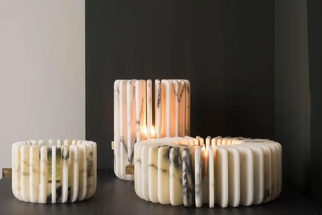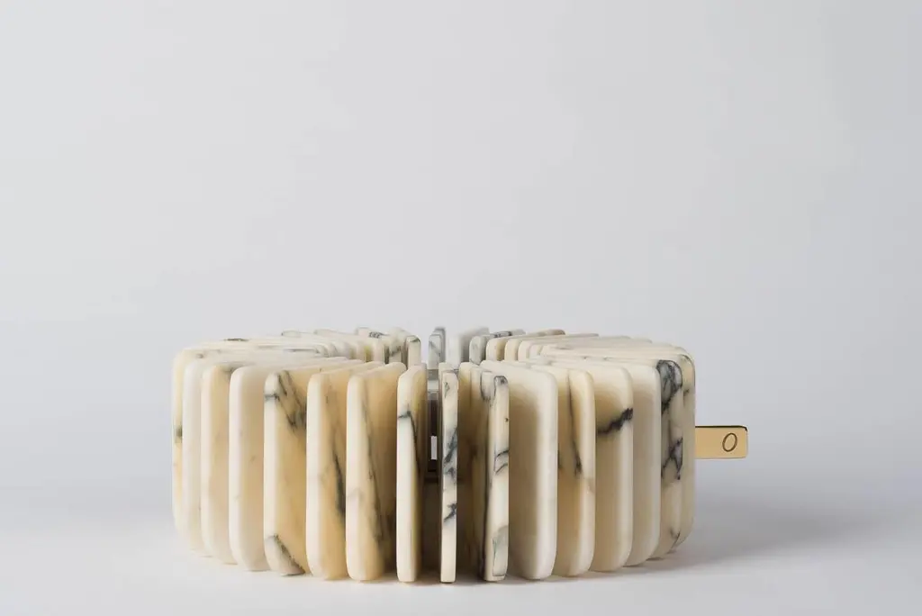 Orion opens new perspectives with the use of marble.With mechanical-like harmony , its delicate fins are meticulously set around a central element.Their shape highlights the fragility of the material and creates a subtle constrast of light and shadows around the object.When viewed from above, Orion has the appearance of a celestial body surrounded by marble rays.