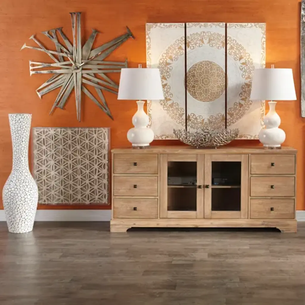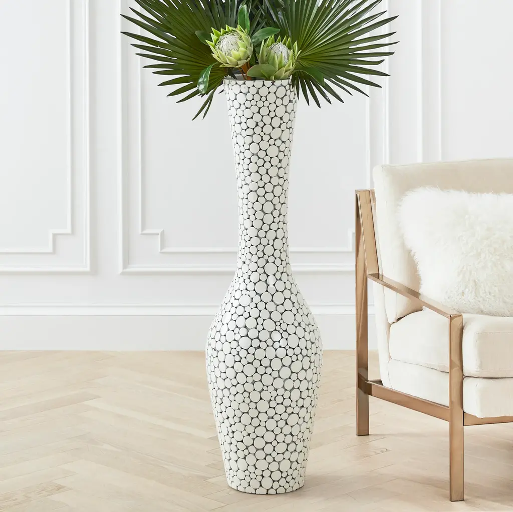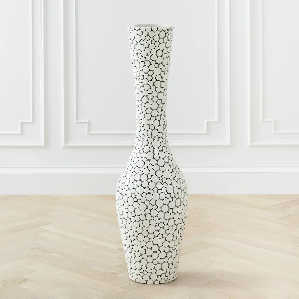 We’ve combined clean, contemporary design with the organic sensibility of natural materials to create our exclusive Oslo vase. The simple shape of the large vase is crafted in a base of fiberglass, with a hand-applied overlay of intricately arranged flat coin-shaped pieces of wood. A smart glossy White finish accents the modern appeal.
