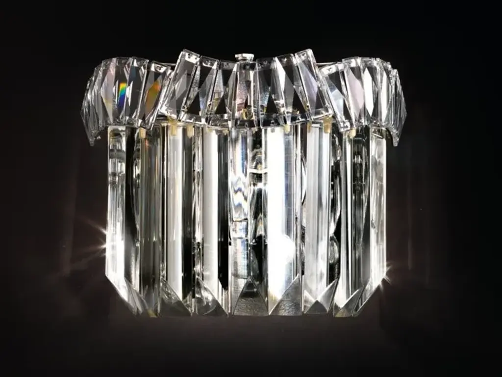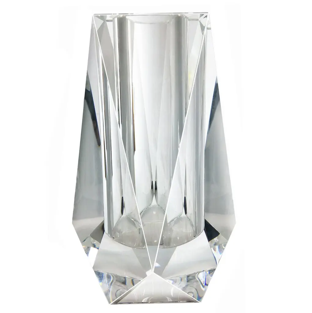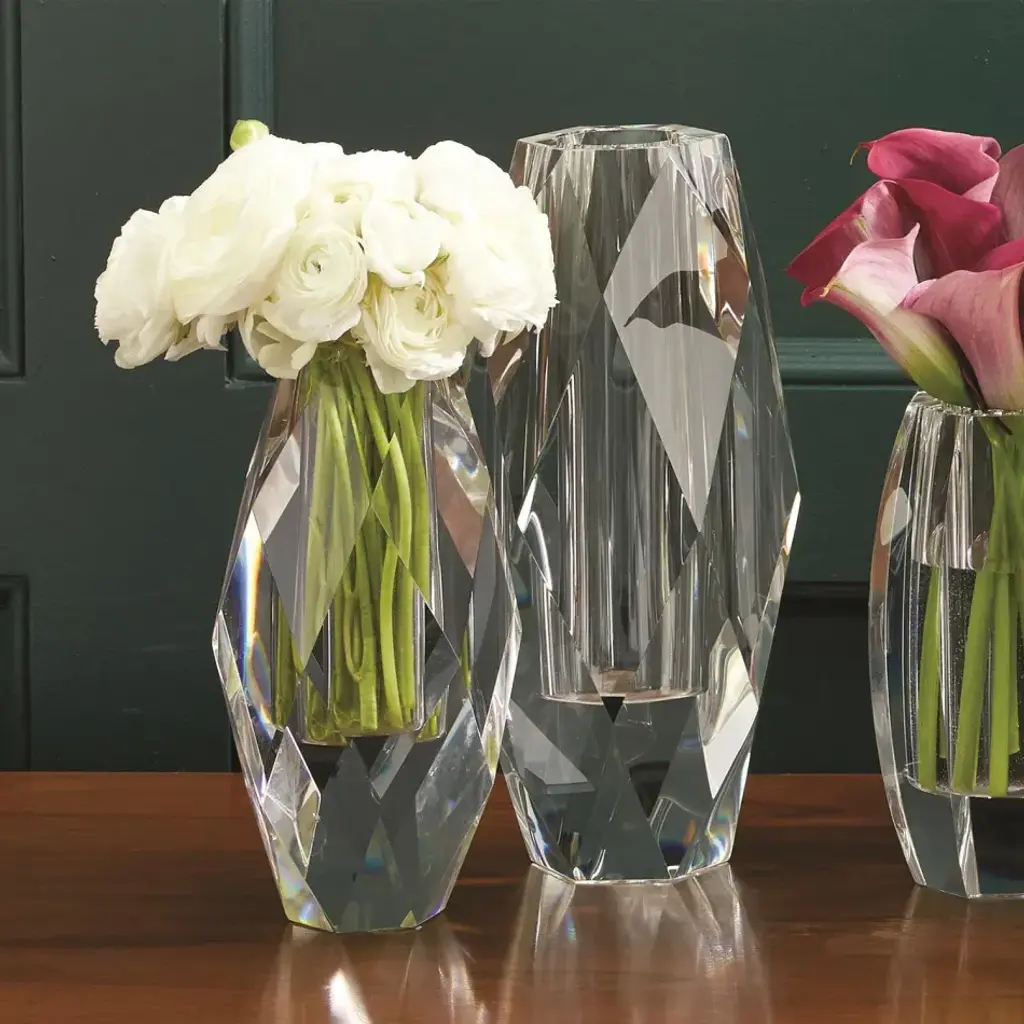Clear crystal is cut into diamond-like geometric shapes to create this unique vase. Fill it with your favorite flowers and notice how the organic shapes create a lovely juxtaposition with its clean lines.