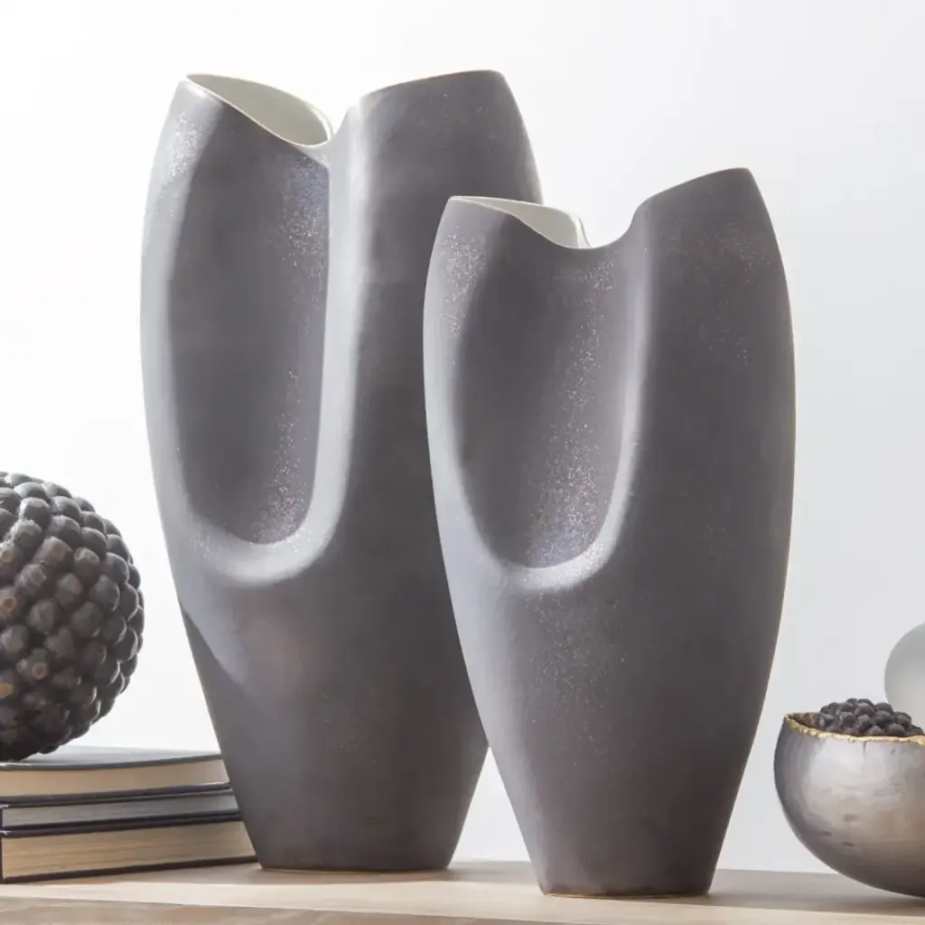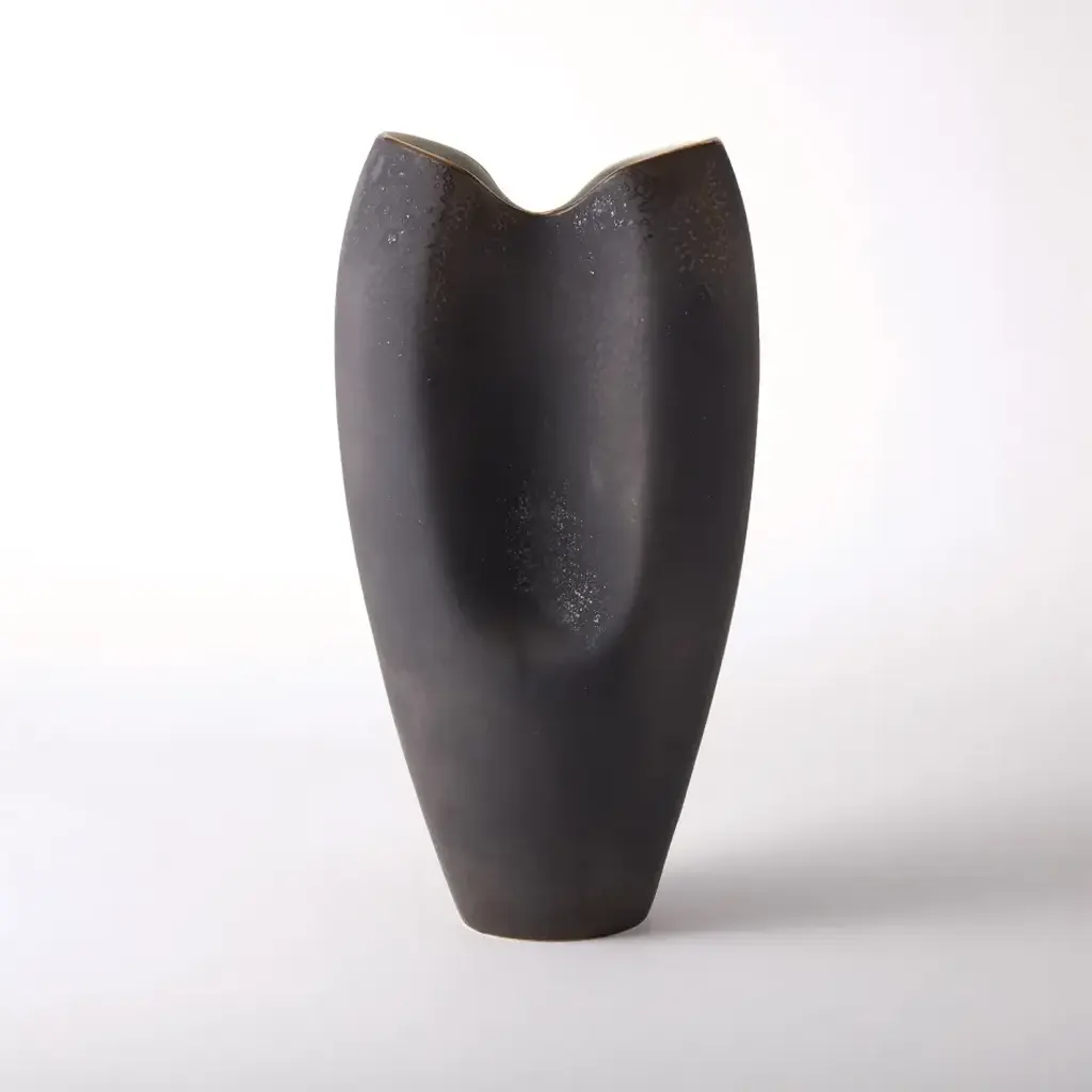 A highly reactive Raku-like glaze on porcelain. The intense reaction the glaze produces in the kiln creates random crystalline metallic areas on the bronze matte finish. No two are alike. Available in two sizes. From a fashion forward perspective, Global Views offers accessories, furniture, statement lighting, and an assortment of rugs and mirrors to add beauty and joy to your home.