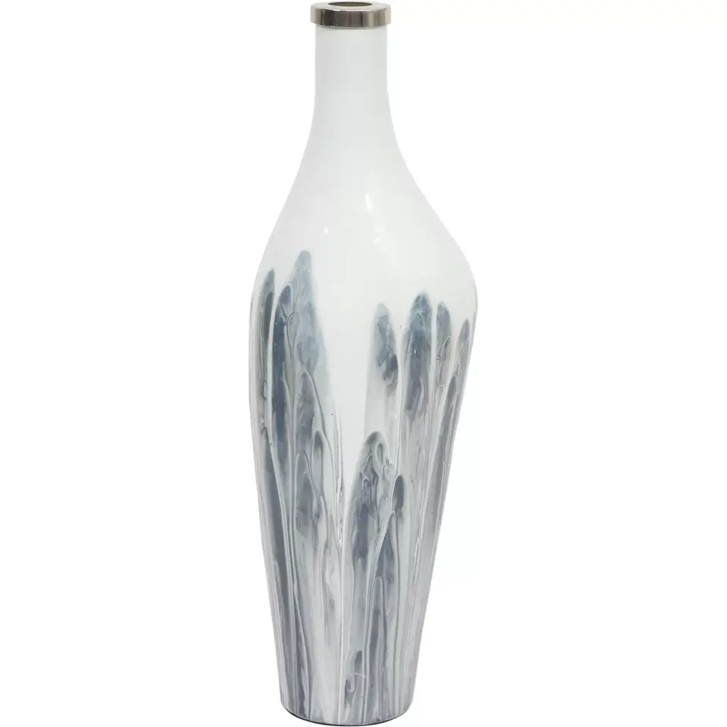 OYSTER SWIRL VASE IS A LARGE ENAMELED IRON VASE THAT FEATURES AN EYE CATCHING GOLD AND WHITE ABSTRACT OMBRE DESIGN. PROVIDE CHARM IN ANY ROOM BY ADDING CHERRY BLOSSOMS, PUSSY WILLOW BRANCHES OR TALL FAUX FLOWERS.