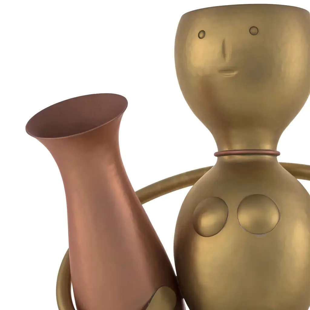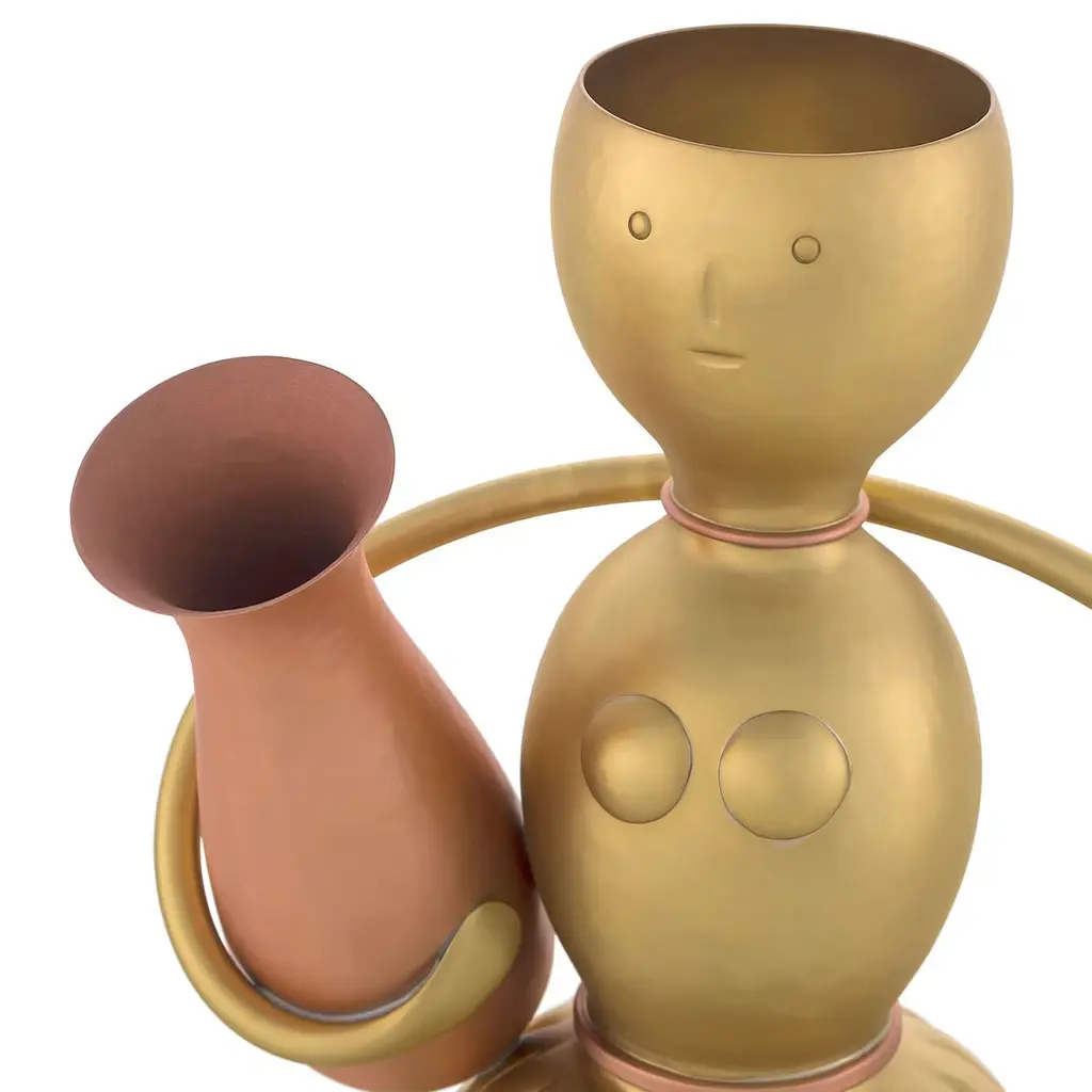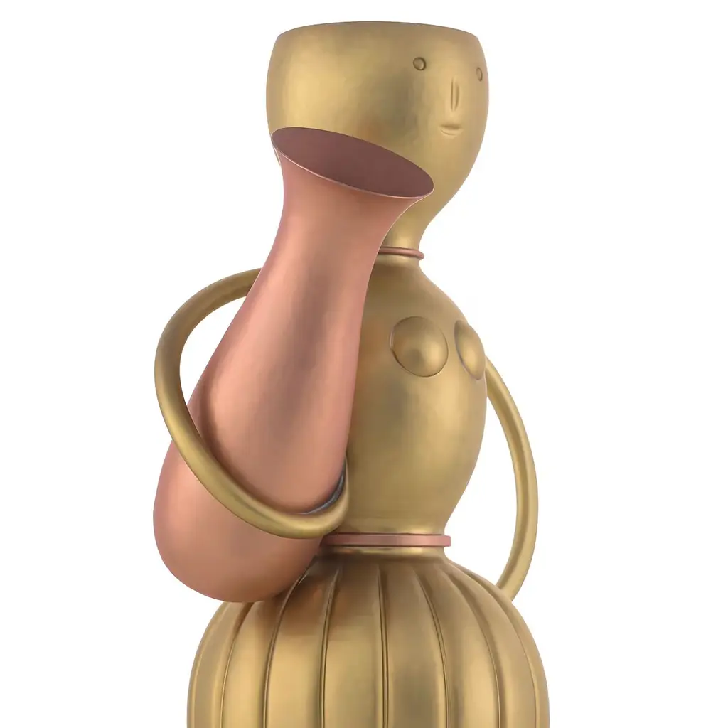 This striking vase is part of a limited series of only twelve pieces that pay homage to Pablo Picasso. Its woman-like forms are made in brass and their sinuous shapes evoke the poetic simplicity of the great painter's works. The arms and the charming vase that the woman carries are made in copper and create a playful addition to this piece that can also be used as a vase, thanks to the practical opening on the half-spherical head.