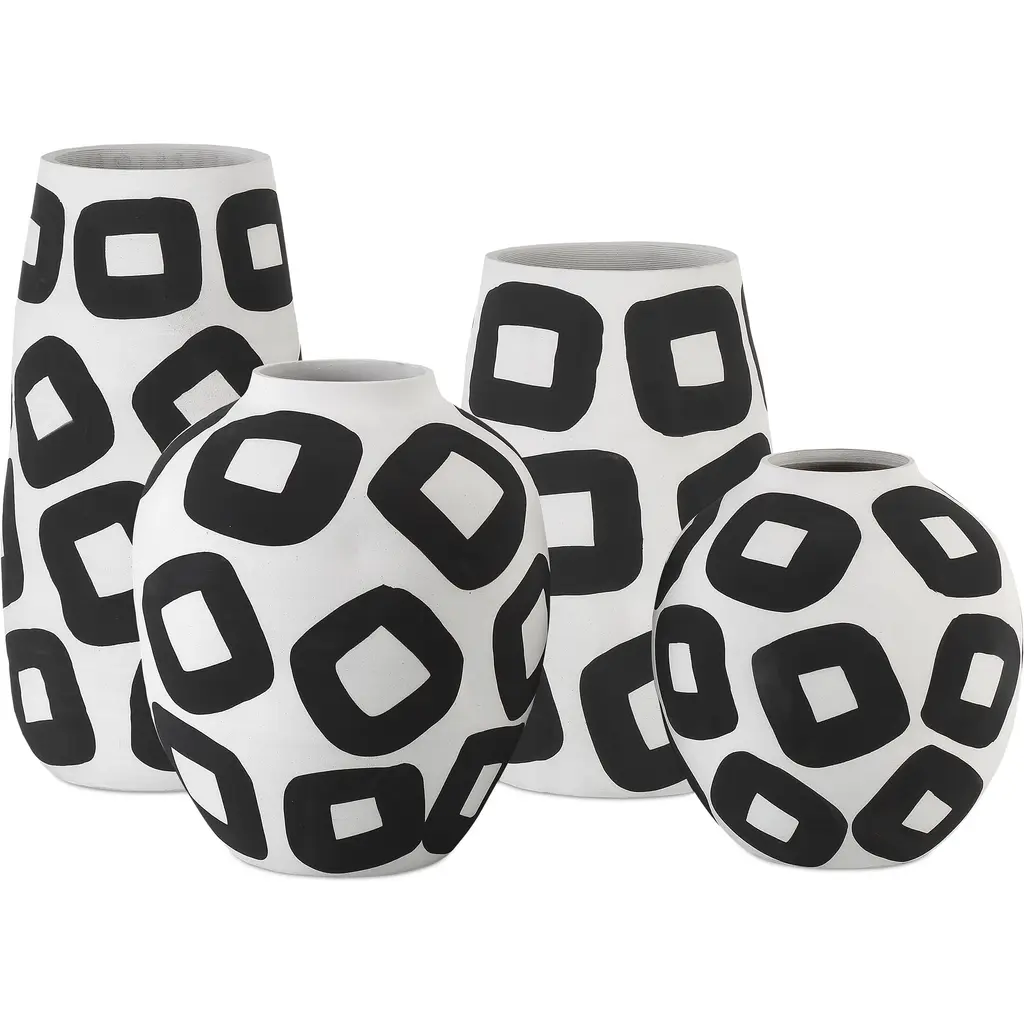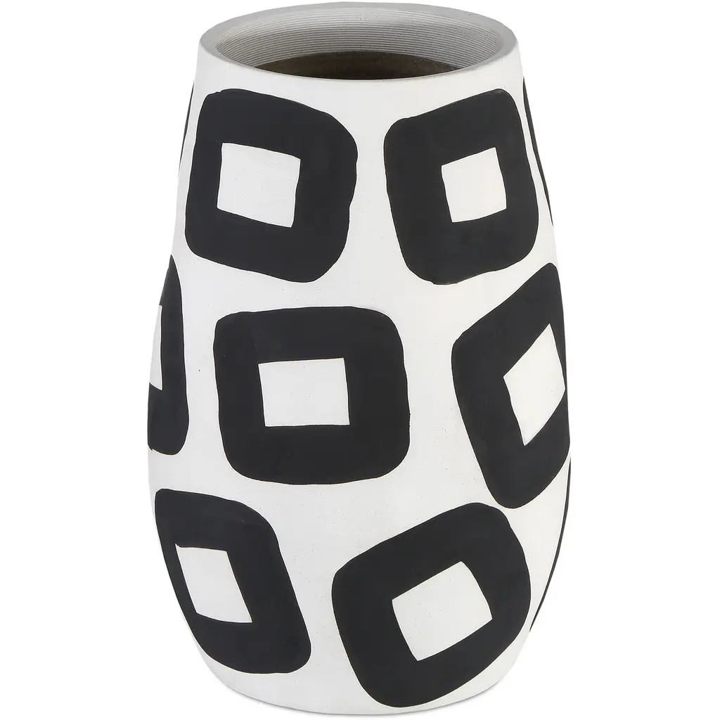 The Pagliacci Large Vase is made of the finest porcelain in a dynamic matte white finish onto which black contemporized lozenges with negative spaces in the middle are painted. The hollow centers bring extra power to the black and white vase, which makes the decorative accessory perfect for interior styles from contemporary to mid-century modern and transitional. From its place on a shelf or atop a stack of coffee table books on a foyer table, it will be a dynamic artistic piece.