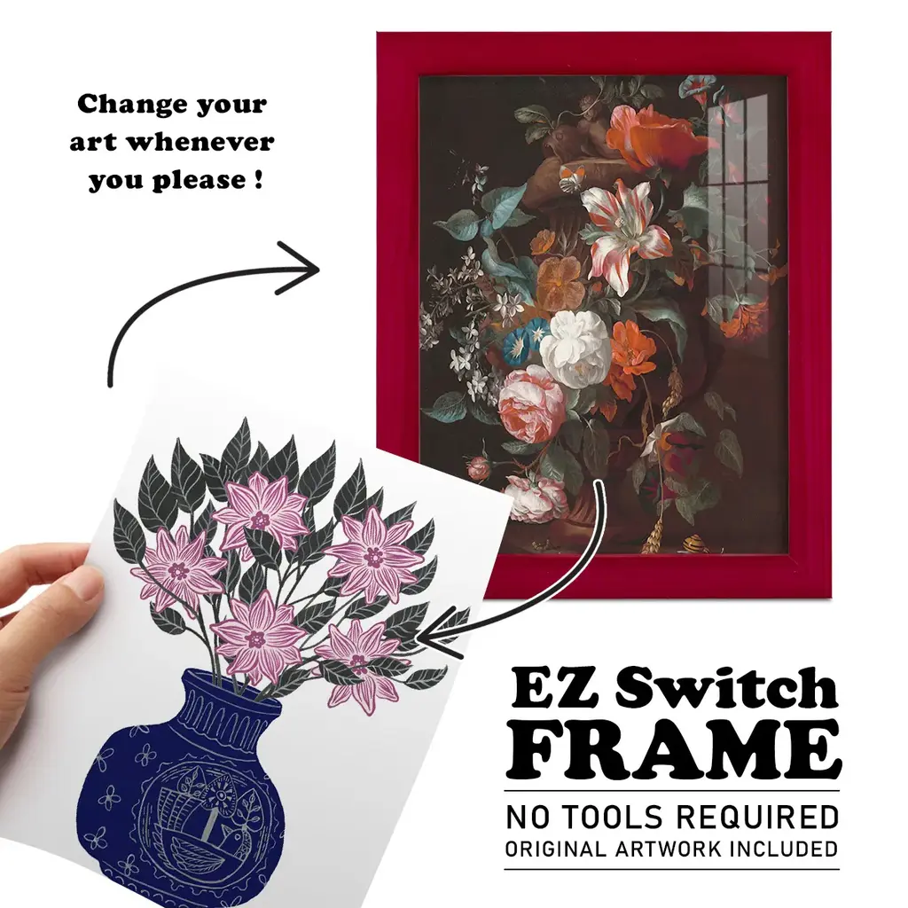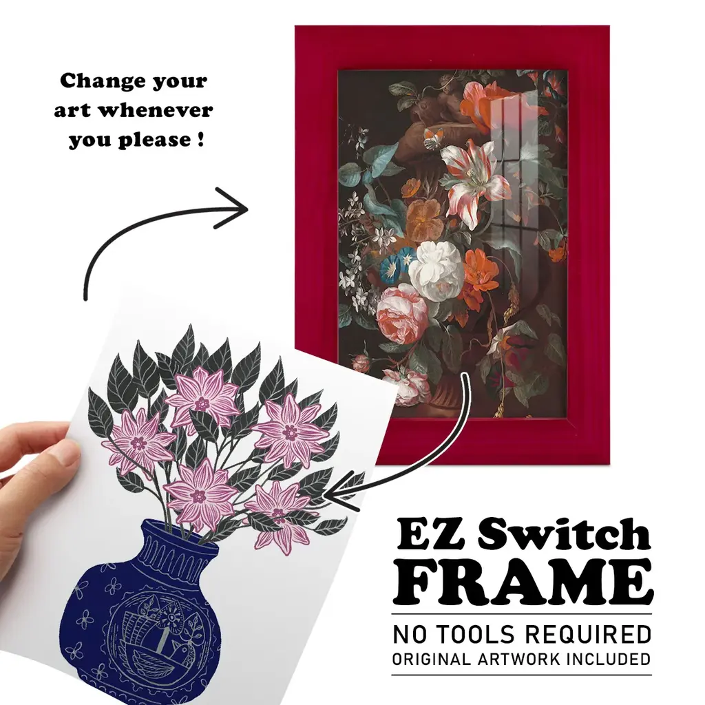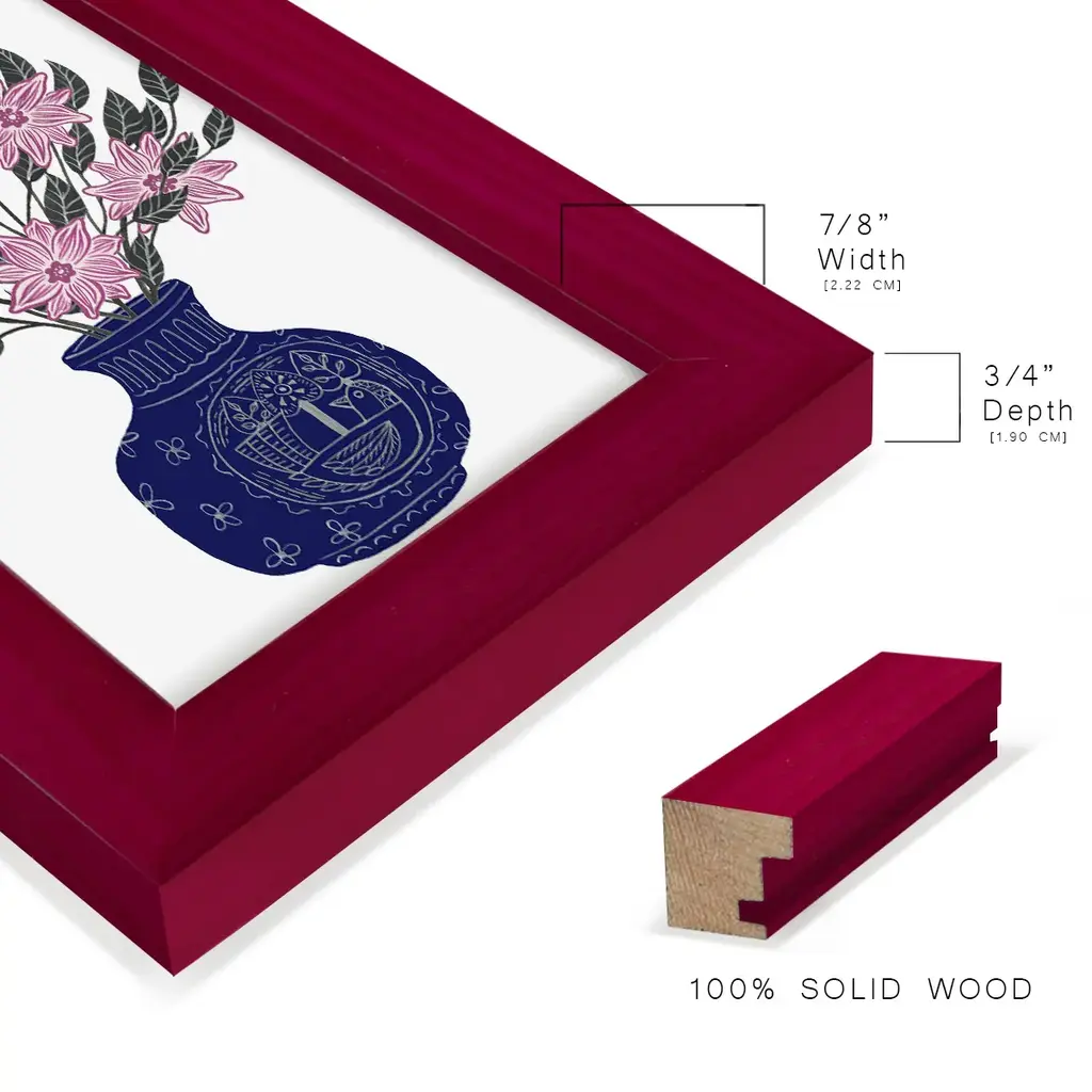 Painted Vase II -EZ SWITCH Framed Print w/glass-Cherry Red A delightful, framed print. Featuring a solid wood frame with real wood glass. This premium print is giclee quality. In addition, every frame features a removable back and table top stand. This allows you to change your art in the future or to just stand the art on a table for a new look. We are sure you'll enjoy our new series of EZ SWITCH Framed Art. Solid Wood Frame Real Glass Removable / Replaceable Art Built in Tabletop Stand Sizes range from 4x6 up to 12x15 - buy just one or pair them up as sets as you see fit.
