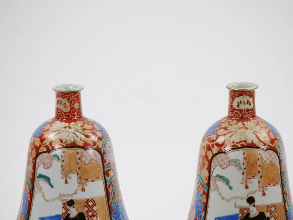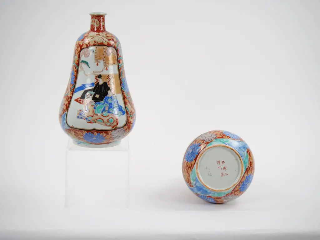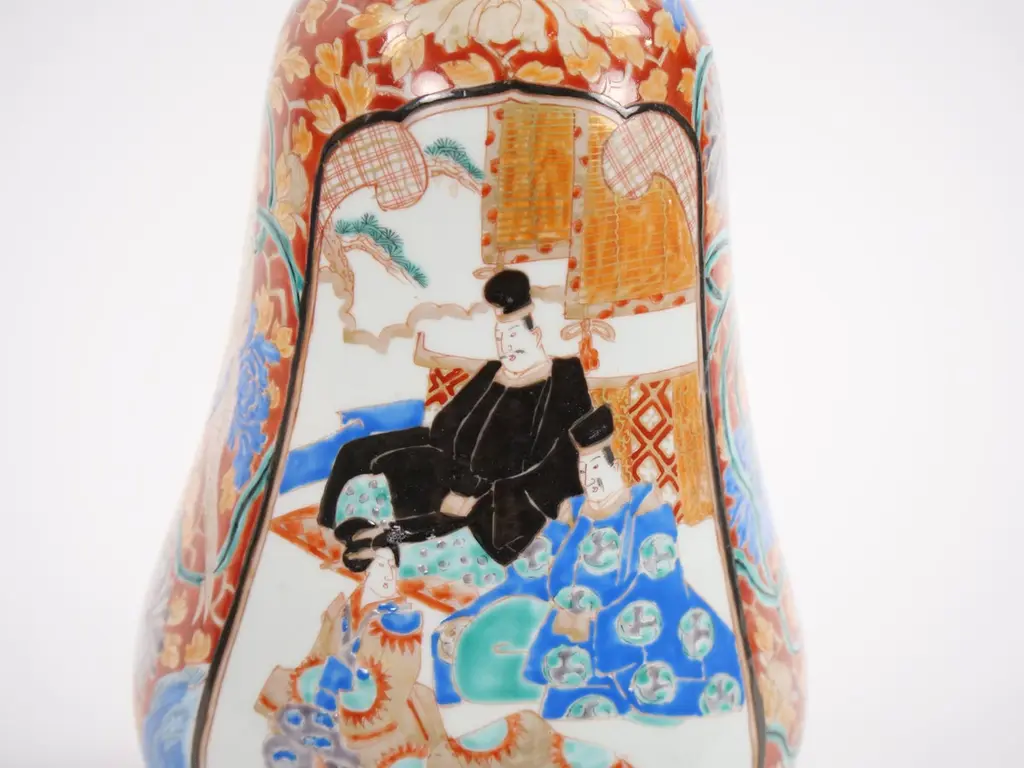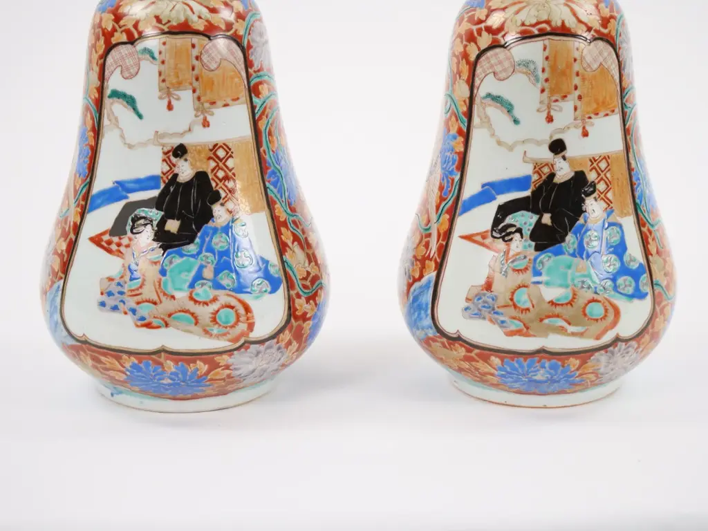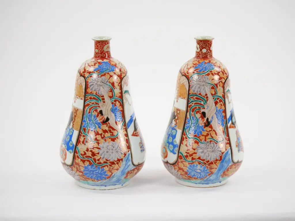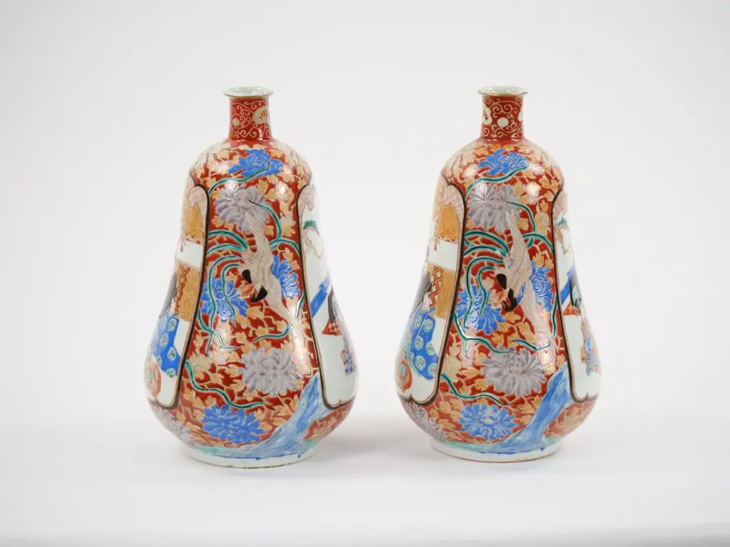Experience the captivating charm of Japan with this pair of Imari gourd-shaped porcelain vases. These vases beautifully showcase the renowned Imari style, which has captured hearts around the world for its intricate patterns and vibrant color palette.Crafted with exceptional artistry, each vase resembles a graceful gourd, with its unique curves and contours adding to the visual appeal. The Imari patterns, characterized by rich cobalt blues, fiery reds, and brilliant gold accents, evoke a sense of Eastern elegance and cultural heritage.Imagine these vases adorning your space, becoming instant conversation pieces that encapsulate the beauty of Japanese craftsmanship. The harmonious blend of traditional forms and ornate designs creates an aesthetic that is both timeless and captivating.Whether displayed as a pair or showcased individually, these Imari porcelain vases transport you to a world where art and culture converge. Let their presence infuse your environment with the mystique of the Orient, celebrating the enduring appeal of Japanese porcelain and design.