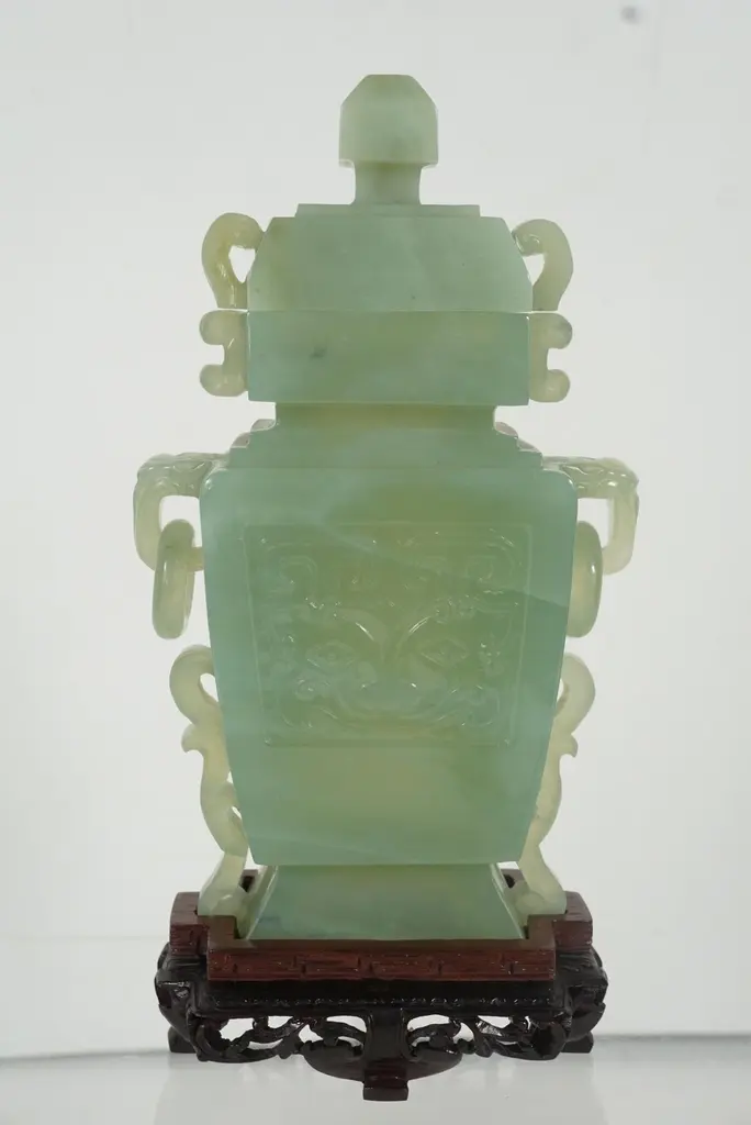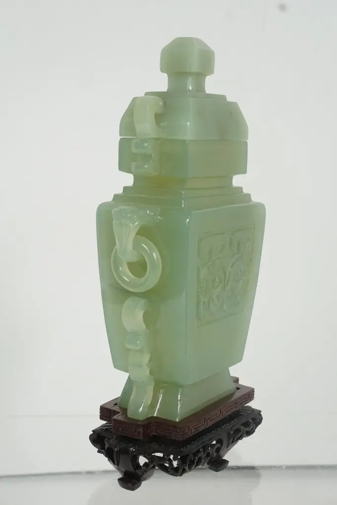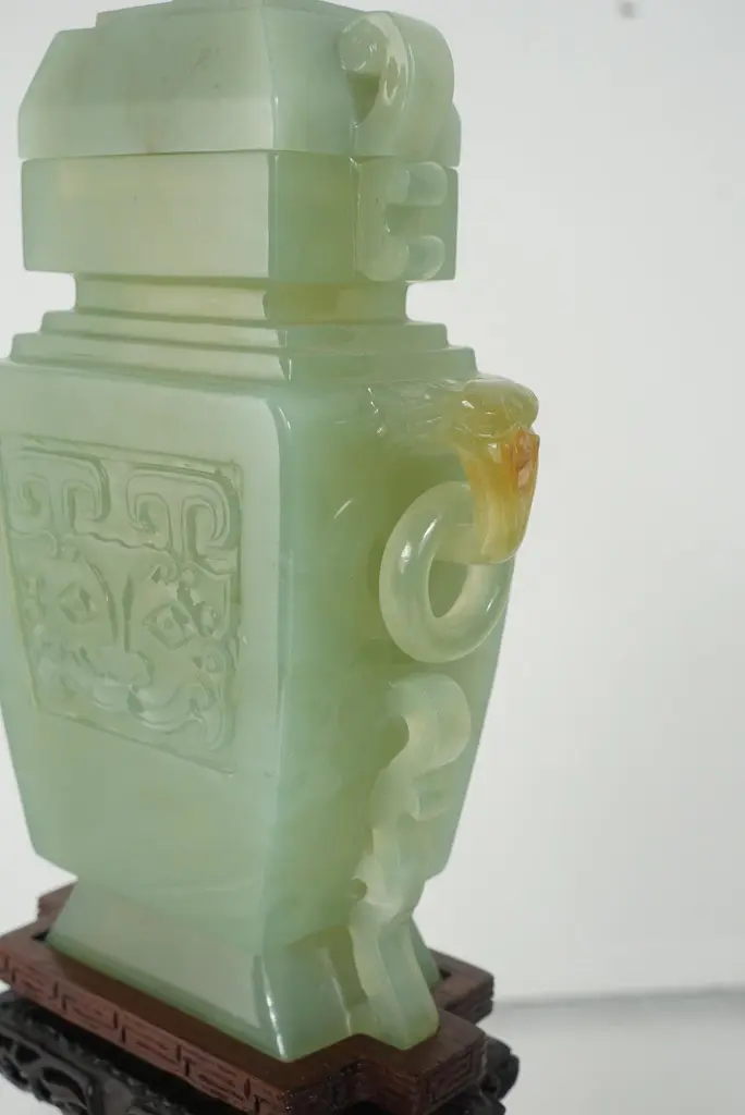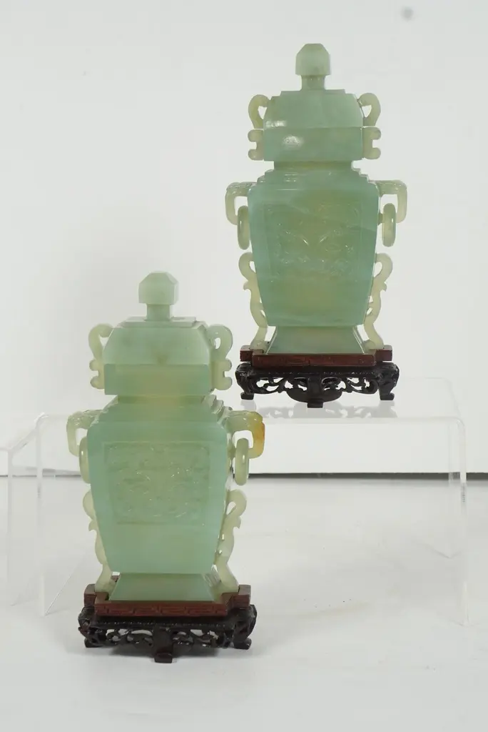 This nice pair of carved lidded urns are made form Bowenite which is considered a semiprecious stone and thought to resemble jade. They were carved in the mid 20th century and come with accompanying rosewood stands of fine Chinese design. They are centered on the body front and back with singular Toe Tia masks recessed into lozenged shaped areas. The mask a stylized representation of a mythical beast has been used in China since ancient times. The urns are designed as a flattened rectilinear baluster typical of the late 18th and 19th centuries found in jade carving and in porcelain of the time. Running down the sides of the urns are raised and open work ribbons divided by handles with elephant heads. From the handles are loose suspended rings. The stone is very clear and uniform with only very slight color changes or inclusions. This makes them very translucent and reflective.