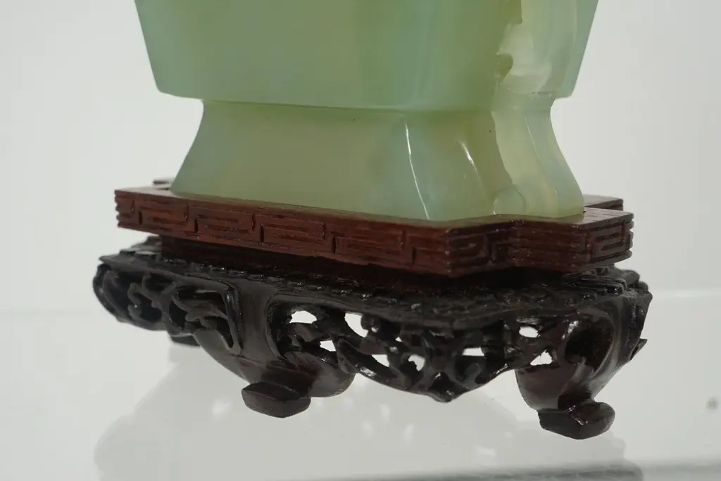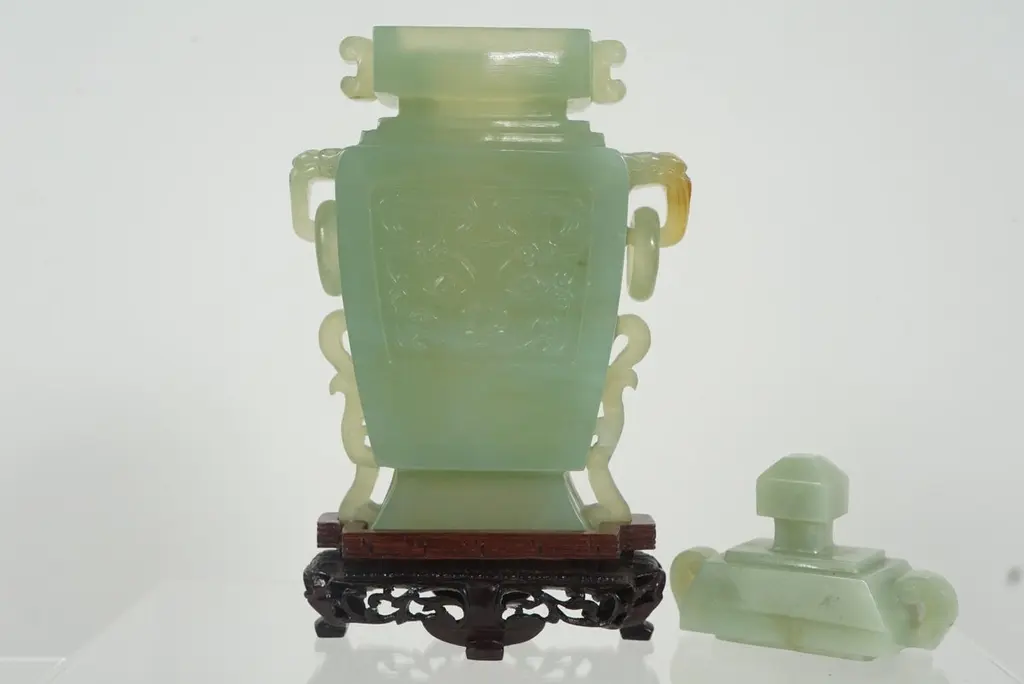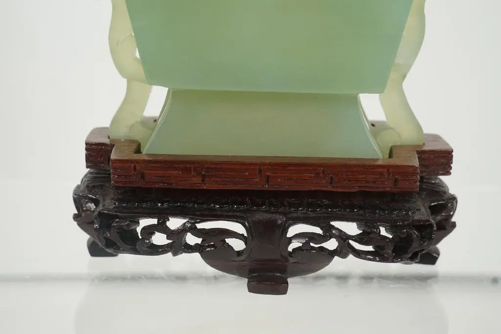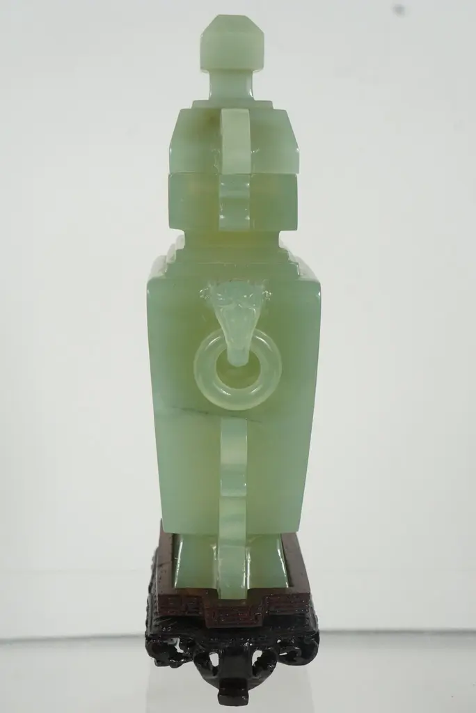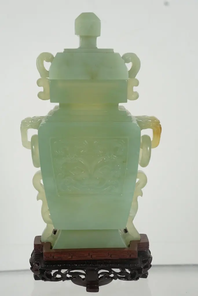 This nice pair of carved lidded urns are made form Bowenite which is considered a semiprecious stone and thought to resemble jade. They were carved in the mid 20th century and come with accompanying rosewood stands of fine Chinese design. They are centered on the body front and back with singular Toe Tia masks recessed into lozenged shaped areas. The mask a stylized representation of a mythical beast has been used in China since ancient times. The urns are designed as a flattened rectilinear baluster typical of the late 18th and 19th centuries found in jade carving and in porcelain of the time. Running down the sides of the urns are raised and open work ribbons divided by handles with elephant heads. From the handles are loose suspended rings. The stone is very clear and uniform with only very slight color changes or inclusions. This makes them very translucent and reflective.