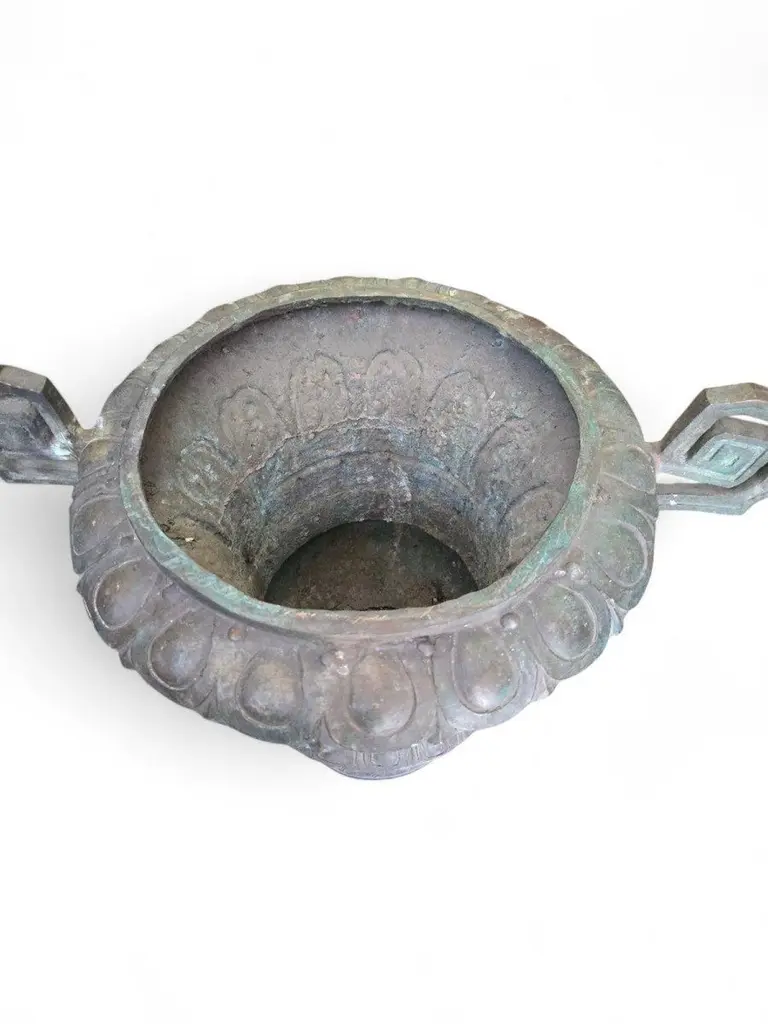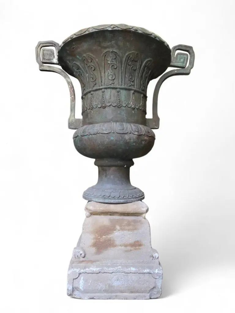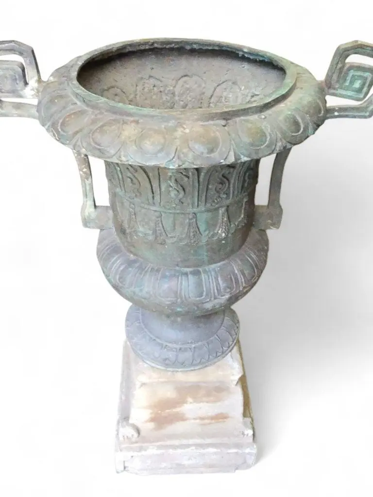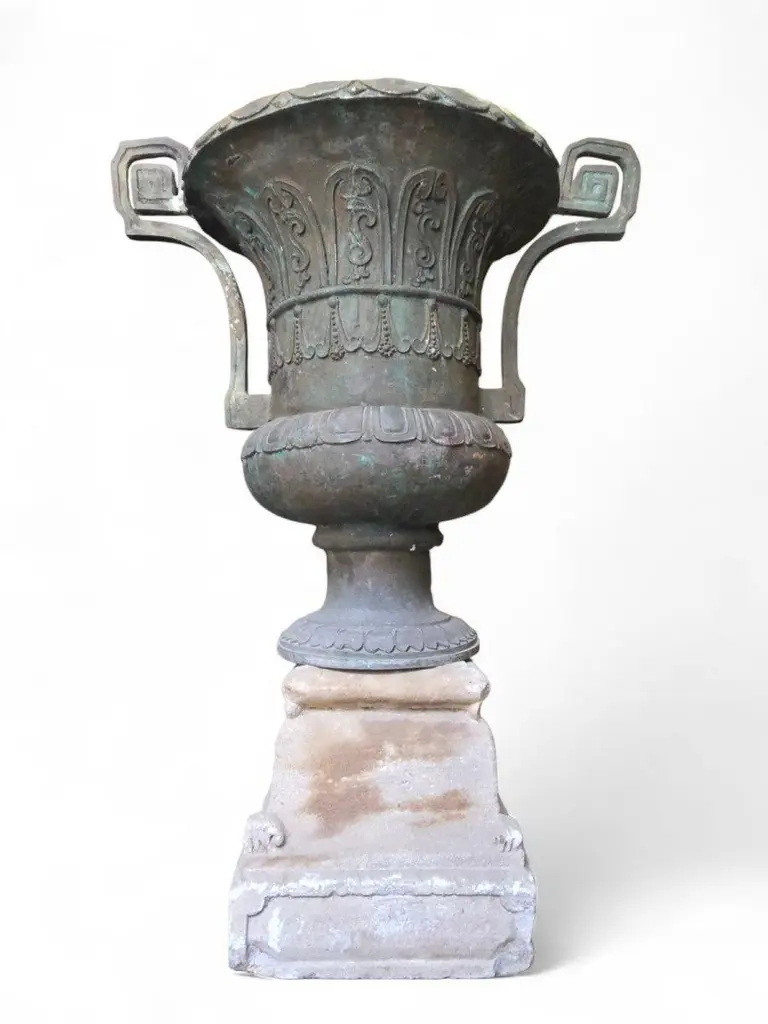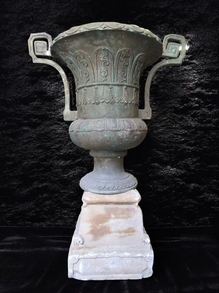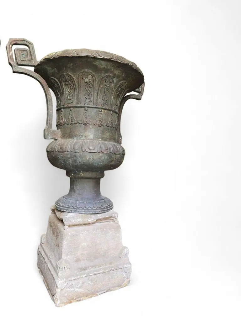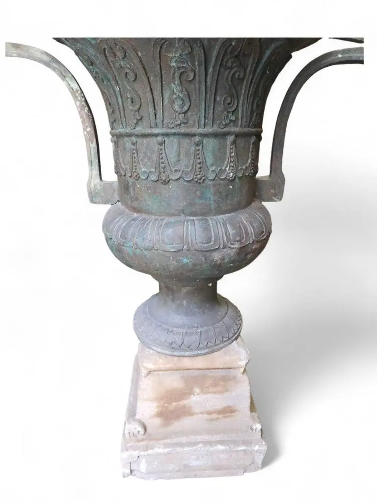 "PAIR OF ANTIQUE BRONZE GARDEN VASES – 19TH CENTURY"An imposing pair of palatial bronze garden vases, mounted on solid carved stoneware bases. These pieces are distinguished by their volume, ornamental elegance, and monumental character, evoking the classical motifs used in historic gardens and noble residences of the 19th century.The bronze possesses a natural patina, enhancing its authenticity and beauty. The carved stone bases provide stability and a refined contrast of materials, ideal for both landscaped exteriors and large interior spaces.Condition: Very good, with minor signs of age consistent with its age.Dimensions (with base): 115 x 80 x 55 cm
