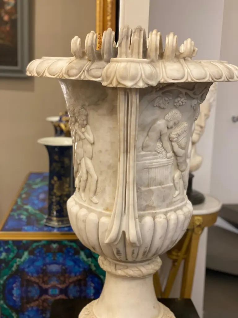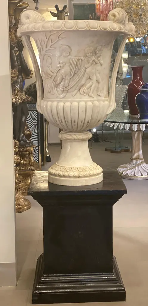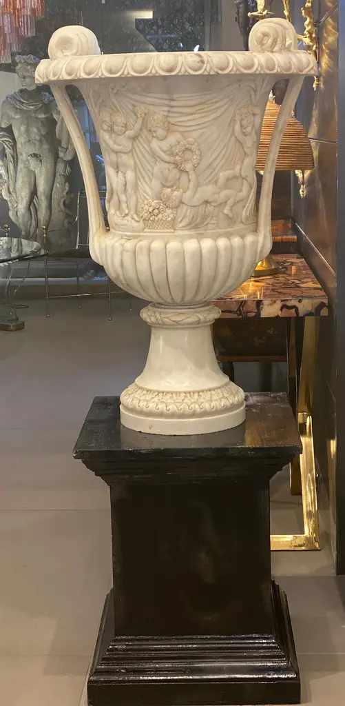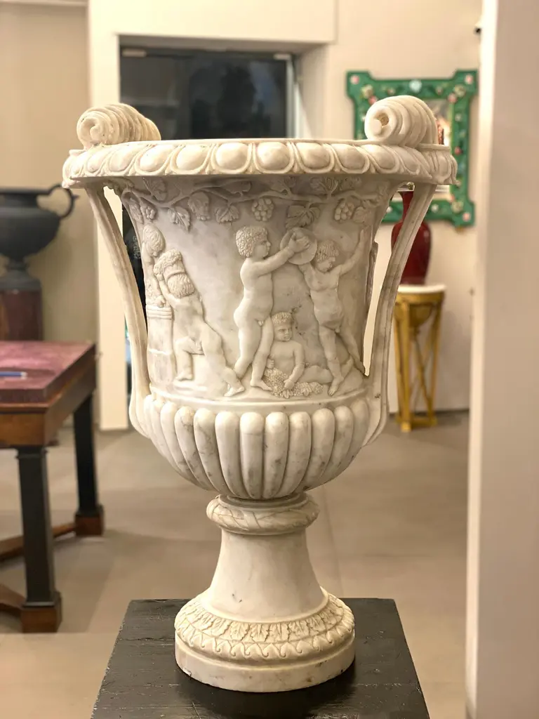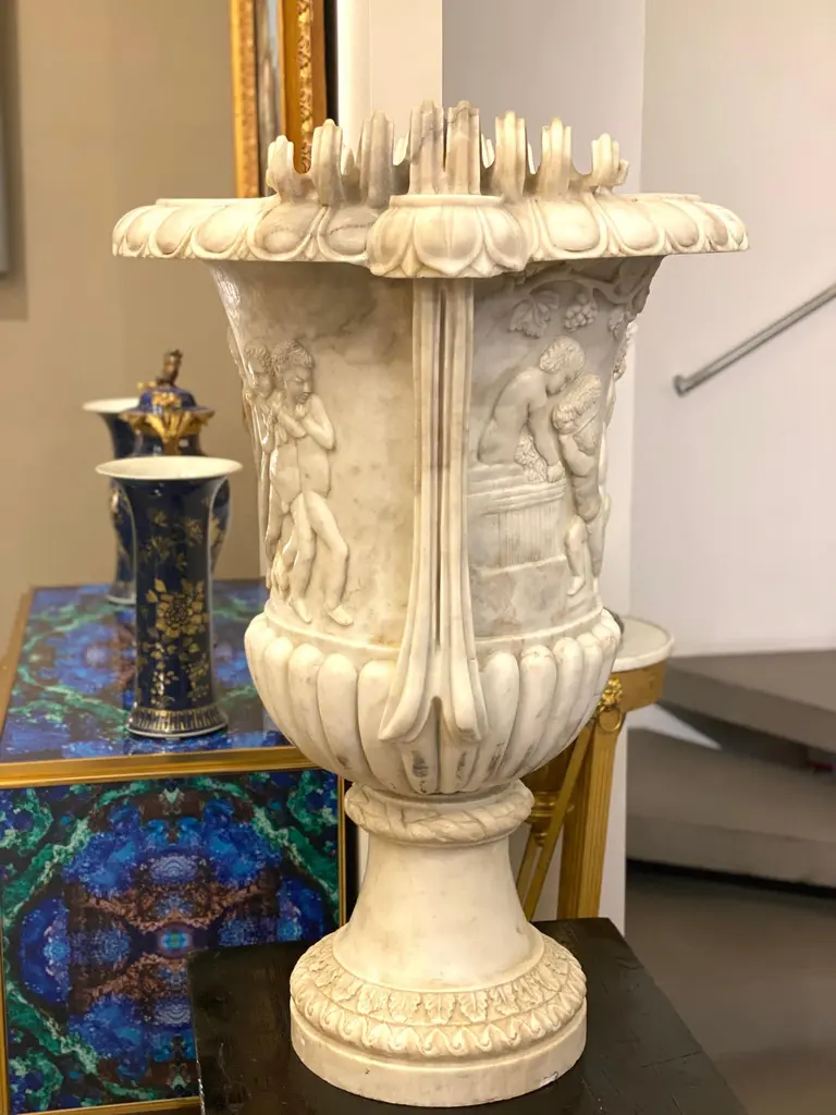 Exceptional pair of vases in the shape of a cantharus. From a foot with overlapping moldings like strips, woven ribbons and acanthus leaves, a smooth stem rises, tapering towards the top, with a crown knot of laurel leaves tied by ribbons. It has the saucer decorated with pods and the body decorated with a continuous bas-relief. The owl's beak hem is decorated with ovals and arrows; the double handles are connected to it by a collar, the ends of which, wrapped in spirals of decreasing size, rest on the upper part of the rim. Remarkable for its large size, for the classic beauty of its shape, for the intense purity of its white Carrara marble, and also by the very high quality of its décor, a basrelief on the Dionysian putto theme. The model, of which it is the copy made in the 18th century by Massimiliano Laboureur and Lorenzo Cardelli between 1783 and 1785, on the occasion of the renovation of the villa promoted by Marcantonio Borghese.Timeless decoration for you interior or garden.