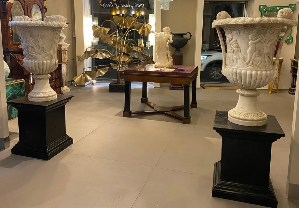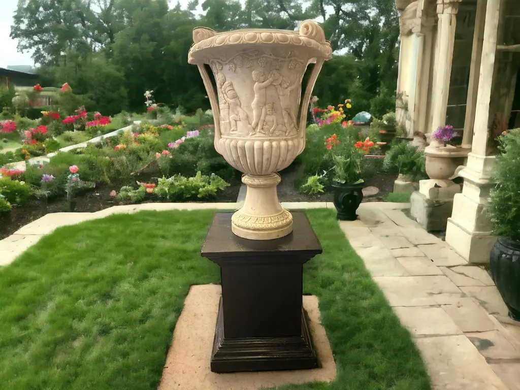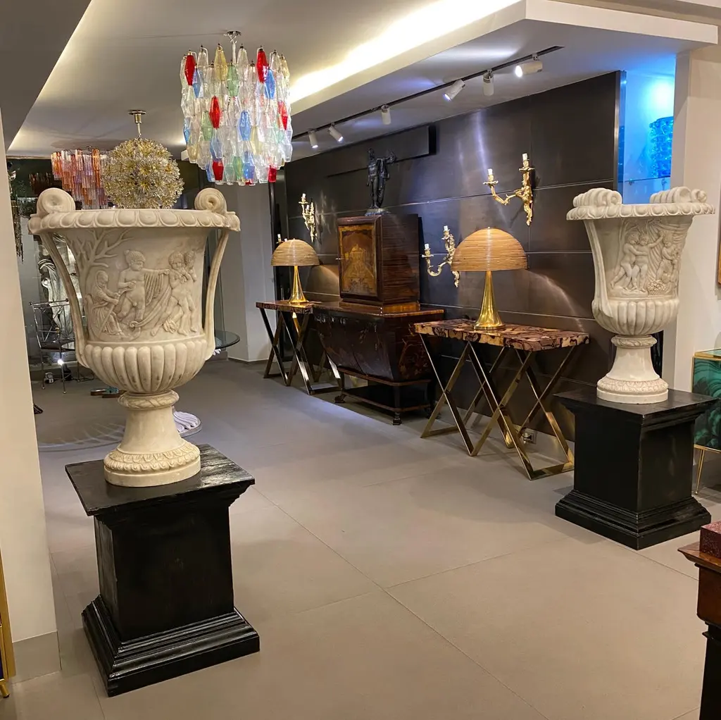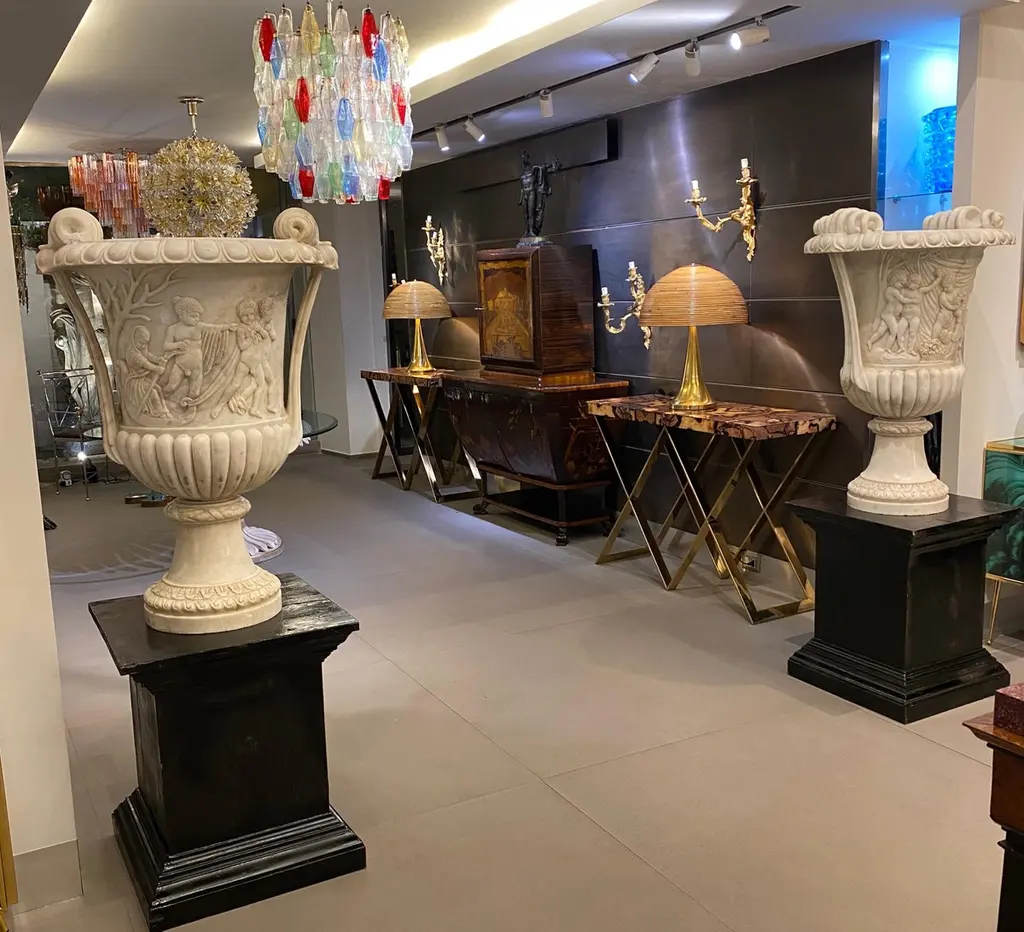 Exceptional pair of vases in the shape of a cantharus. From a foot with overlapping moldings like strips, woven ribbons and acanthus leaves, a smooth stem rises, tapering towards the top, with a crown knot of laurel leaves tied by ribbons. It has the saucer decorated with pods and the body decorated with a continuous bas-relief. The owl's beak hem is decorated with ovals and arrows; the double handles are connected to it by a collar, the ends of which, wrapped in spirals of decreasing size, rest on the upper part of the rim. Remarkable for its large size, for the classic beauty of its shape, for the intense purity of its white Carrara marble, and also by the very high quality of its décor, a basrelief on the Dionysian putto theme. The model, of which it is the copy made in the 18th century by Massimiliano Laboureur and Lorenzo Cardelli between 1783 and 1785, on the occasion of the renovation of the villa promoted by Marcantonio Borghese.Timeless decoration for you interior or garden.