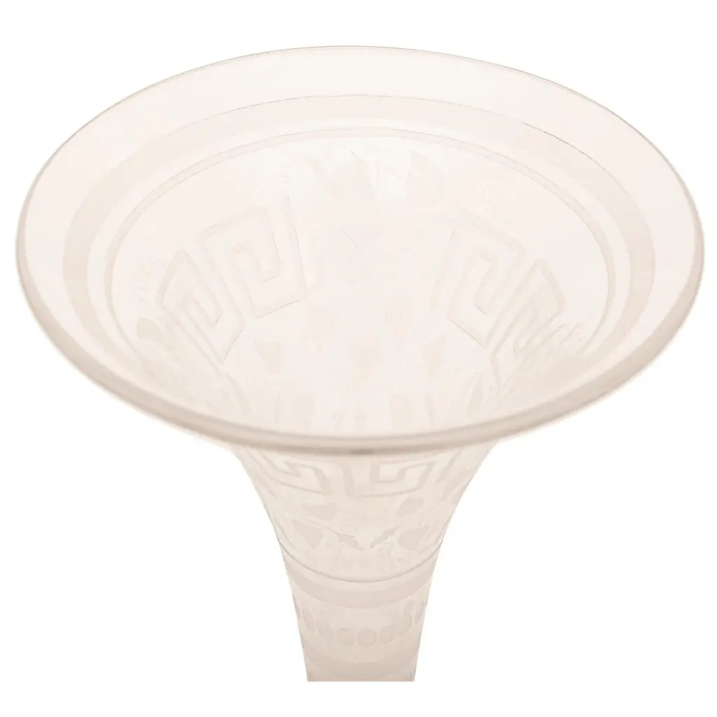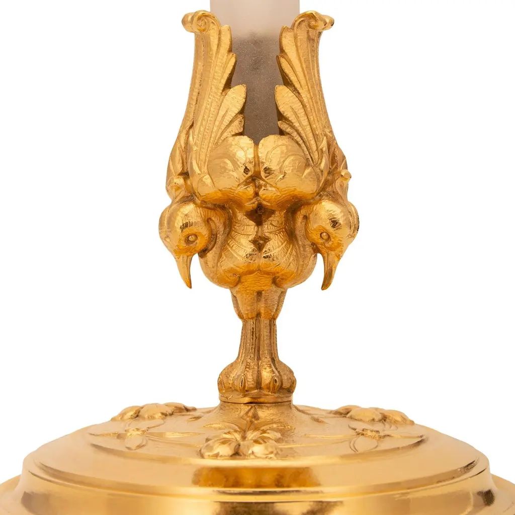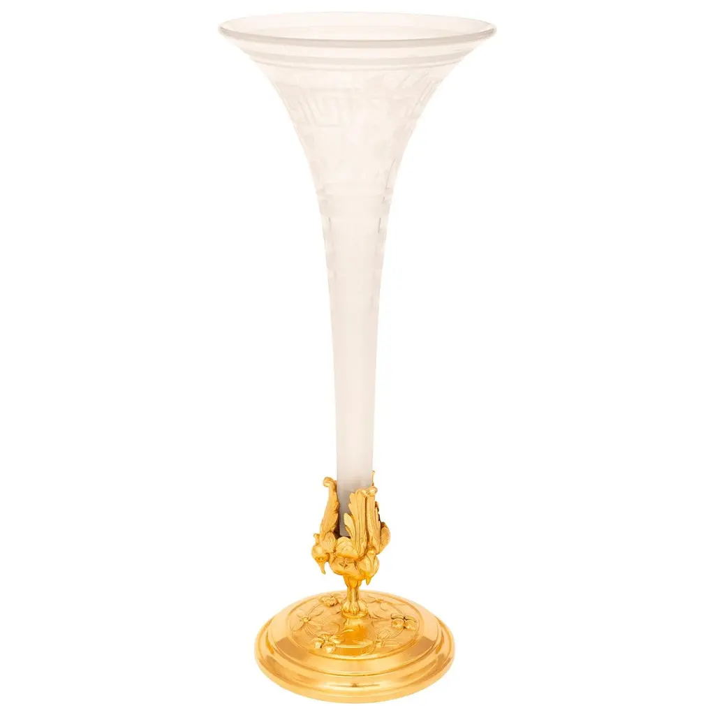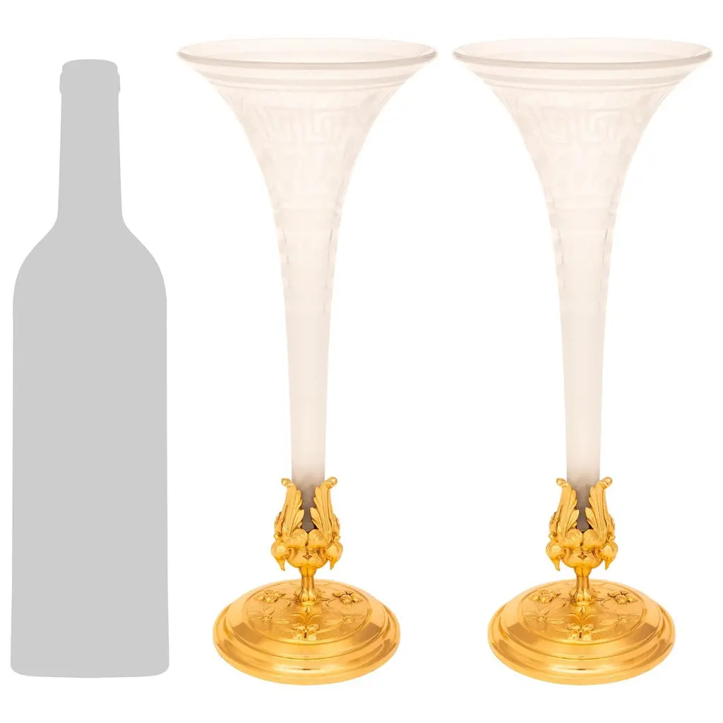 A slender and most elegant pair of French 19th century Louis XVI st. Ormolu and etched Crystal vases. Each stunning vase is raised on a circular Ormolu base with mottled bands below a hammered background accented by bows and rosettes. A trio of exquisitely detailed birds of prey creates a stunning reserve which holds the etched Crystal vase above. The tapered Crystal vases are delicately etched with Greek Key, grape vine, grape leaf designs at the midsection of each flute.