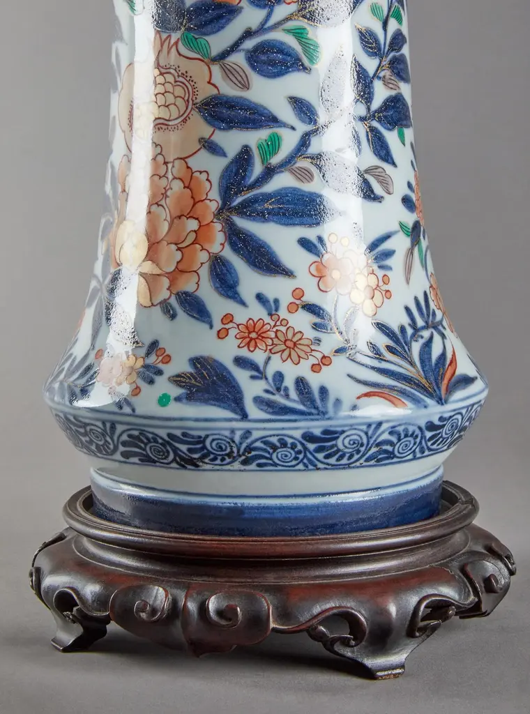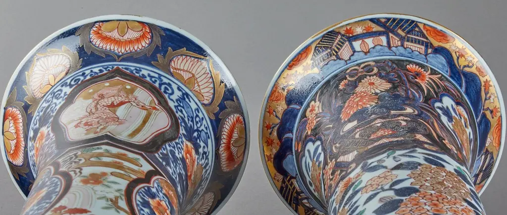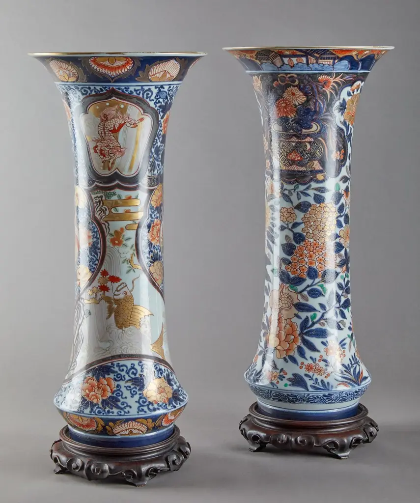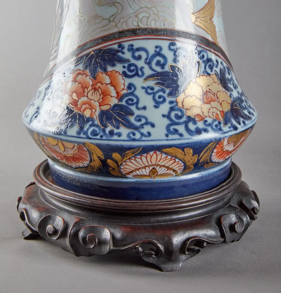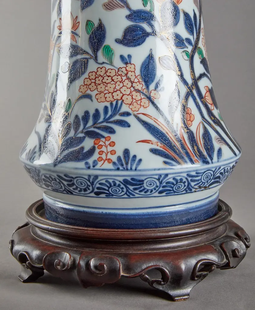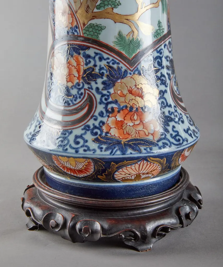 with elegantly carved wooden stand. Designs featuring floral patterns and birds.