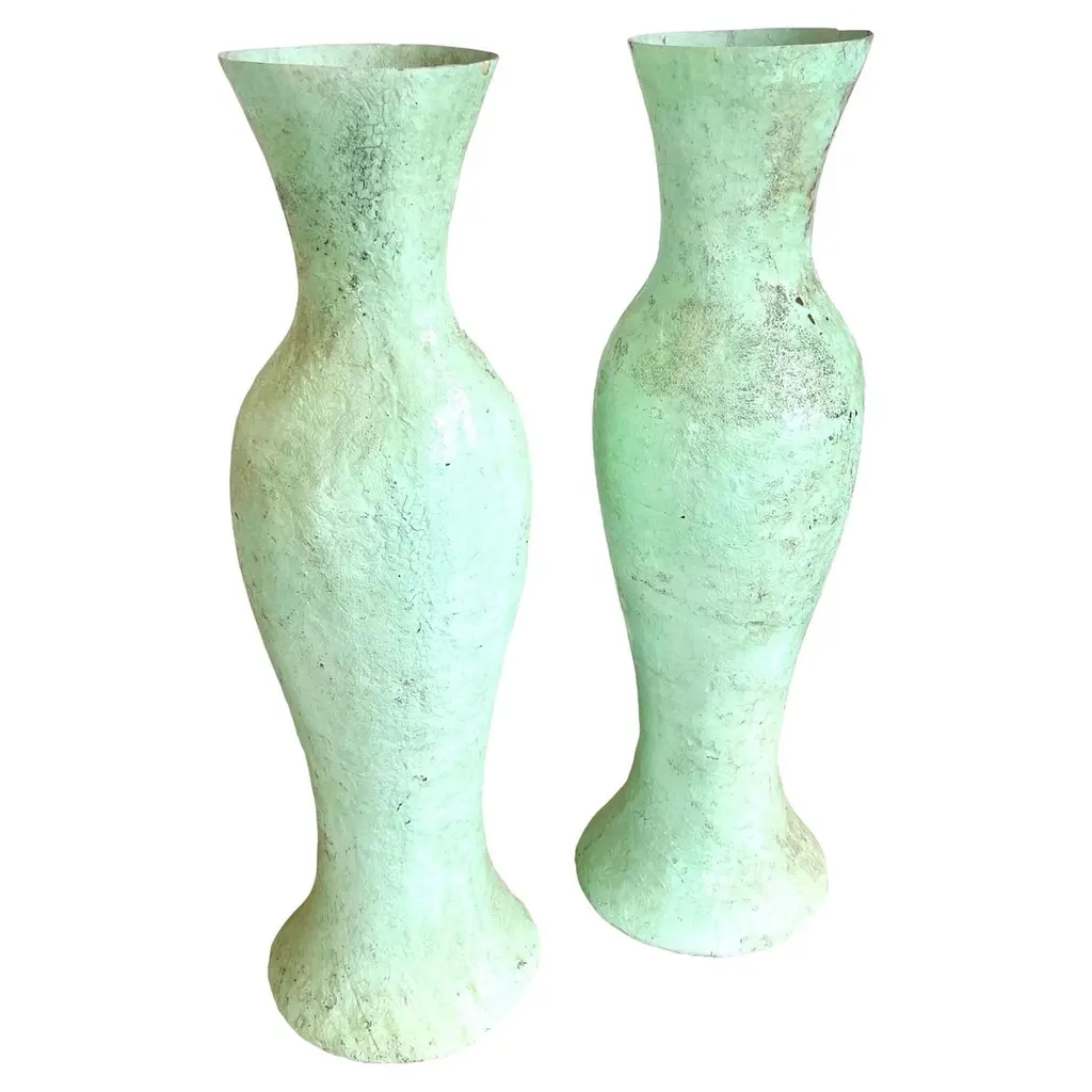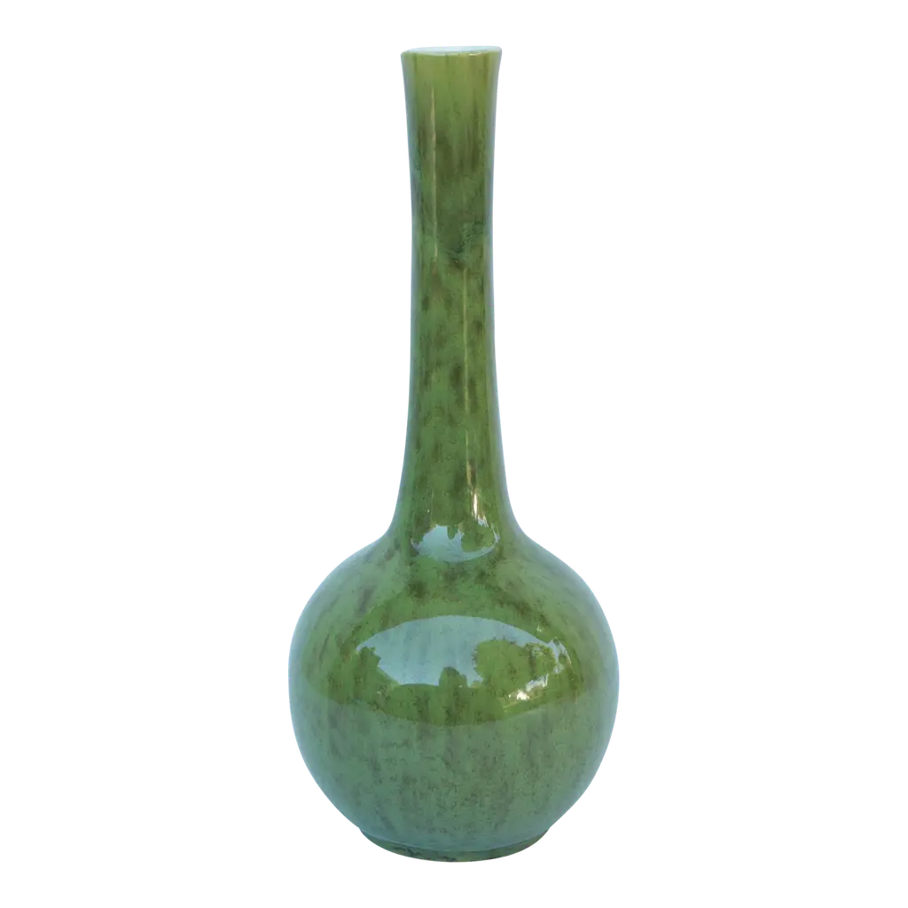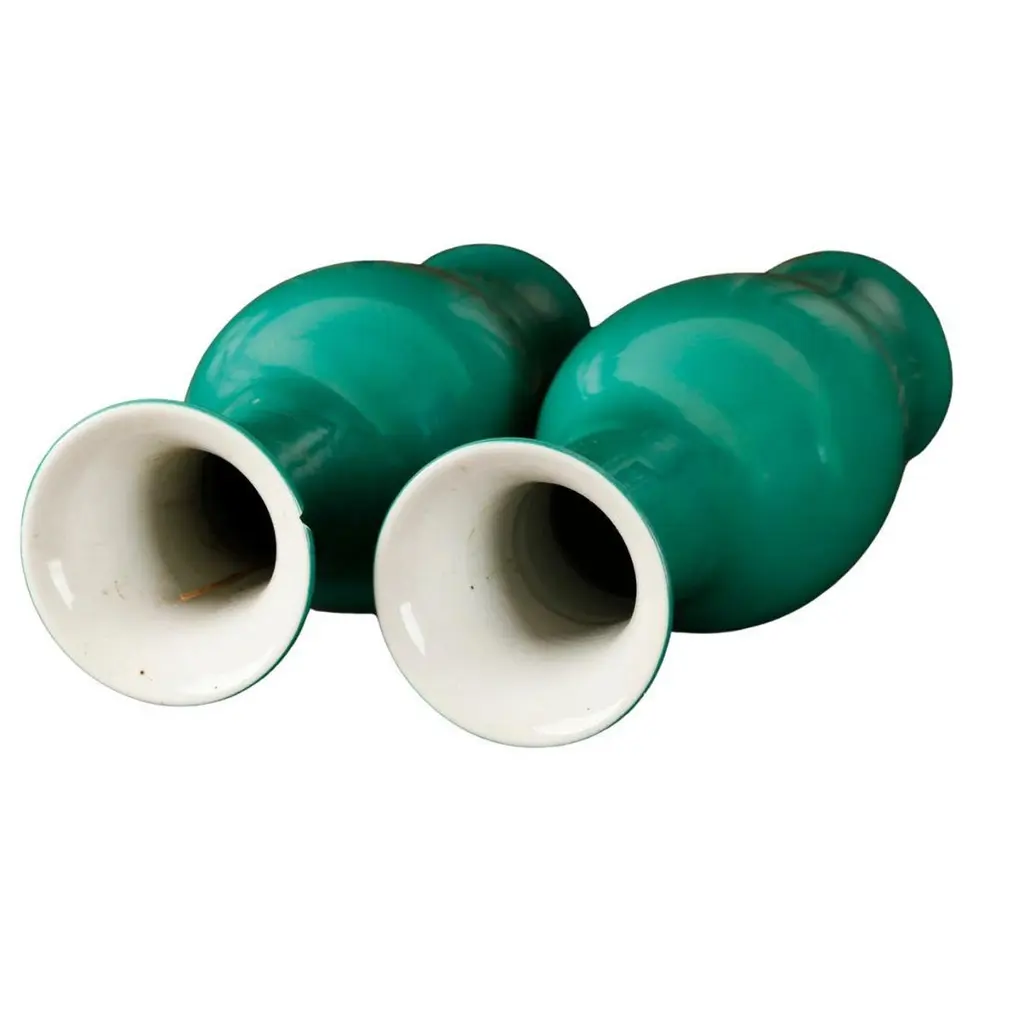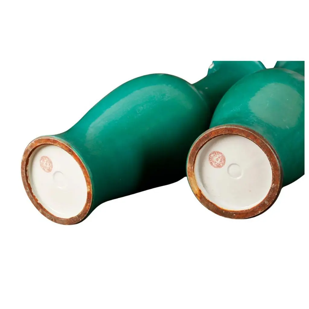 This stunning pair of vibrant green Kutani porcelain vases captures the essence of Japanese artistry. Kutani ware is a renowned style of Japanese porcelain, known for its vibrant, colorful overglaze enamel. The rich, glossy green glaze and smooth porcelain surface create a striking visual impact, whether displayed with floral arrangements or as standalone decorative pieces. The slender shaped vases add a touch of bold color, elegance and sophistication to any space, making them a perfect addition to both traditional and contemporary interiors. These porcelain vases are sure to be a conversation piece, showcasing the artistry and heritage of Japanese porcelain.