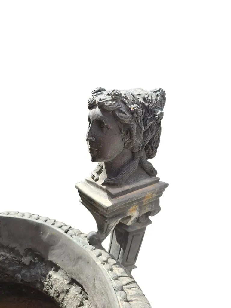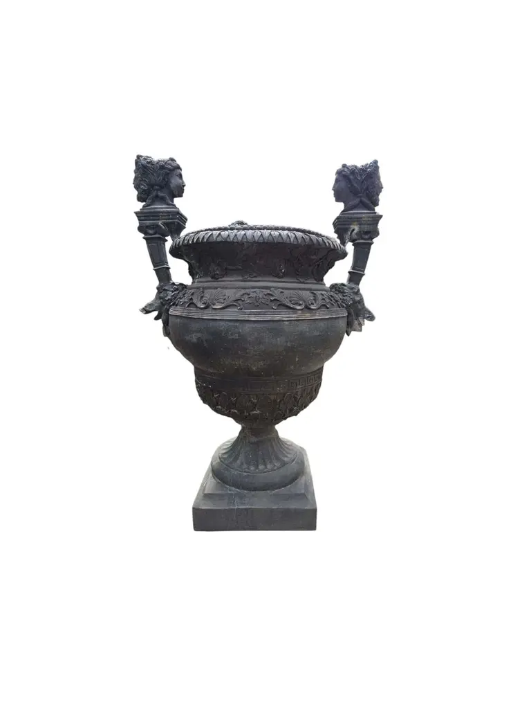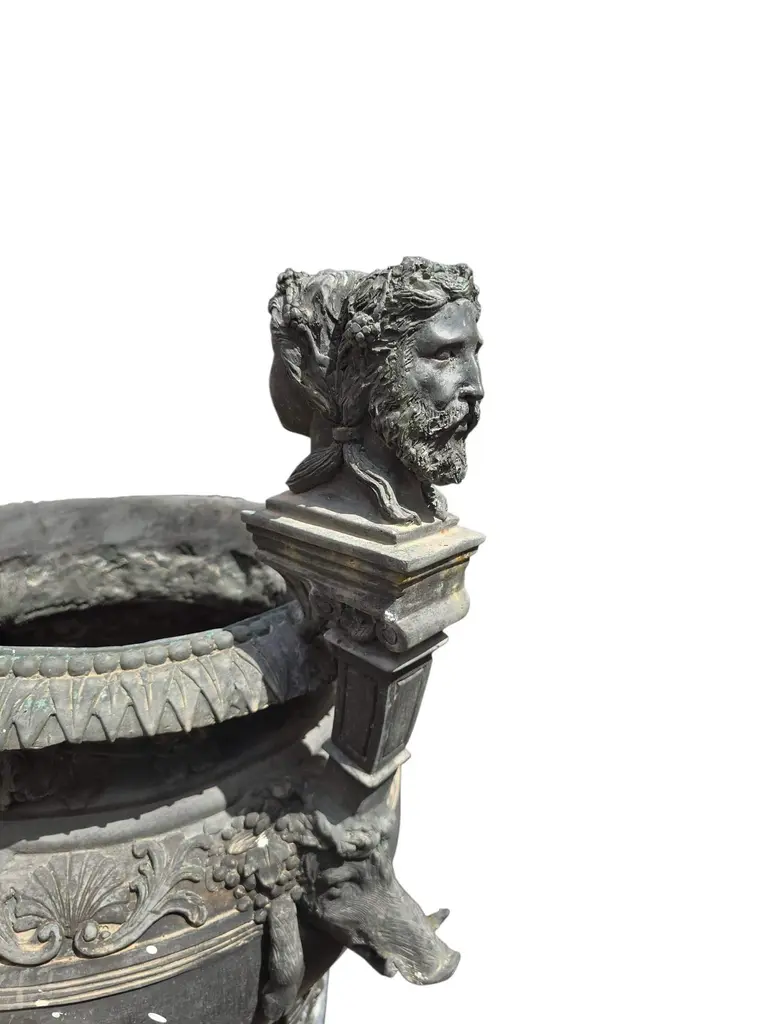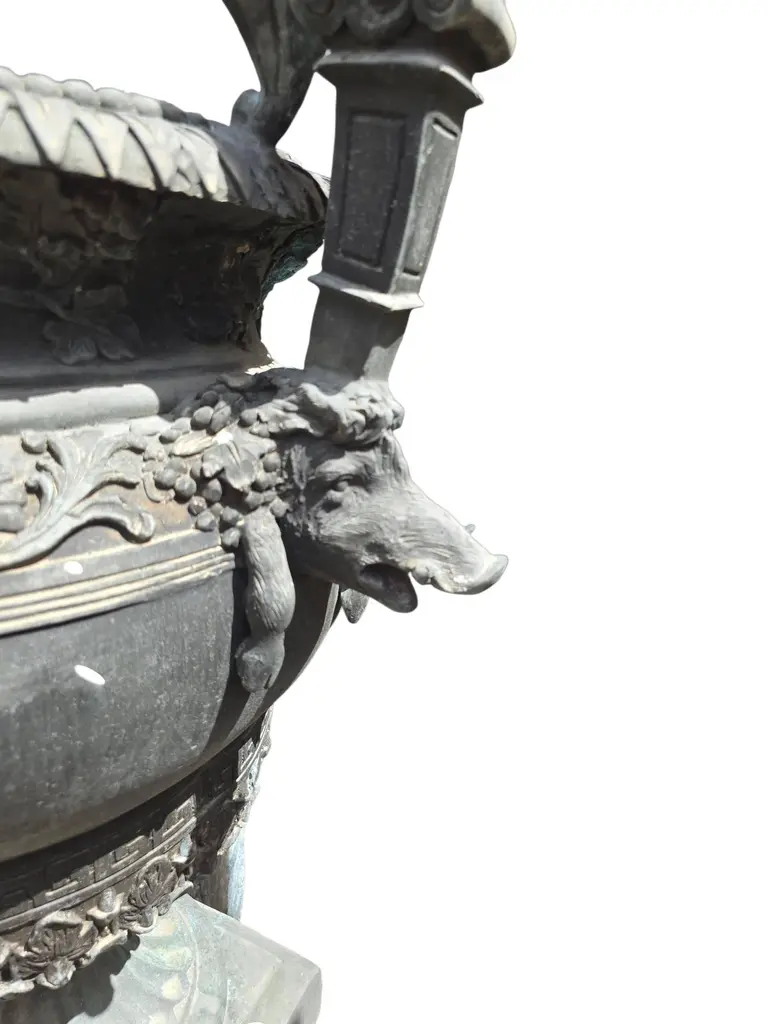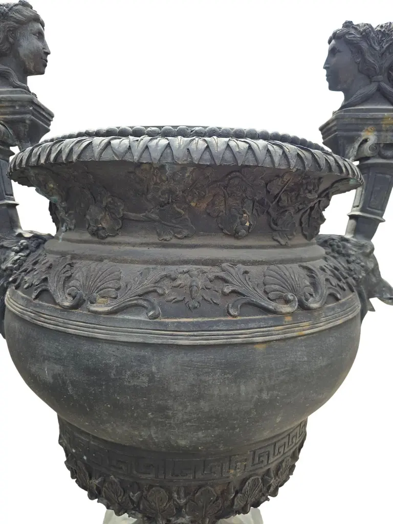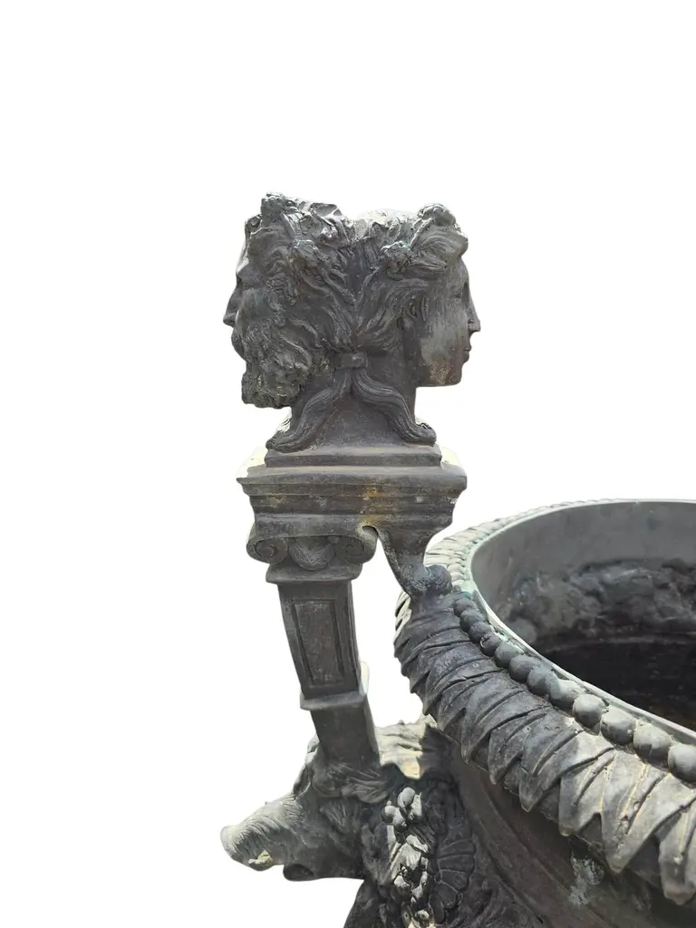 Magnificent pair of monumental bronze urns, richly decorated and hand-chiseled with intricate details throughout. Made in the 20th century, these palatial vases feature classical motifs, ornamental reliefs, and elegant proportions, reflecting exceptional craftsmanship and decorative grandeur.Ideal for grand entrances, luxury interiors, or garden settings, these statement pieces evoke the timeless elegance of European aristocratic design.Dimensions (each):Height: 41.3 in (105 cm)Width: 29.5 in (75 cm)Depth: 21.7 in (55 cm)Condition:Very good condition. Minor wear consistent with age. Structurally sound and visually impressive.