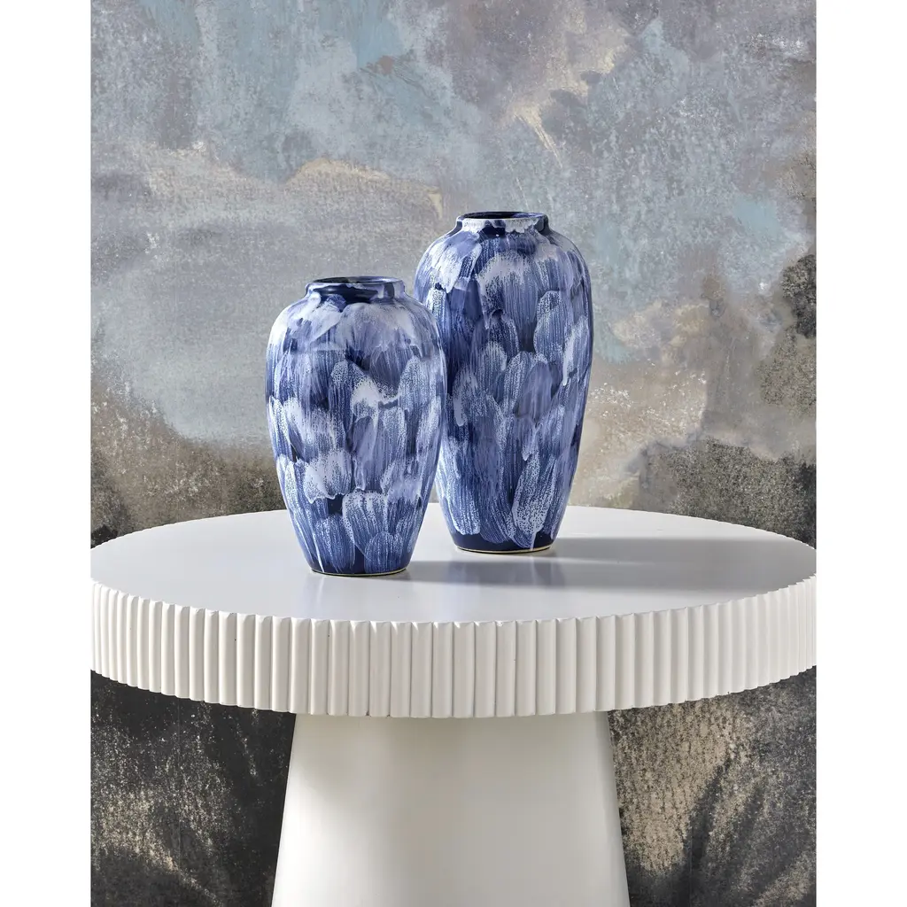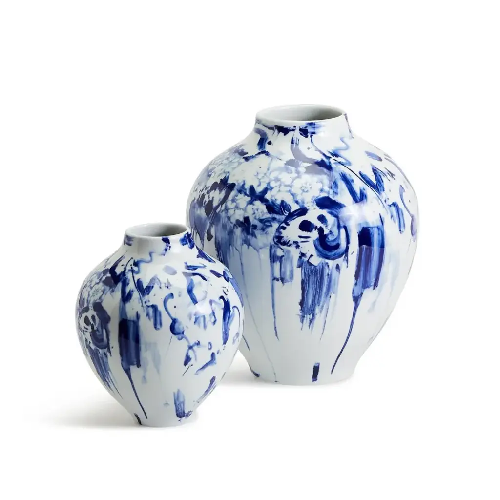 If the Pallas Vase Set was a pair of canvases, the two vessels would be true works of art because the ceramic surfaces of the white and blue vases have been treated to hand-painted brush strokes. Illustrating the hand-made aspect of these vessels is how the white glazing that is applied over the luminous blue surface bubbles where it is the thickest, which provides the vases with greater texture. The fact that the flowing smudges been layered highlights the artisanal quality of each piece. Because these are hand-painted, each piece will vary slightly.