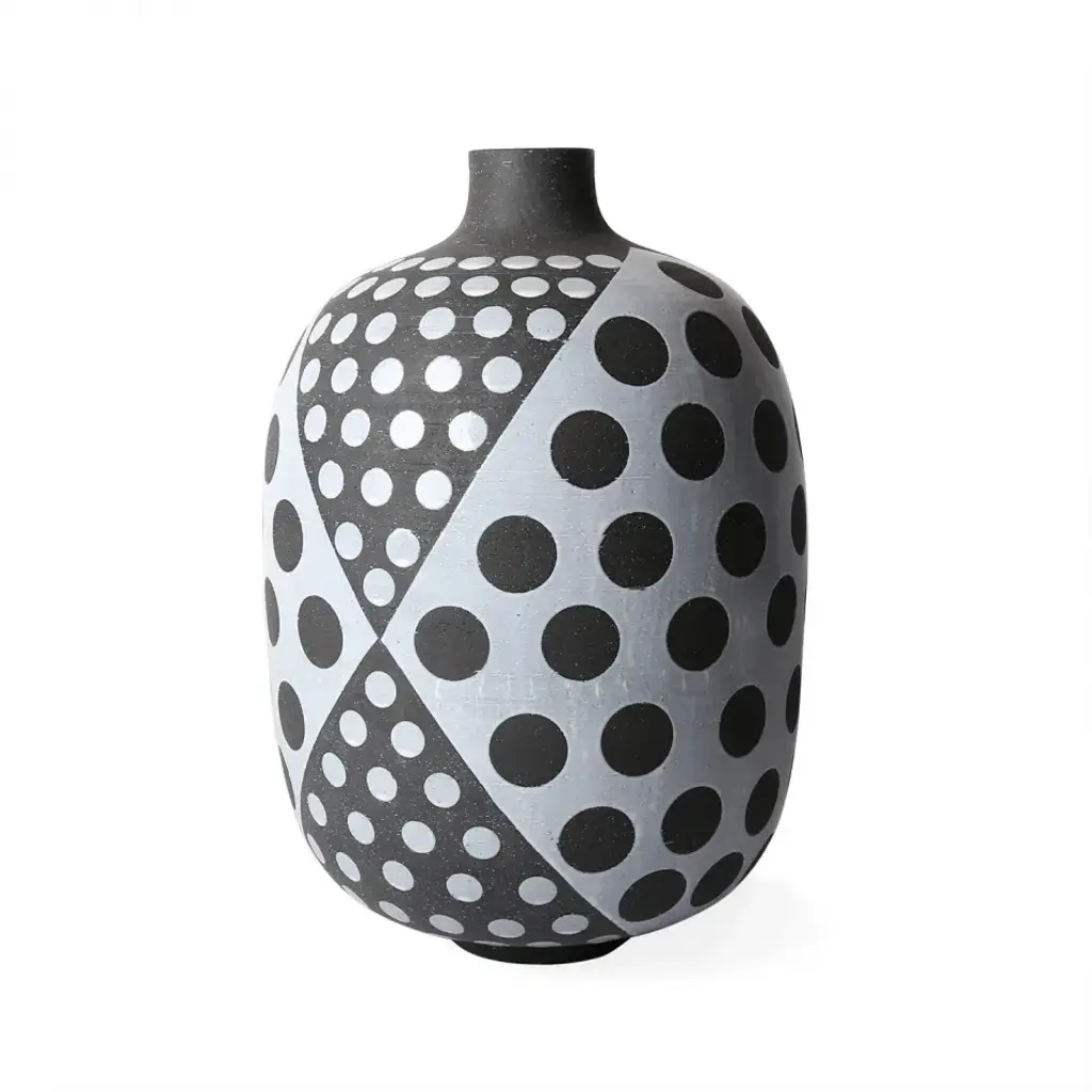 Epic Craft.Introducing a limited-edition collection of hand-thrown Palm Springs vessels of monumental scale.Five oversized forms (limited to 15 productions each) hand-thrown from black stoneware infused with chunky grog, then trimmed and chattered* to create a striated texture. Using a wax resist process to expose the raw clay, each piece is decorated with a simple polka dot pattern of varying scale and finished in an ivory glaze. Produced by skilled artisans in our Peruvian workshop, each piece bears the marks of rigorous craftsmanship.Epic scale, epic craft, epic collection.*Chattering is created when a potter rhythmically bounces a tool across the vessel's surface.
