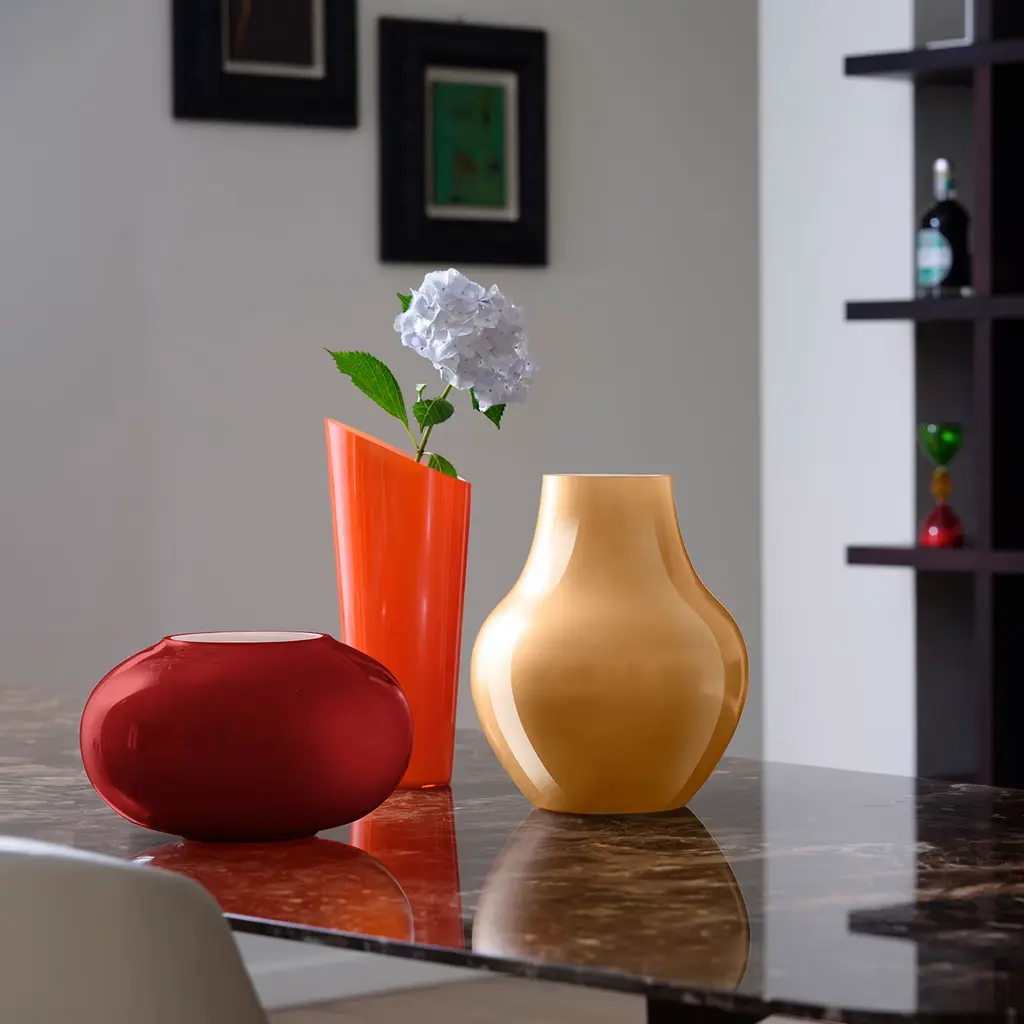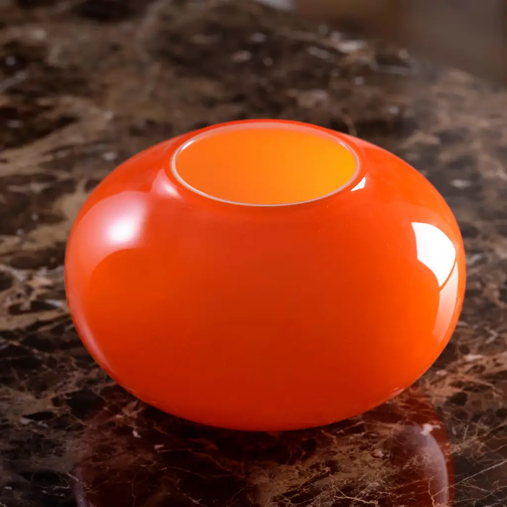 The Pandora vase, crafted from orange and milk-white cased glass, showcases a stunning combination of colors and craftsmanship. The unique cold-cut technique highlights the intricate details, making this vase a sophisticated and timeless addition to any space.