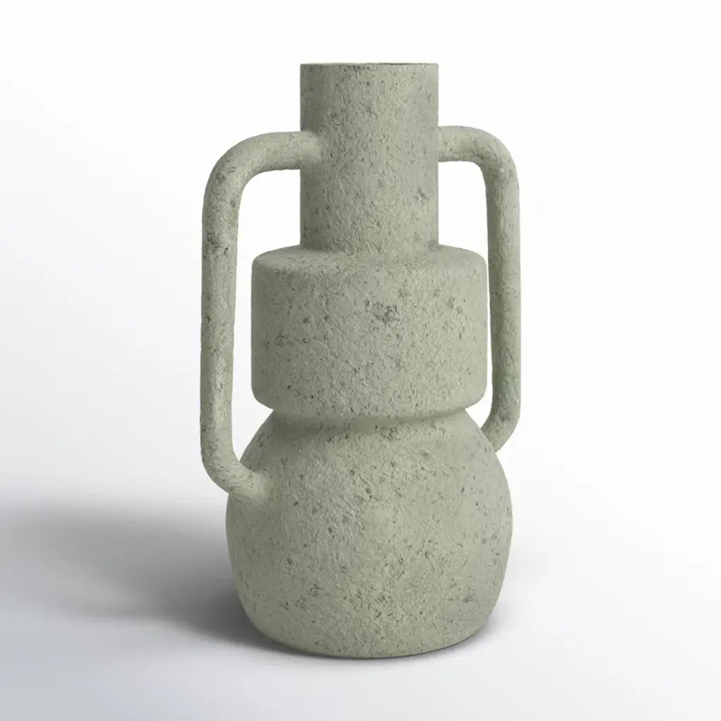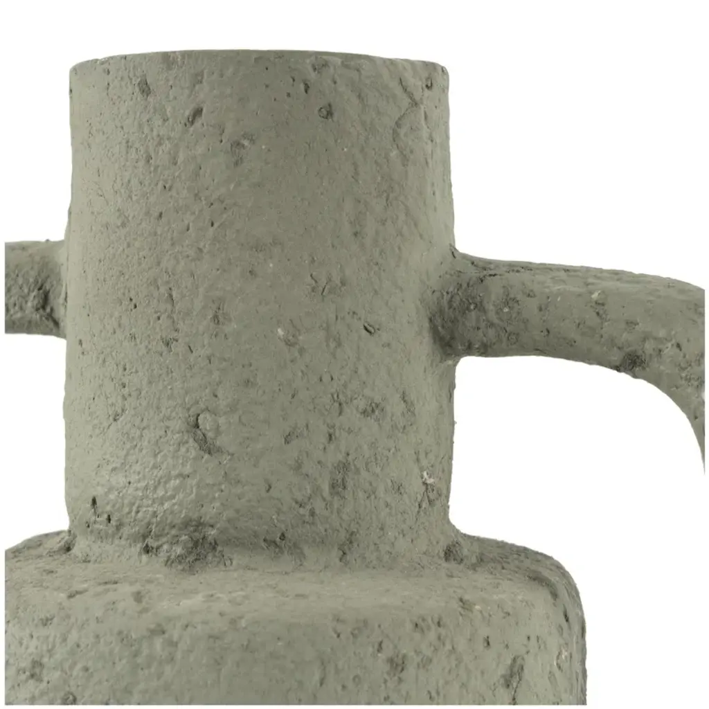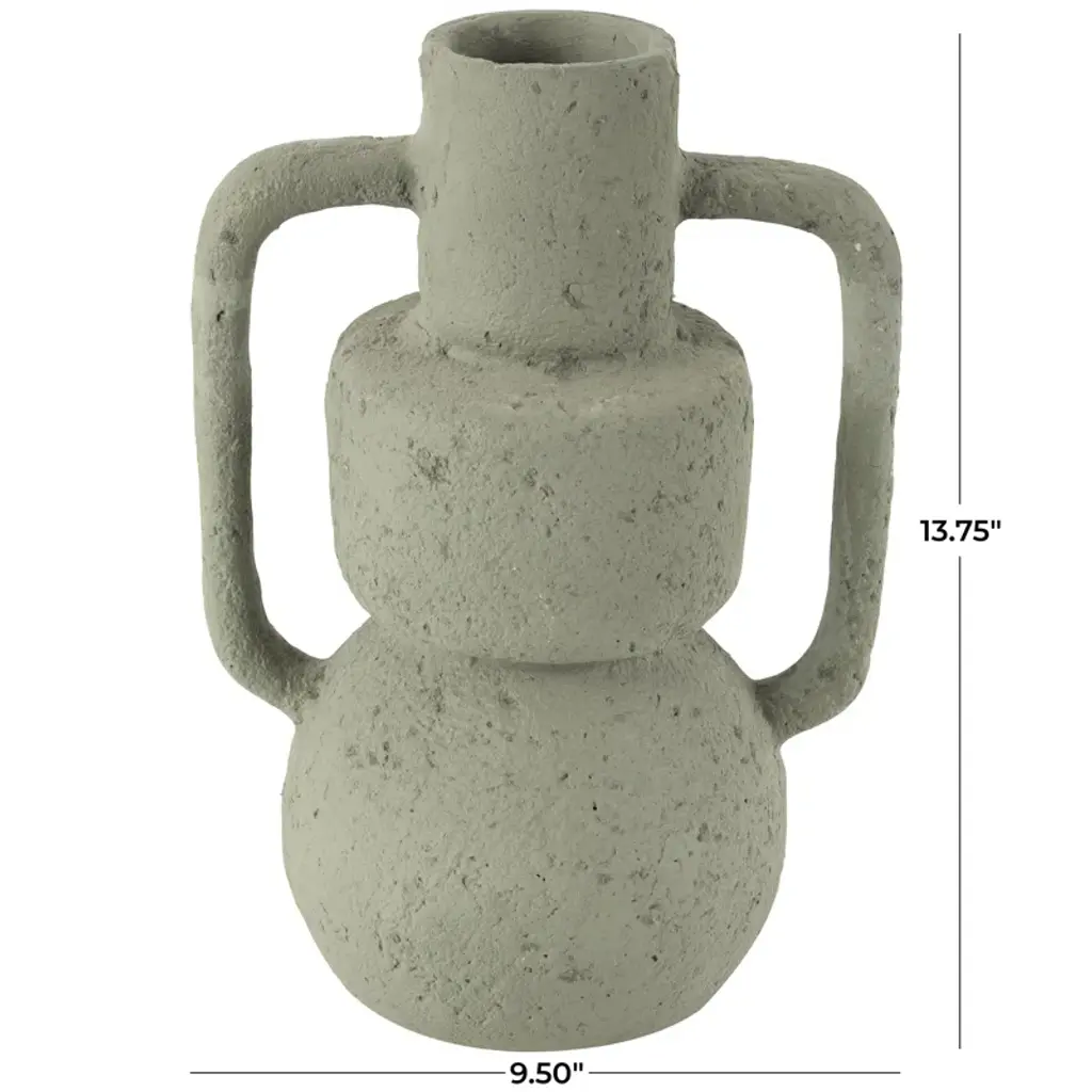 Use this vase as a decorative accent piece on a mantle or table, or display greenery or dried floral to add texture and warmth to the home. Designed with felt or rubber stoppers at the base that prevent scratching furniture and table tops, as well as sliding around. This item ships in 1 carton. Paper mache vase makes a great gift for any occasion. Suitable for indoor use only. This item ships fully assembled in one piece. Made in India. This is a single light gray colored vase. Contemporary style. Vase has a 2 in mouth opening.