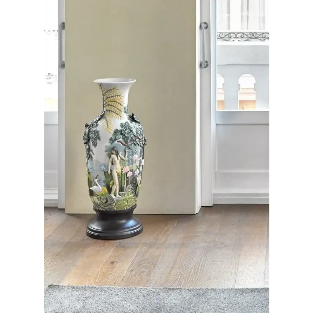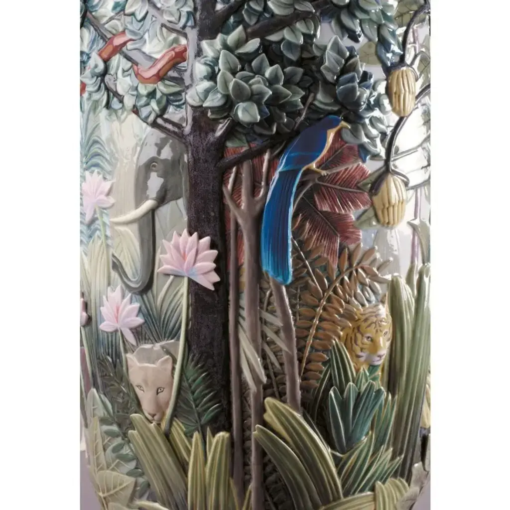 Limited edition porcelain jar with figures and decoration in relief, with a wide range of greenery recreating the tropical hues of a virgin jungle paradise. An iconic Spanish brand, Lladro is a world leader in the creation of porcelain art. Started by brothers Juan, Jose and Vicente Lladro in 1953, the ceramic figurines were initially inspired by the works of great European manufacturers like Meissen and Sevres. Over time, a unique style was forged, consisting of elongated lines, a revolutionary single-firing method, and soft pastel tones.