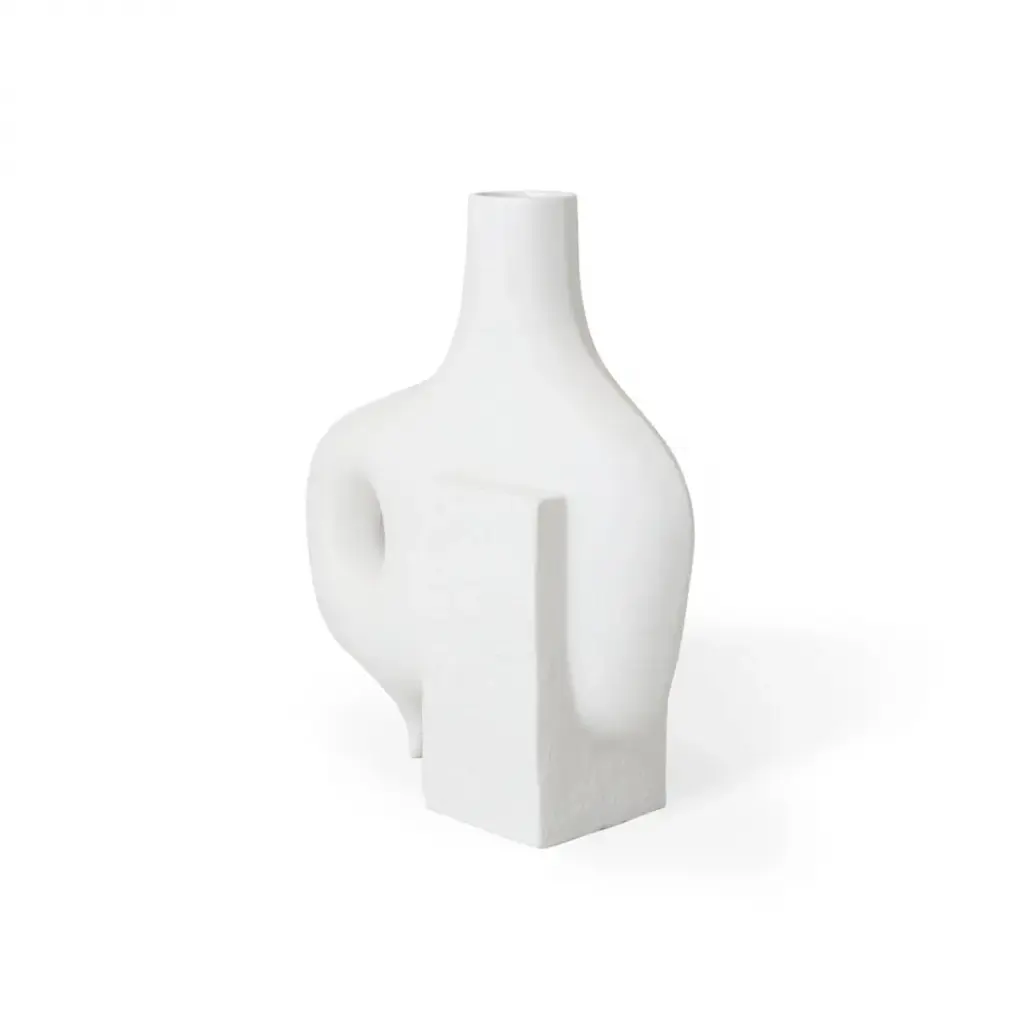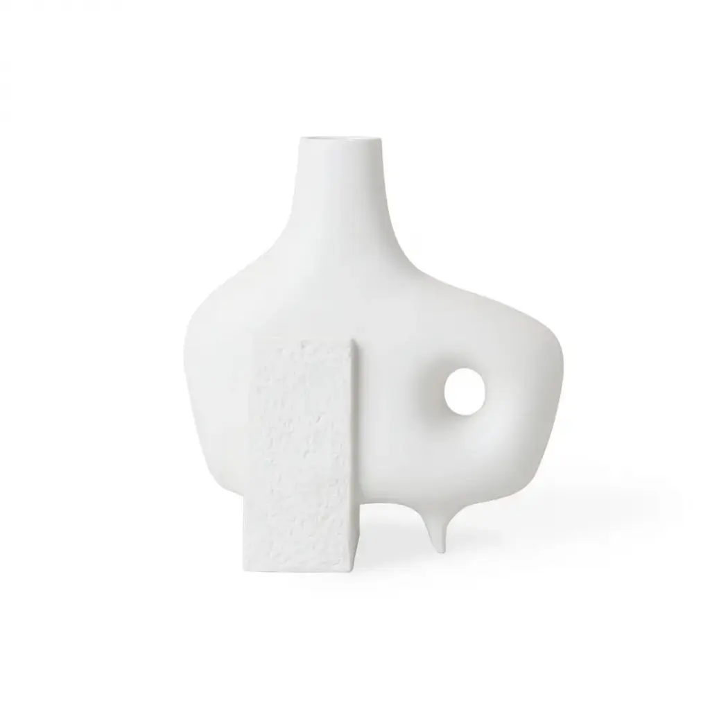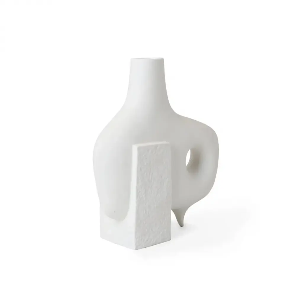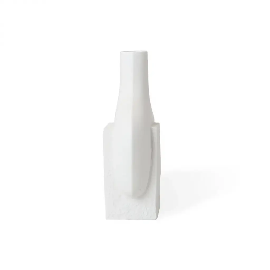 Organic Modernism.Functional sculptures featuring smooth organic forms intersecting with rough-textured blocks of porcelain. The perfect place for colorful buds to pop, they also make a strong statement without. Style the collection together for a striking blanc tablescape.
