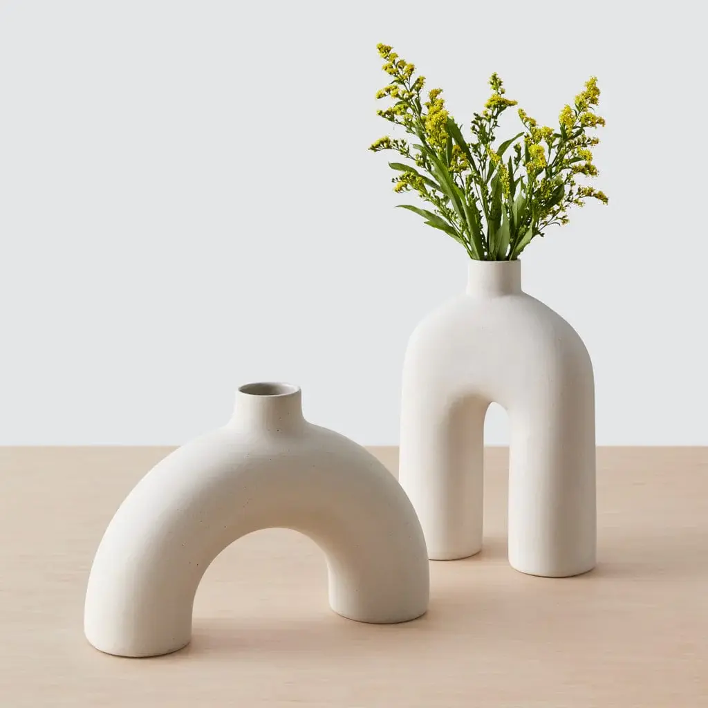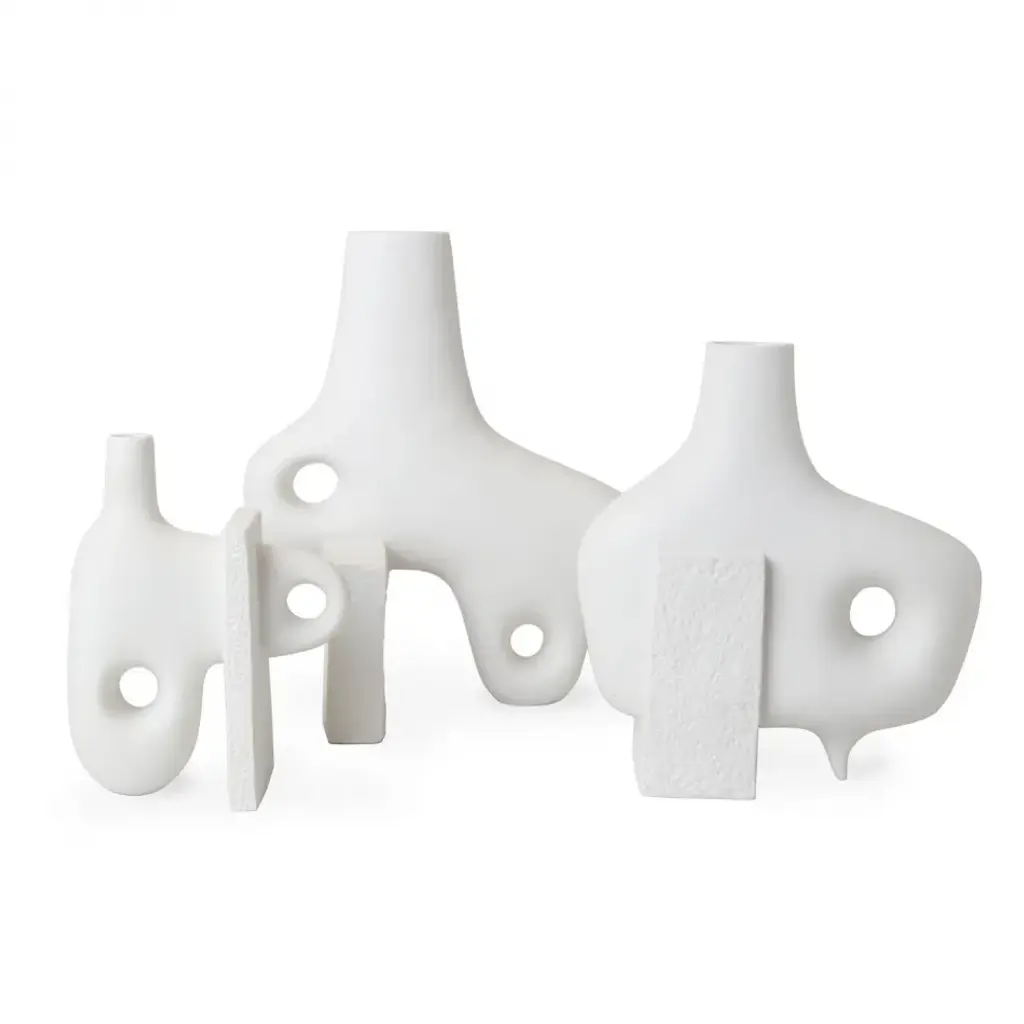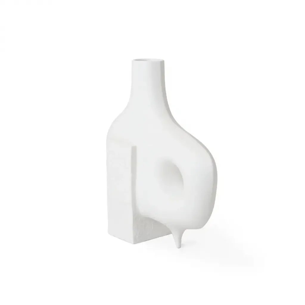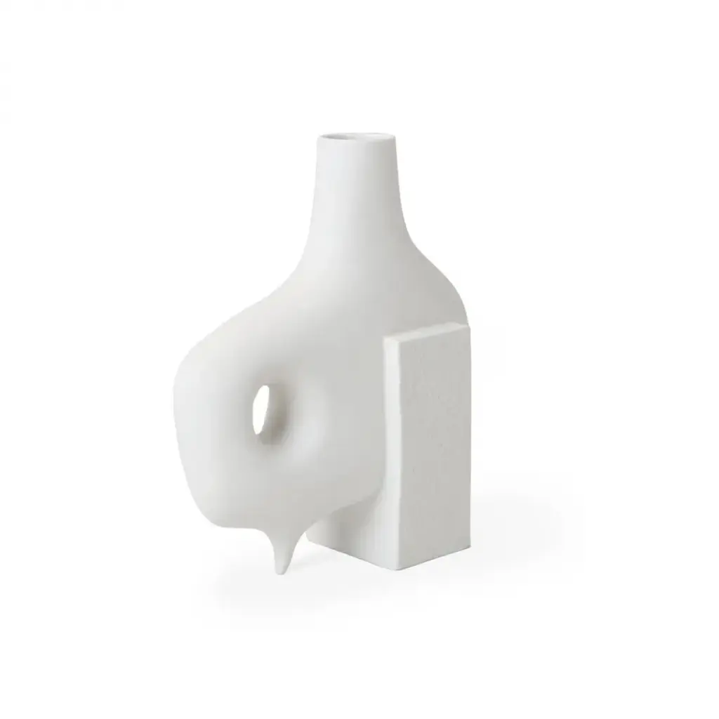 Organic Modernism.Functional sculptures featuring smooth organic forms intersecting with rough-textured blocks of porcelain. The perfect place for colorful buds to pop, they also make a strong statement without. Style the collection together for a striking blanc tablescape.