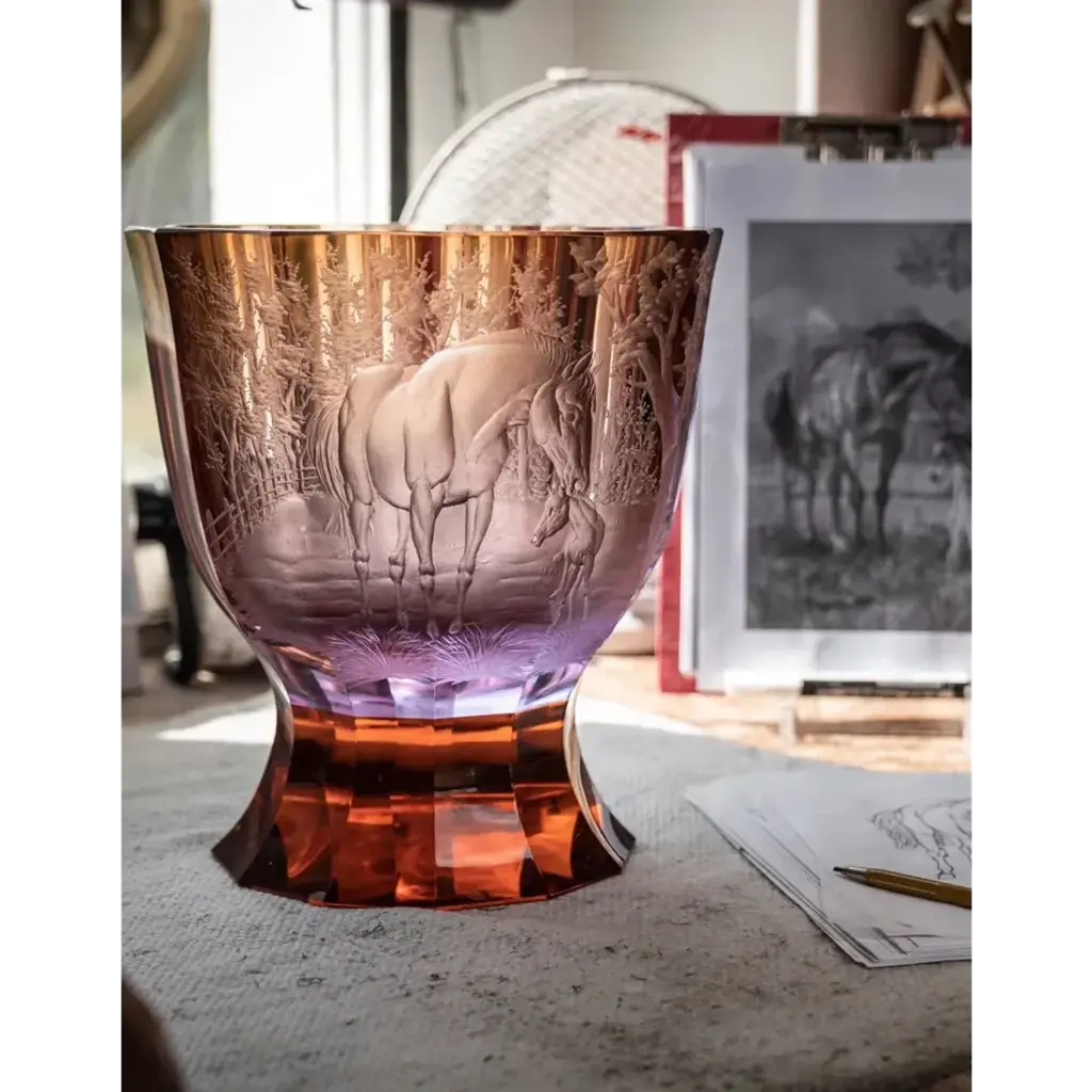 The rhythm of the paso doble and the softness of the master engraving. Fiery colors into which the engraver was able to bring an imprint of love and traditional craftsmanship. The collection from which the crystal Paso doble vase is can awaken a passion not only for horses. Founded in 1857, Moser boasts a long tradition of superior artistic and technical standards in lead-free crystal. The quality of the crystal and perfection of Moser's hand cutting, engraving, gilding and brilliant colors are unsurpassed by any contemporary glass or crystal company in the world. Created by Ludwig Moser & Sons, the line originated as an engraving studio in the spa town of Karlsbad, located in Bohemia (now the Czech Republic), a region with deep roots in superior glass-making. During the late 19th and early 20th centuries, Moser developed its now famous technically perfect crystal production, employing a unique formula for producing a substance as hard as rock and as brilliant as lead crystal - but without using a trace of lead. This composition is very suitable for Moser's marvelous engravings, is ecologically sound and remains free of all concerns associated with lead. Moser's innovative techniques in cutting, engraving and coloring quickly won the line great acclaim at many prestigious international art exhibitions. Soon Moser became the proud possession of royalty, heads of state and well-known personalities throughout the world, an esteemed reputation that has held fast and continues to grow now in the 21st century. Today, Moser produces a wide range of stem and barware, holloware, accessories, giftware and art glass, all showcasing the superior quality, innovation and remarkable artistic expression for which the line has long been recognized.
