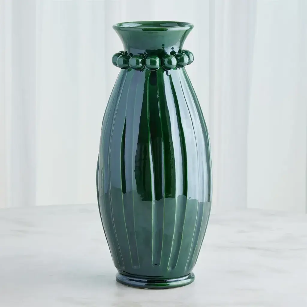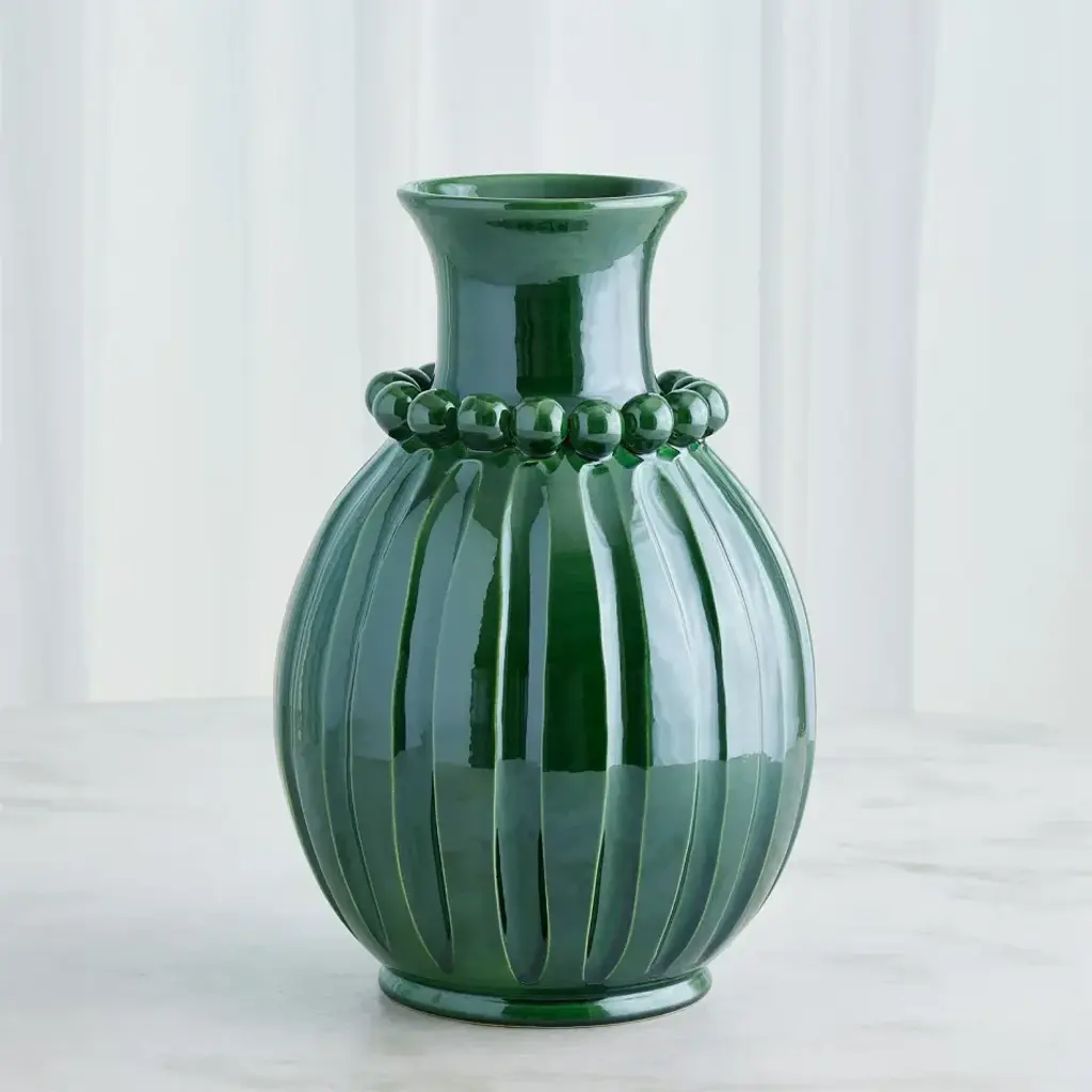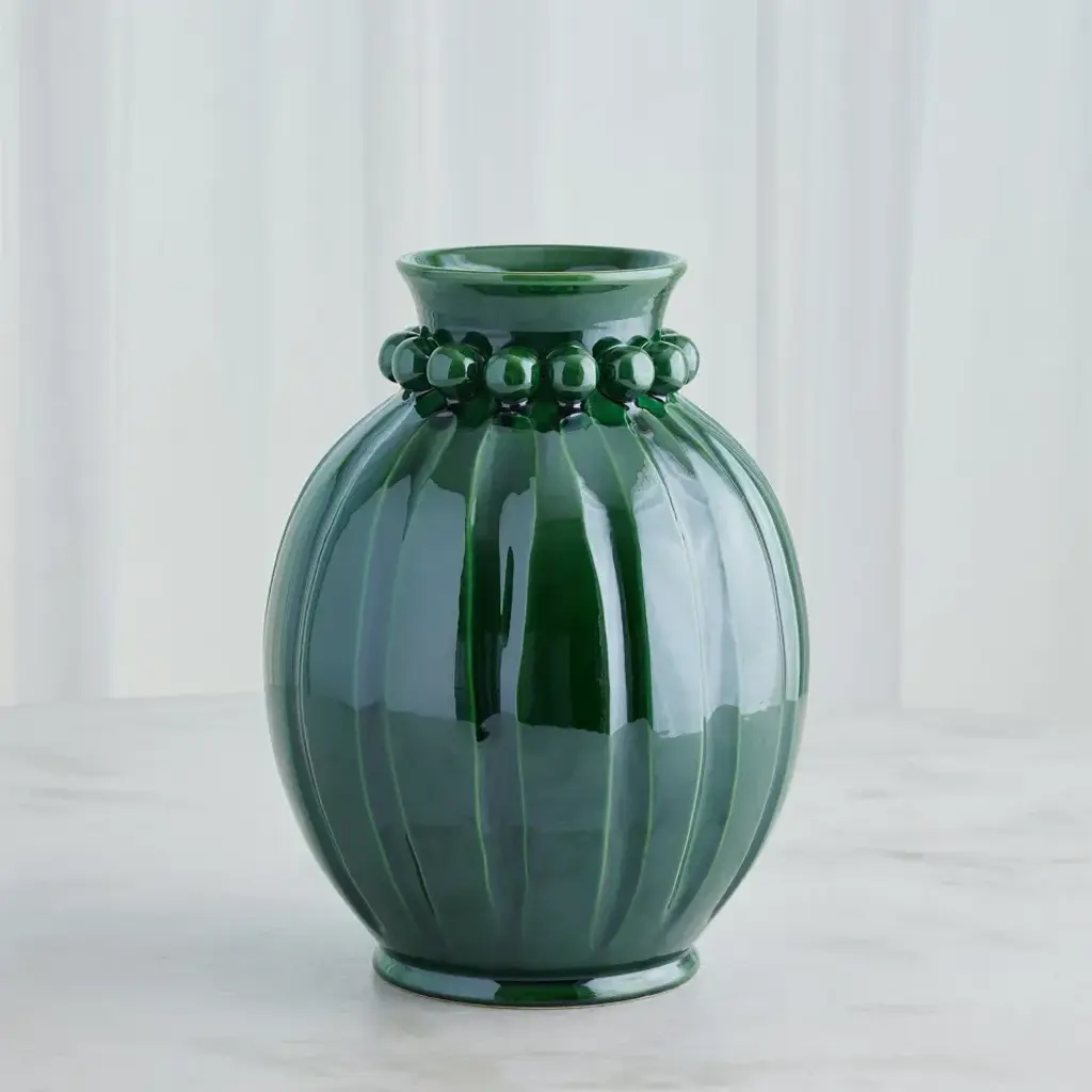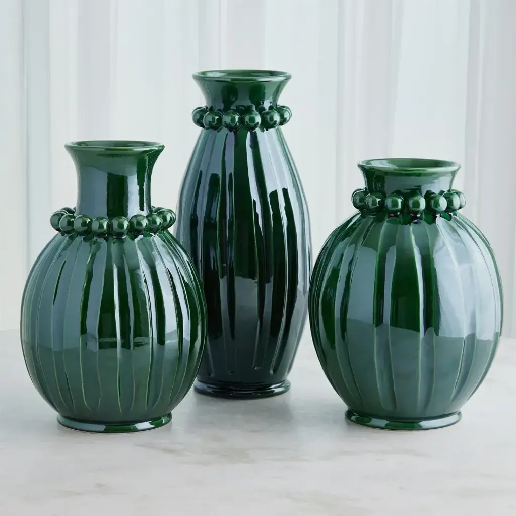 The Pearl Vases are a masterpiece of handcraftsmanship. Italian artisans embark on a meticulous process, hand-forming and hand-shaping cut pieces of wet clay to bring these vases to life. Using a mold, they meticulously create pearl details, hand-applying each one individually all the way around the vase. A special tool is then employed to create fluted indentations, adding to the intricate design of these exquisite pieces. From a fashion forward perspective, Global Views offers accessories, furniture, statement lighting, and an assortment of rugs and mirrors to add beauty and joy to your home.