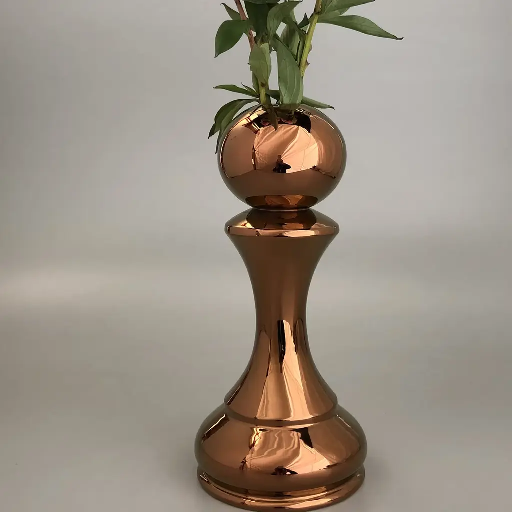 The unmistakable chess piece gets a new calling with the Pedone Bronze Pawn Flower Vase. A celebration of the thinking man's board game, the vase is hand spun in white terracotta. The vase is then given a white enamel coating before being finished in brass-colored paint by soft bristle brushes and fired a final time.