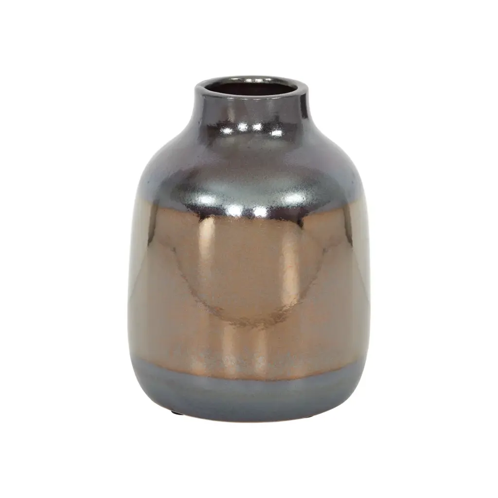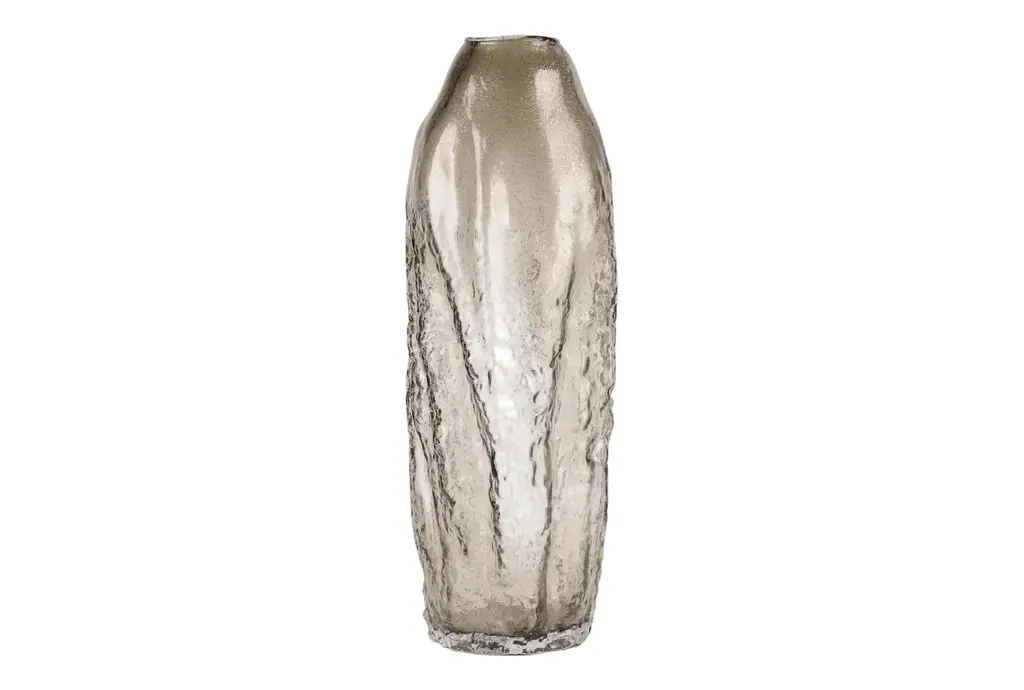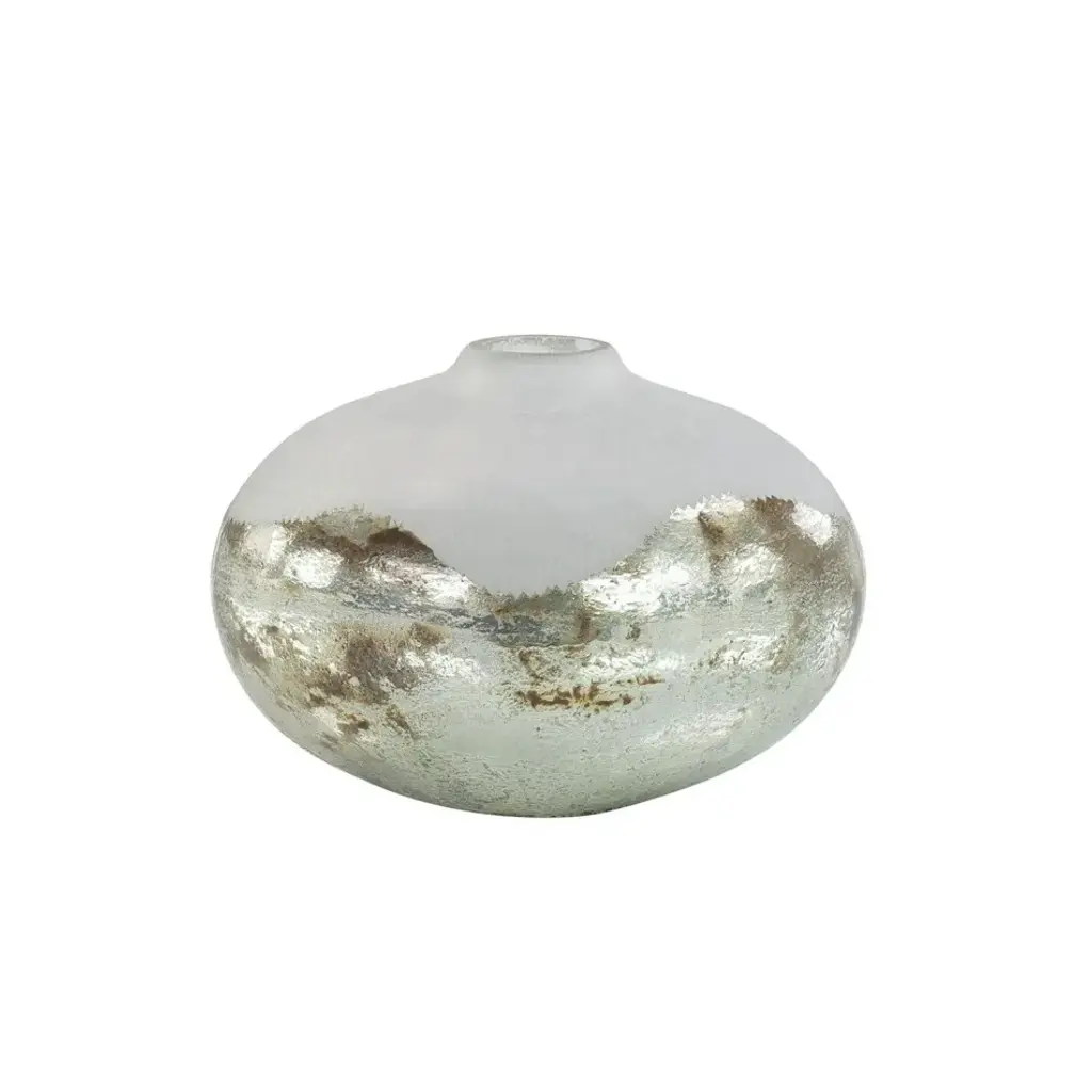 The Pegasus Vase demonstrates a gorgeous blend of opulent tones and textural depth. This rounded art glass piece displays two distinct halves, featuring a textural motif of cut glass at the top, with a smooth coating of silver foil at the bottom. The result is a stunning contrast that makes an impact within a space.