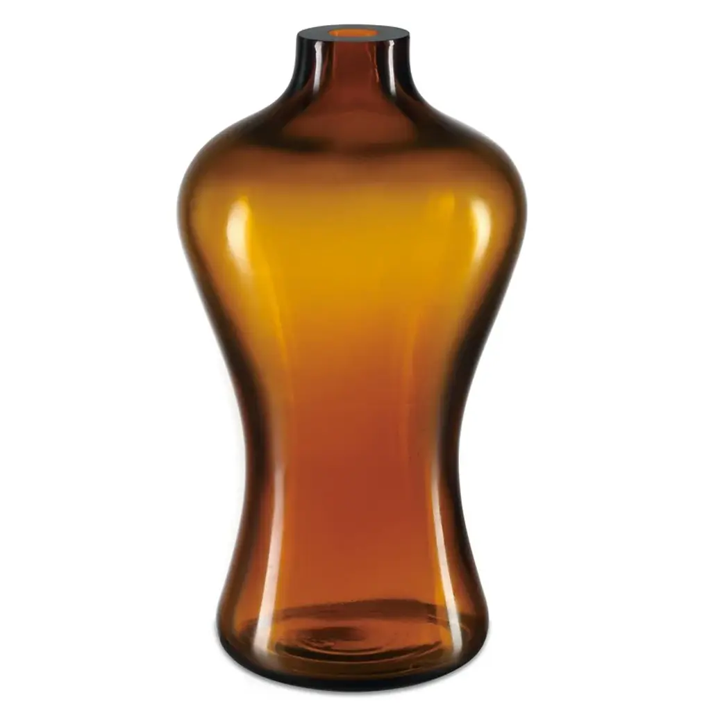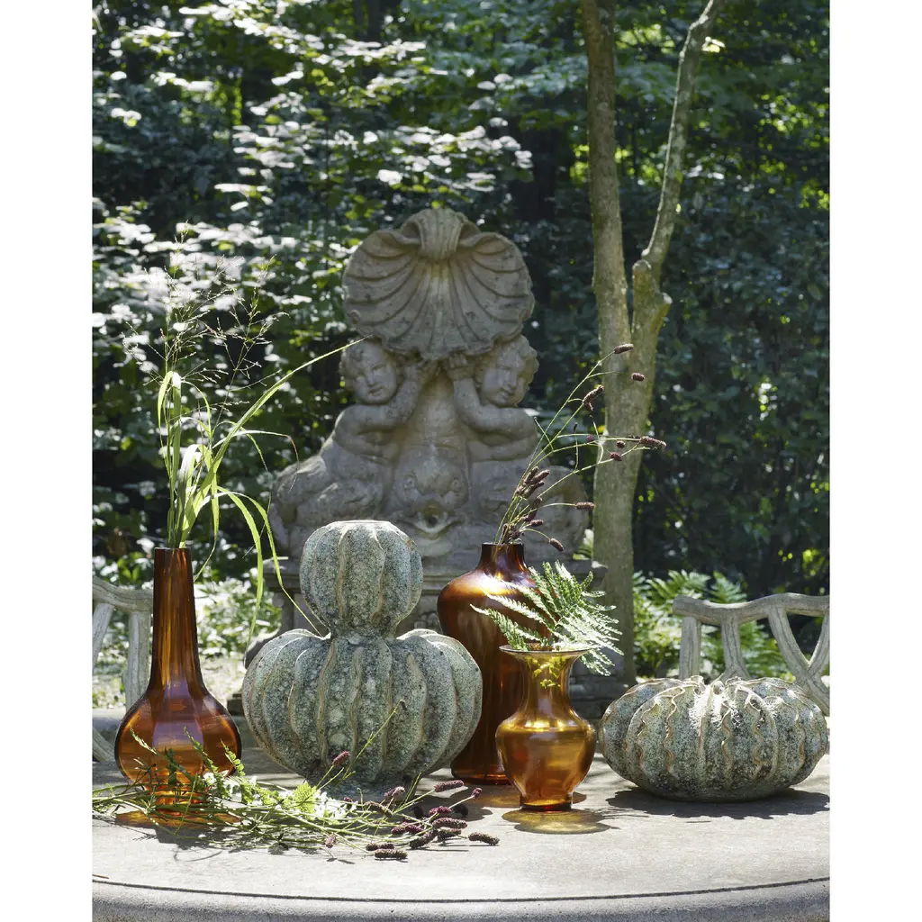 The Amber & Gold Peking Stem Vase is made of glass that is of an exceptional density and weight. The centuries-old methods that result in such remarkably thick and luminous glass is achieved by only two small factories whose artisans have the skills and know-how to successfully achieve the excellent quality evident in this amber glass vase. These are modeled after artifacts that were once produced for the Chinese Imperial palace.