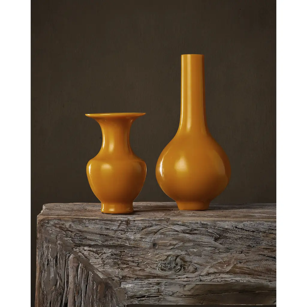 The Imperial Yellow Peking Long Neck Vase is made of glass that is of an exceptional density and weight. The centuries-old methods that result in such remarkably thick and luminous glass is achieved by only two small factories whose artisans have the skills and know-how to successfully achieve the excellent quality evident in this yellow glass vase. These are modeled after artifacts that were once produced for the Chinese Imperial palace.