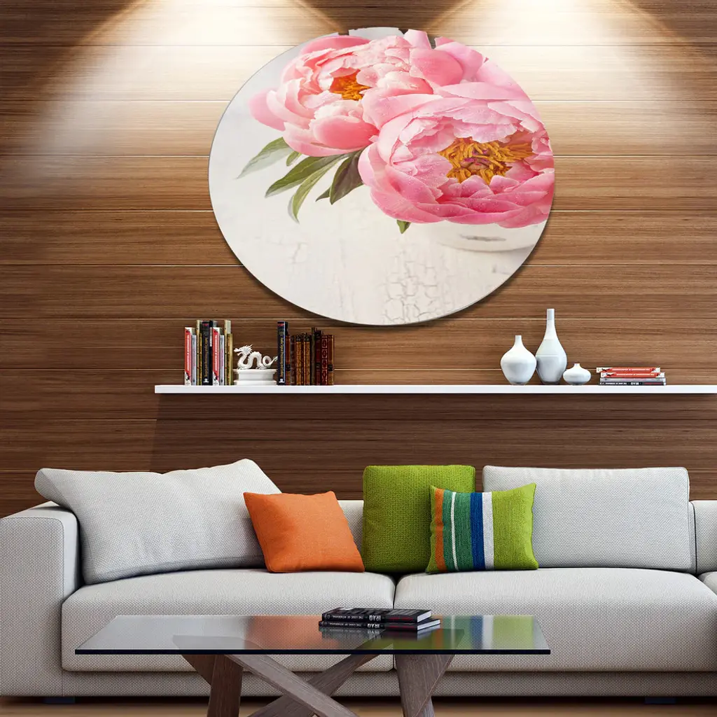 Bring Contemporary Abstraction to your home with this large Circle Metal wall art. This Peony Flowers in Vase Photography Metal Artwork makes it the focal point of any room or office. - White Gloss Coating ensures colors are extra vibrant with light reflection.- Aluminum grade Sheet Metal with 1 inch mounting frame on the back giving the illusion that the artwork is floating on the wall..- Mounting Brackets are included along with instructions.- High Quality Digital images are created directly into a glossy aluminum panel producing a stunning and captivating print into the glossy finish of the metal.- Water, Fire and Scratch resistant HD Aluminum panels.- Looks better than any photo paper and guaranteed to last at least 20 years- Easy to clean with a microfiber cloth. Colors are far superior to regular Canvas Art. - Easy to Hang