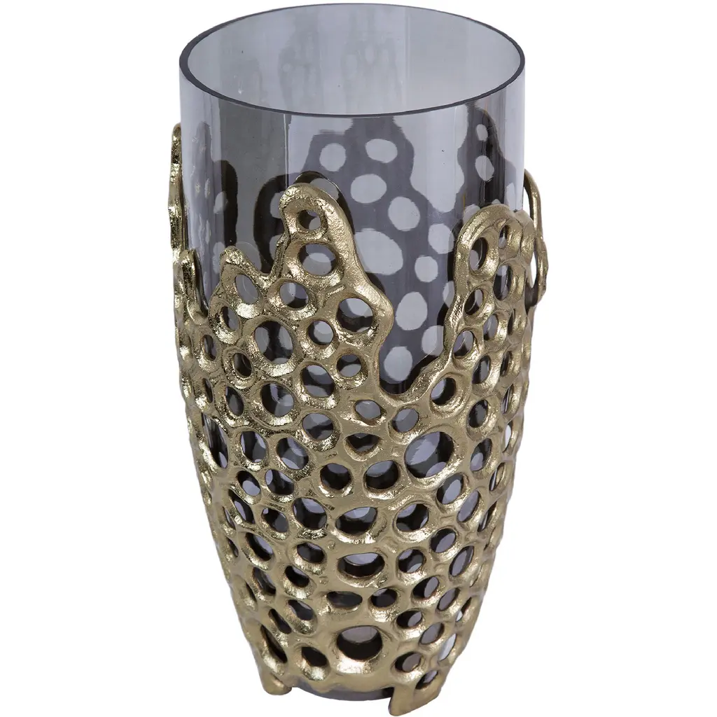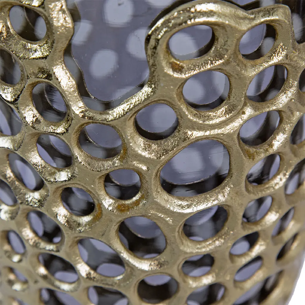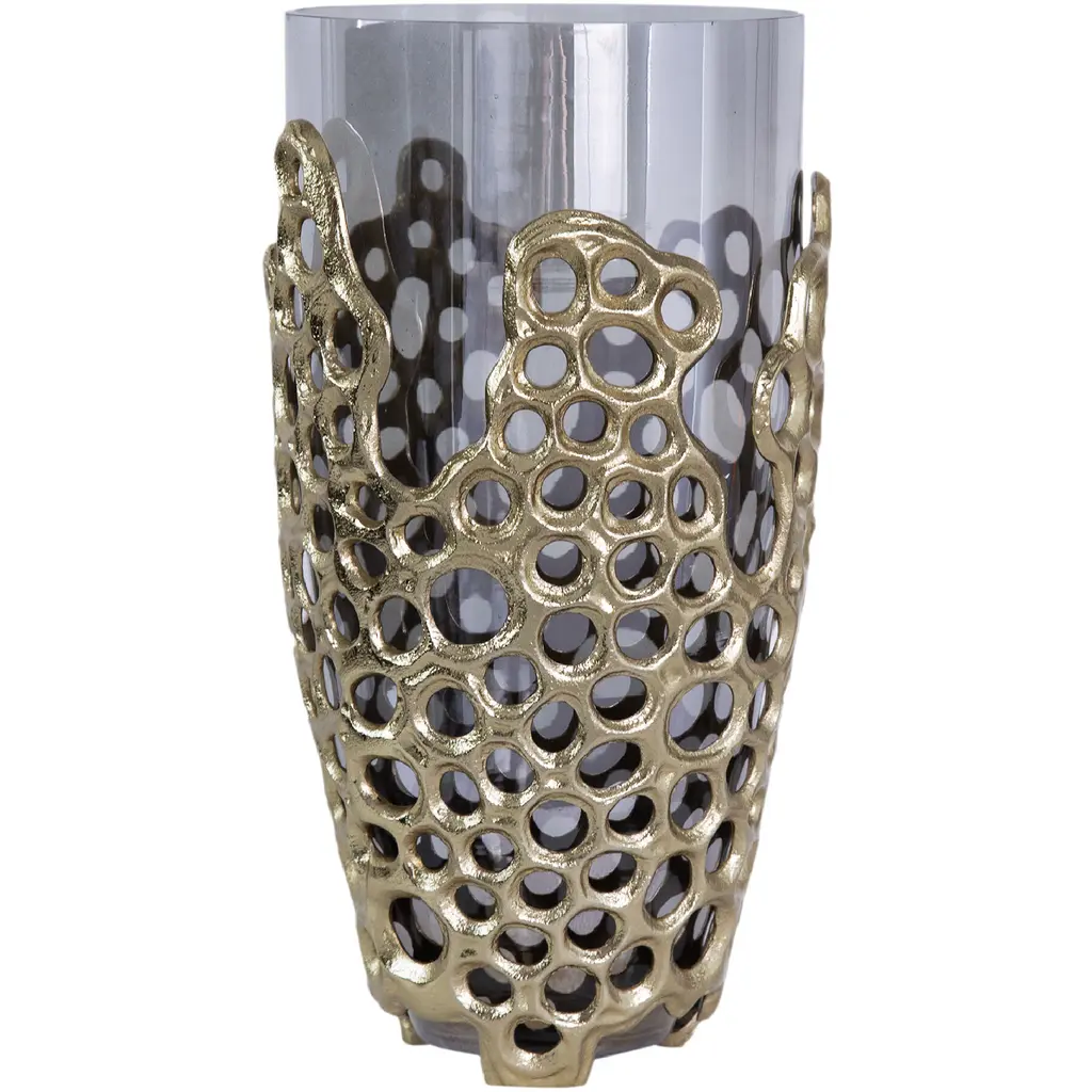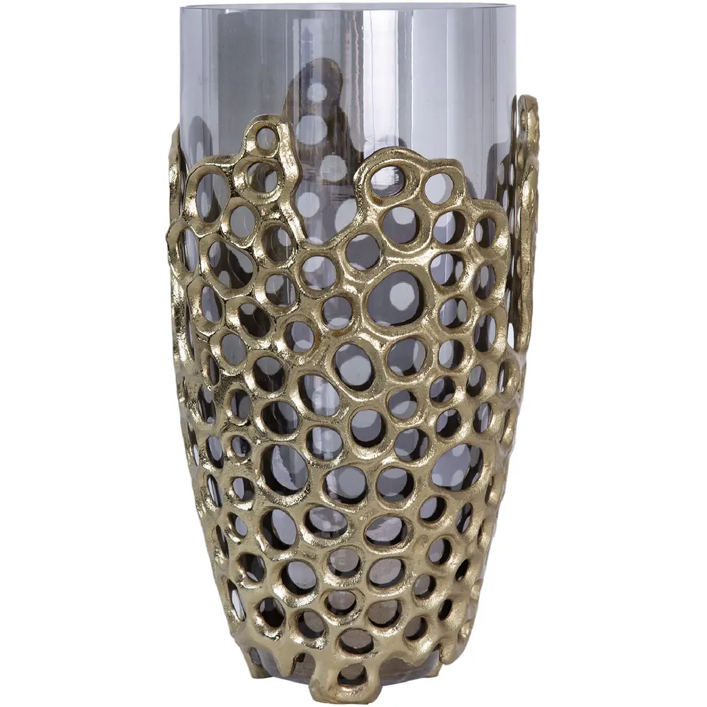 Combining the soft gold tones and the translucent black glass, the Percy aluminum glass vase creates a sleek accent for any contemporary design. The distinct design of the honeycomb pattern inspires the crafted look of the aluminum that encases the glass vase. Styled as the centerpiece of your table tops or added as an accent, youll love having this vase in your collection.