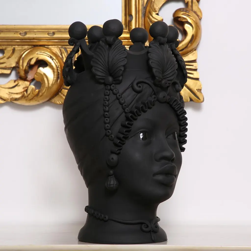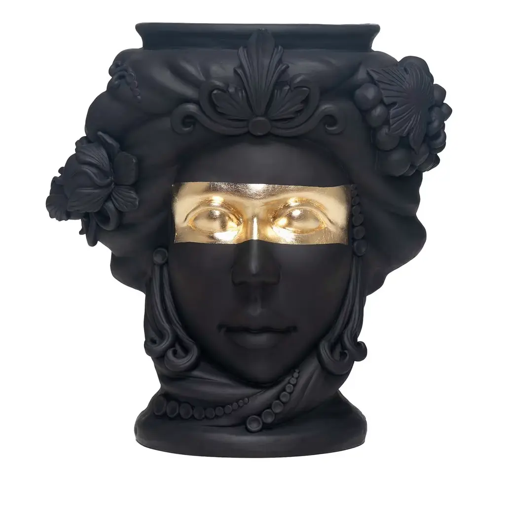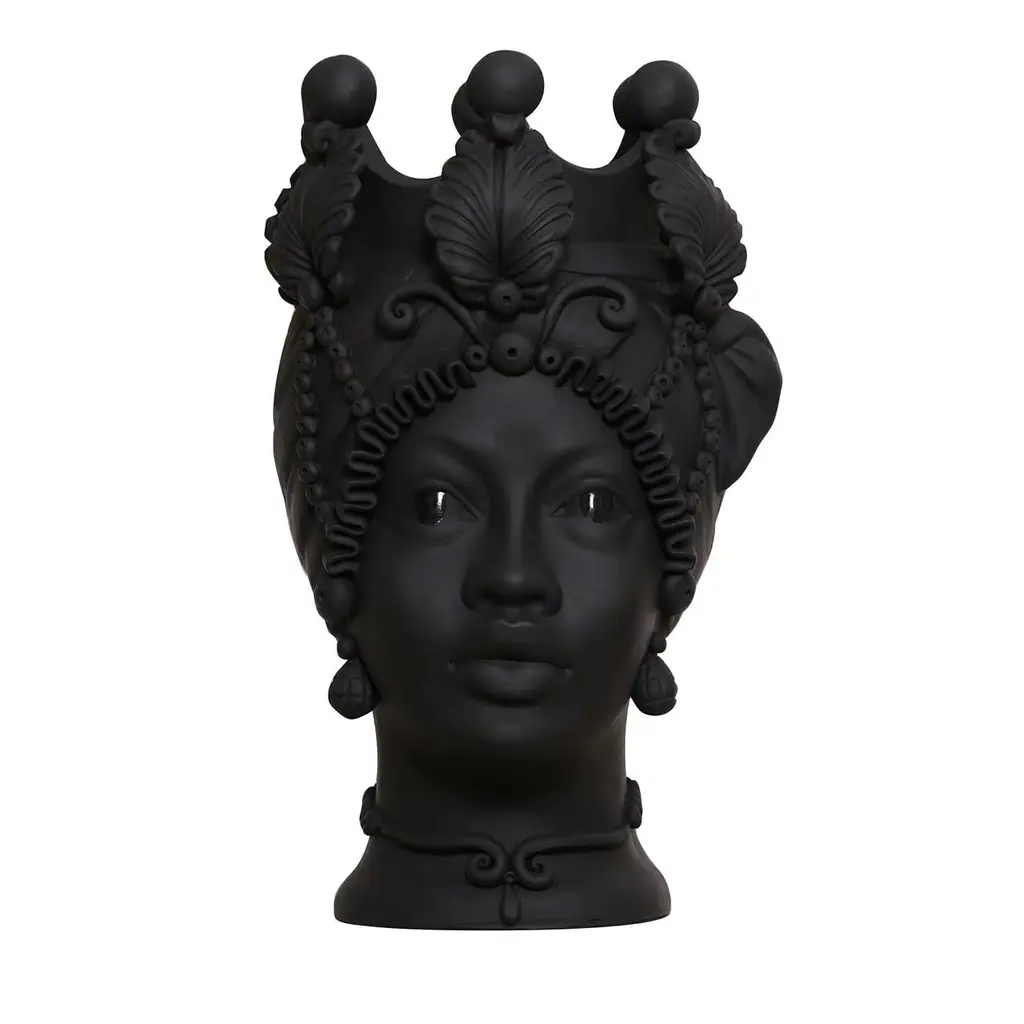 Meticulously handcrafted by ceramicist Stefania Boemi, this anthropomorphic vase of the Greek goddess Persephone is a testament to ancient crafting traditions. Crafted of terracotta with a rich matte black glaze, the vase delicately represents the fertile and feminine visage of Persephone, goddess of spring and wife of Hades, complete with an ornate crown, pendant earrings, and luscious lips. The handpainted matte black glaze contrasts with the glossy finish used for the vase's eyes, enhancing the captivating quality of the piece.