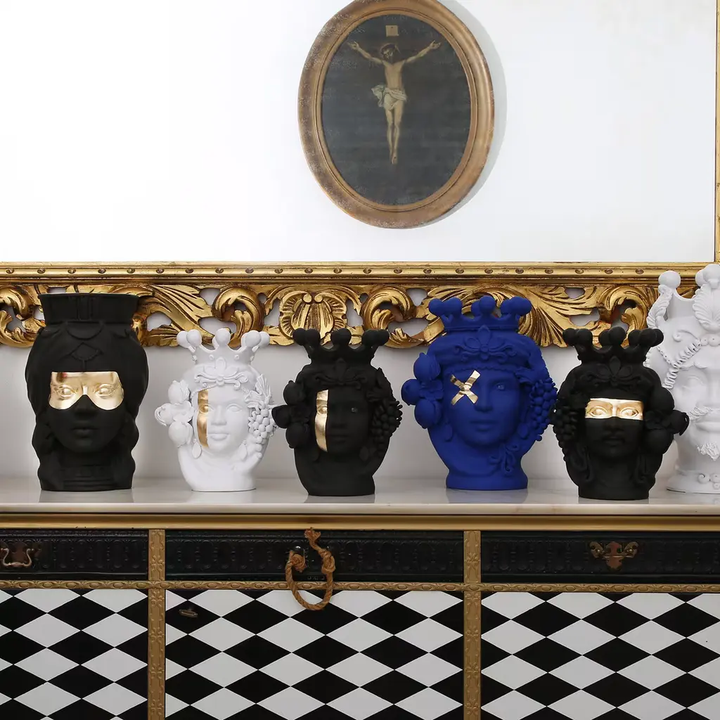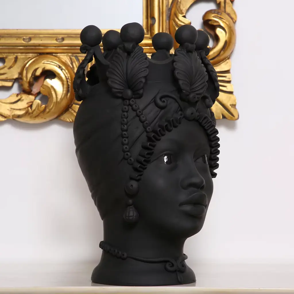 Meticulously handcrafted by ceramicist Stefania Boemi, this anthropomorphic vase of the Greek goddess Persephone is a testament to ancient crafting traditions. Crafted of terracotta with a rich matte black glaze, the vase delicately represents the fertile and feminine visage of Persephone, goddess of spring and wife of Hades, complete with an ornate crown, pendant earrings, and luscious lips. The handpainted matte black glaze contrasts with the glossy finish used for the vase's eyes, enhancing the captivating quality of the piece. The vase cannot be filled with water.