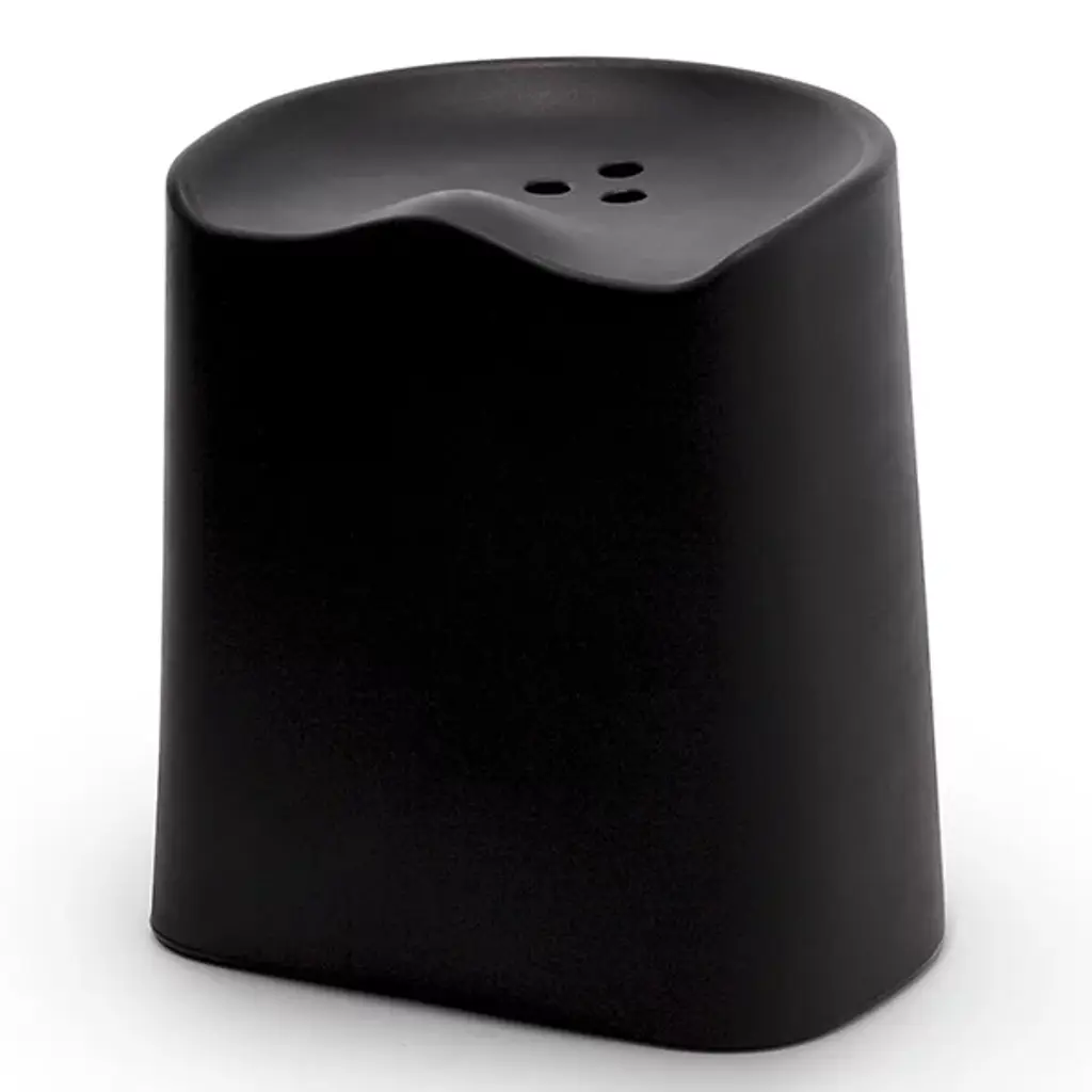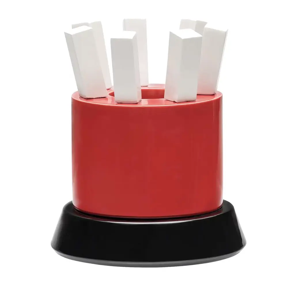A deft use of simple colors and geometric shapes defines this captivating vase designed by George Sowden in 2018 that will bring interest and character to a modern and industrial-inspired interior. The white bowl-shaped base supports a tall black cylinder topped with a white disk. The rim is accented with red squares, angled to create the impression of a flared mouth. The spacious and deep body is ideal for housing long-stemmed flowers in a foyer or on a dining table. Materialism Collection.