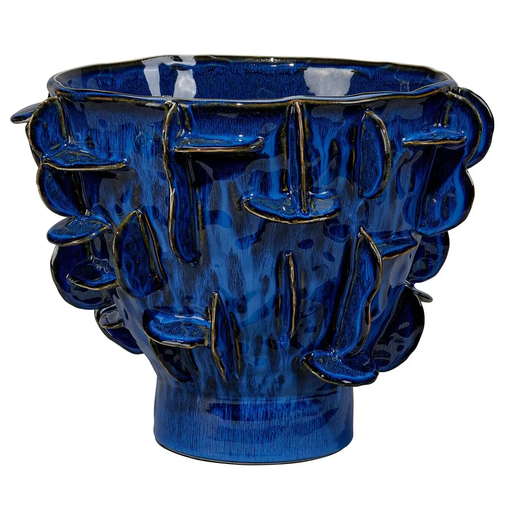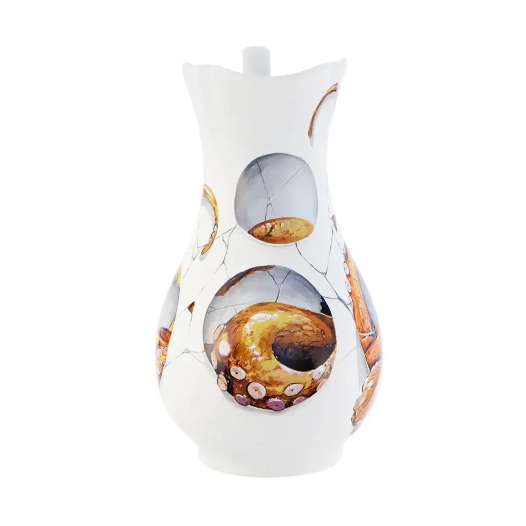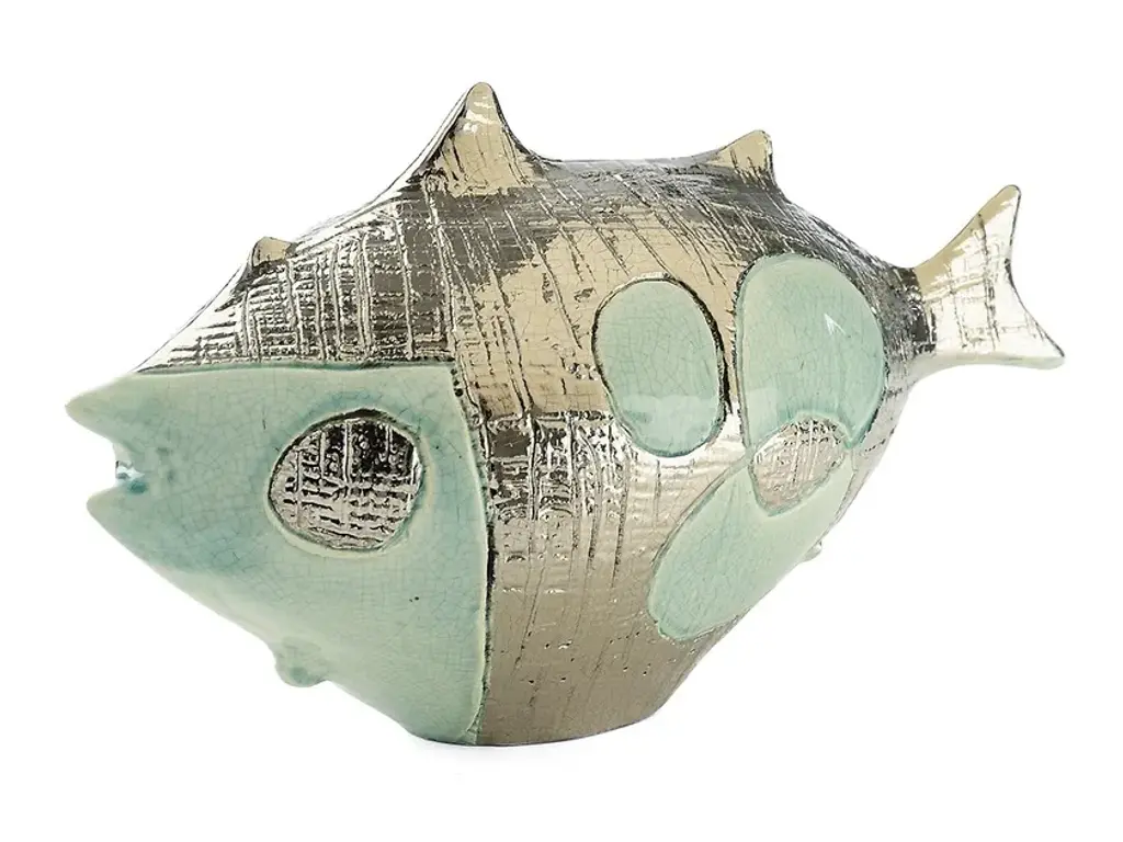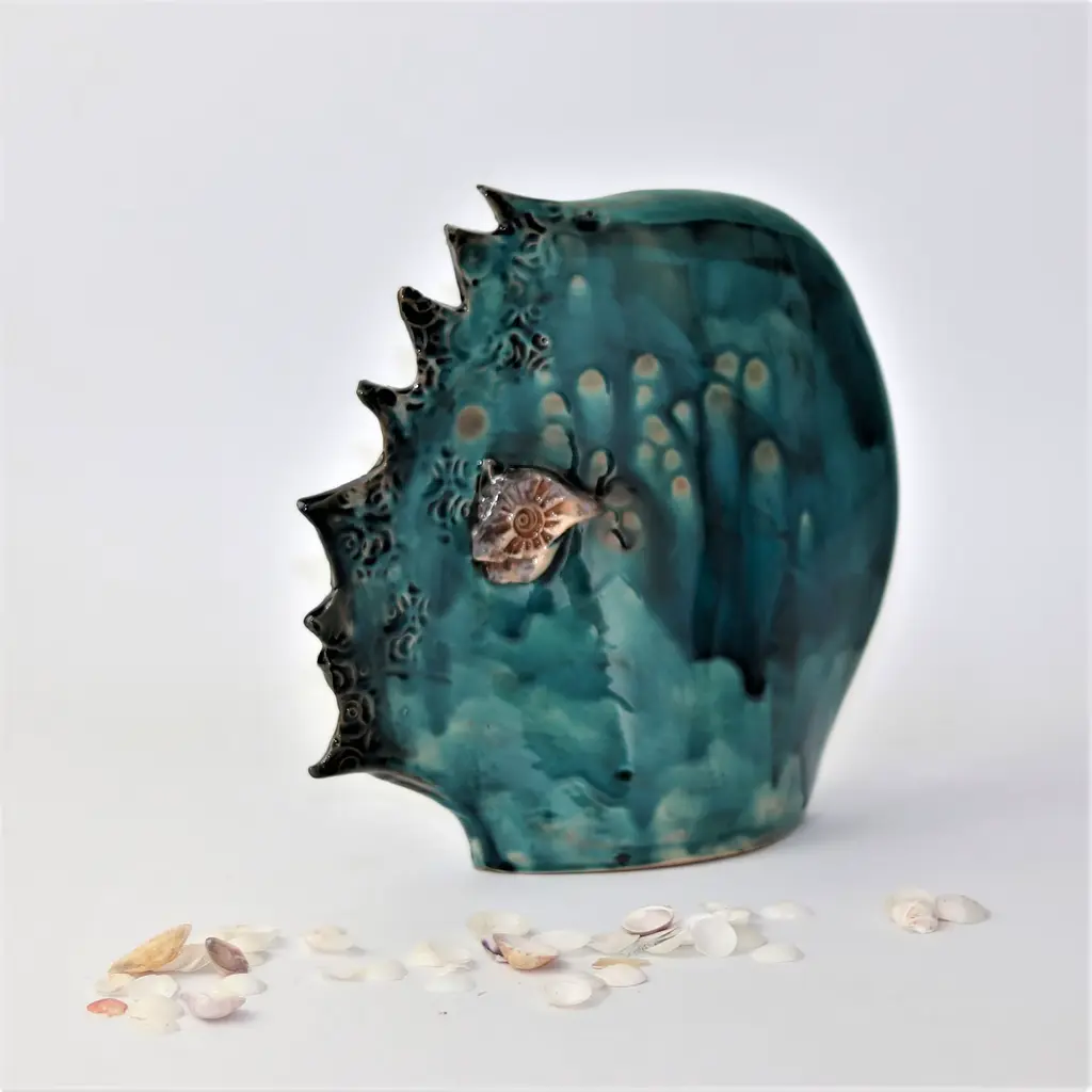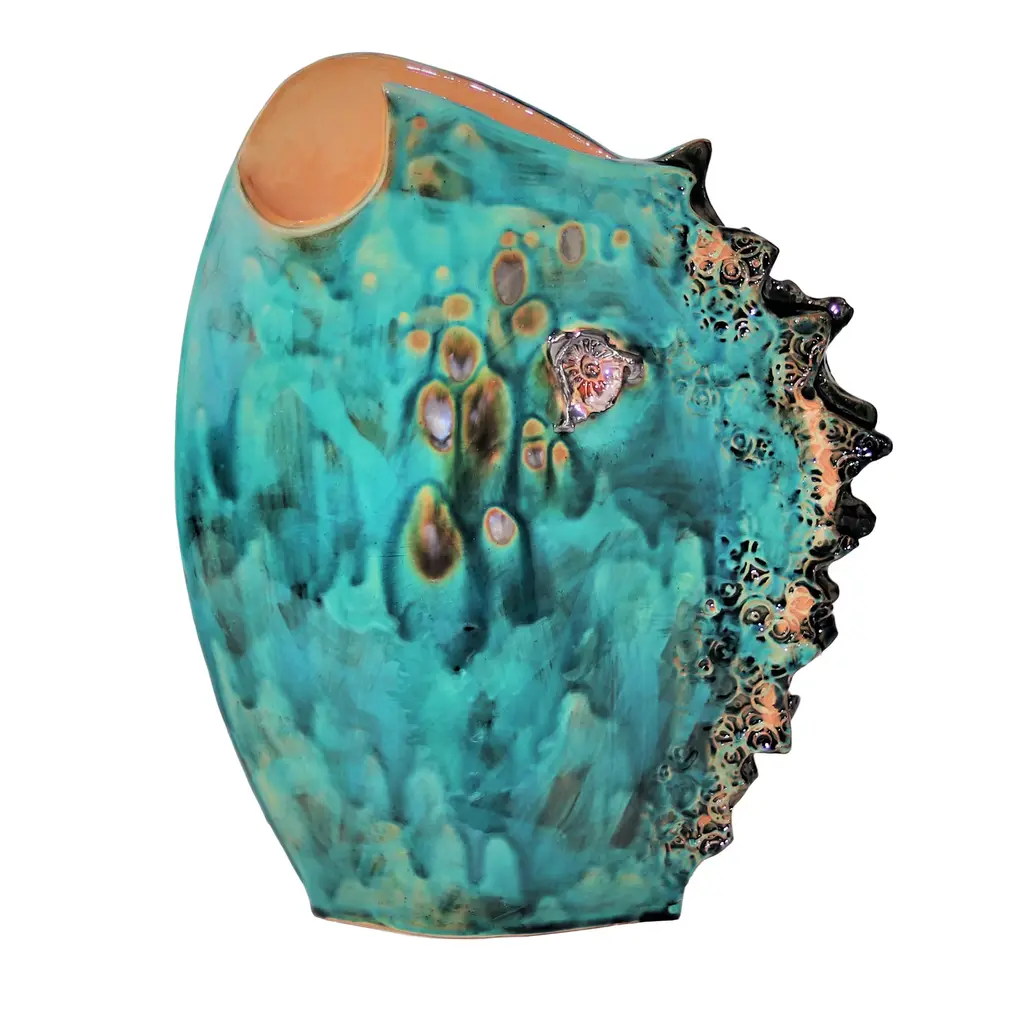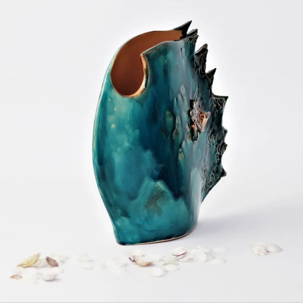 This stunning small fish-shaped vase is a singular and iconic accent piece for an opulent contemporary interior. Superbly handmade and decorated by hand, it is fashioned of ceramic enameled with turquoise ceramics glaze emblematic of the Mare Collection designed by Giuliana Collu. Creative and bold, its shape is entirely enriched with textured details of marine inspiration.
