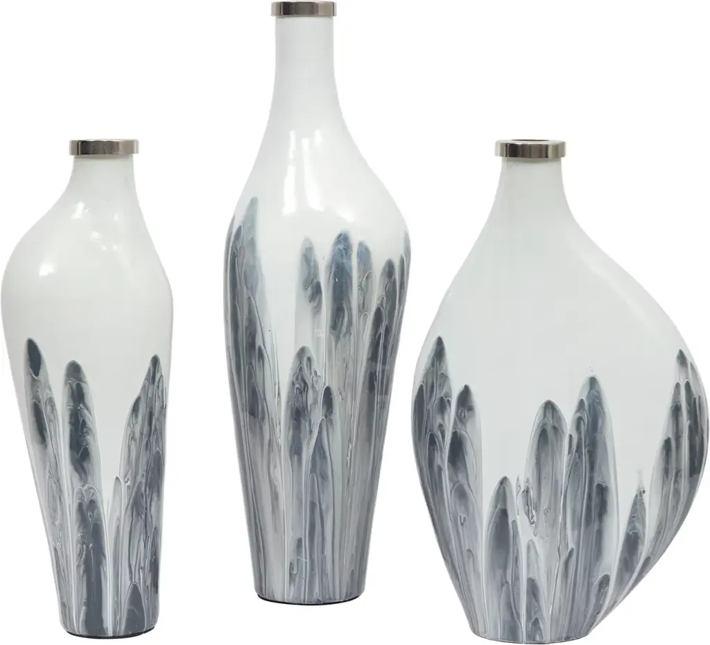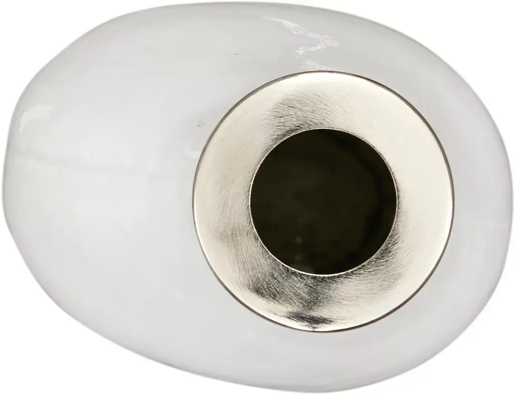 Spruce up your mantel or console table décor with the unique shape and design of our Peta vase. This glass vase features an irregular silhouette that is available in three different sizes and boasts a white finish with artistic brushstrokes of grey. An aluminum metal ring around the rim adds a contemporary touch. Please select your size before adding to cart.