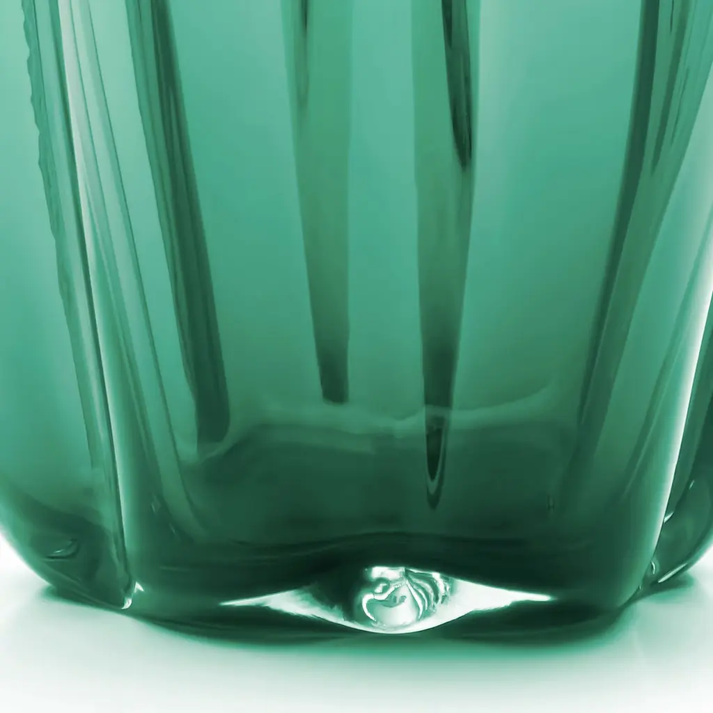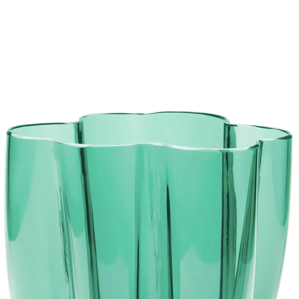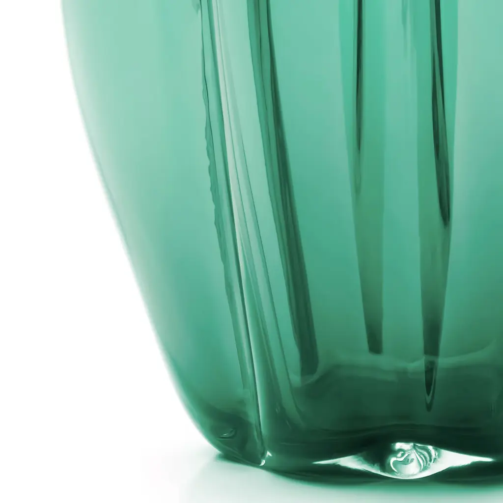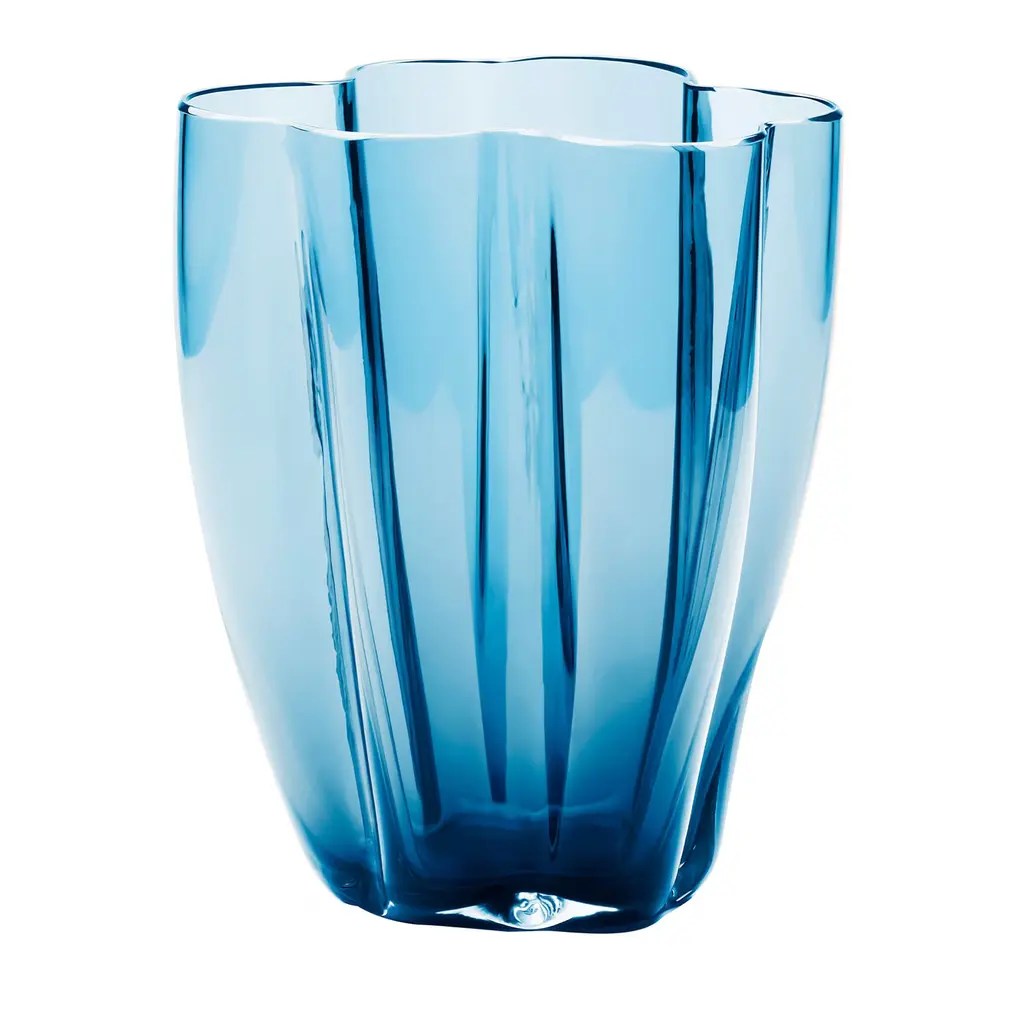 Petal is a rounded vase that, thanks to some fine metal wires, when blown creates lobed shapes that resemble petals. Designed by Alessandro Mendini, Petalo comes in two sizes, large with three leaves and small with six leaves in a polished finish to emphasize the beauty and transparency of the Murano blown glass. It is also available for customization thanks to the color variations of the color chart.
