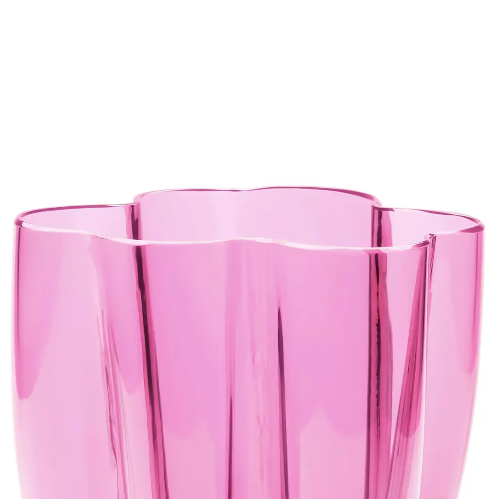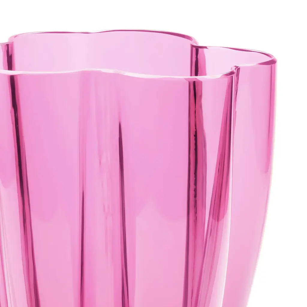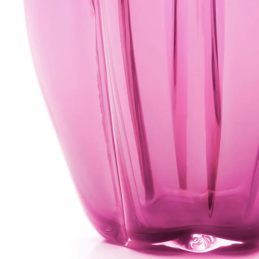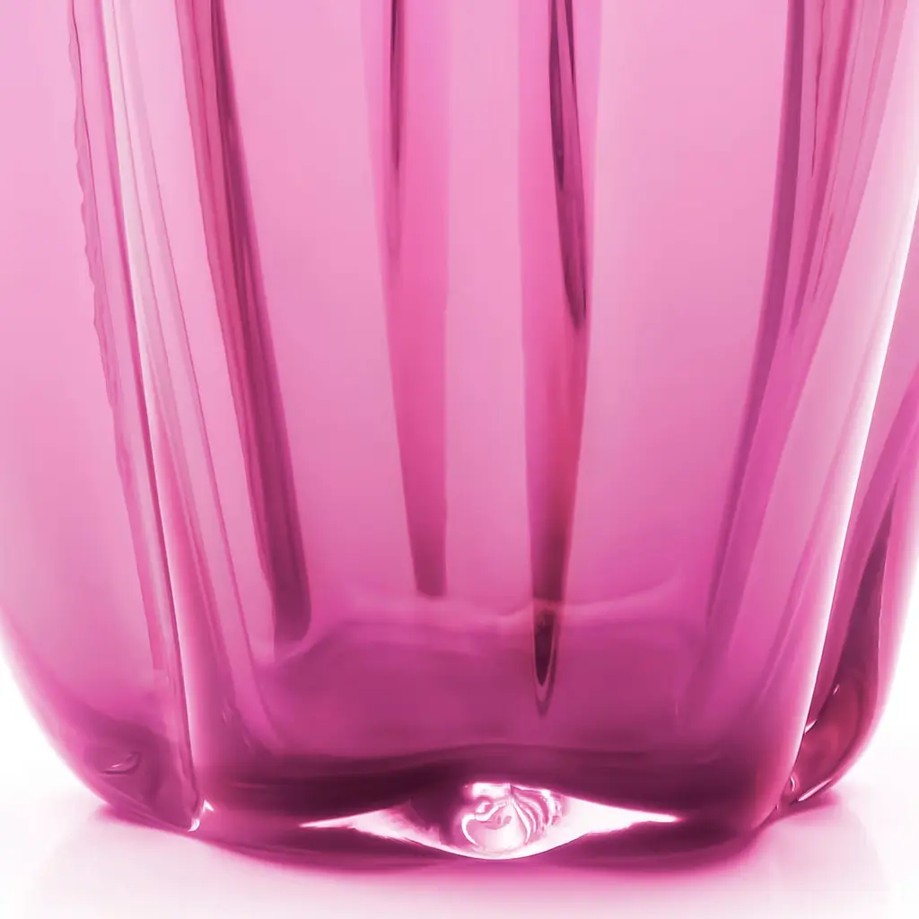 Petal is a rounded vase that, thanks to some fine metal wires, when blown creates lobed shapes that resemble petals. Designed by Alessandro Mendini, Petalo comes in two sizes, large with three leaves and small with six leaves in a polished finish to emphasize the beauty and transparency of the Murano blown glass. It is also available for customization thanks to the color variations of the color chart.