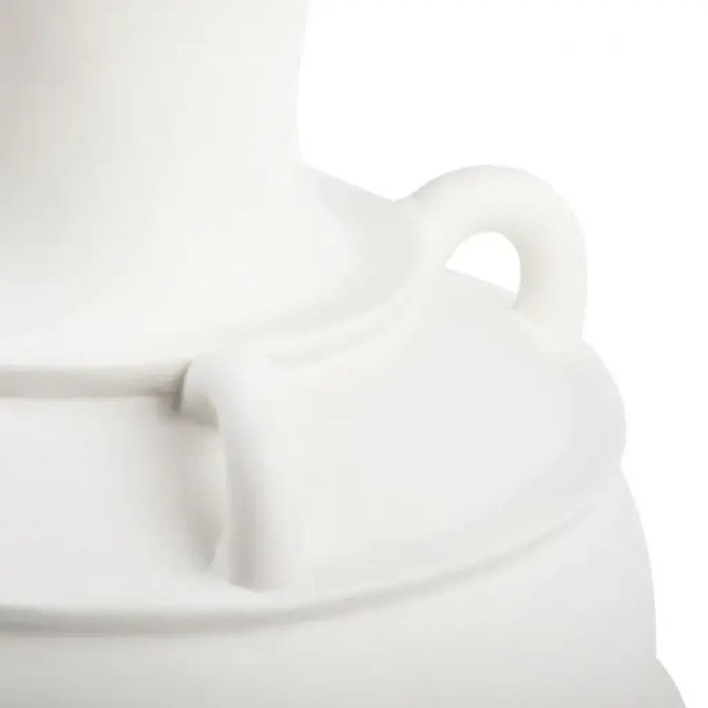 The white cliffsides of Santorini come to mind with the Phaedra vase. A Greek-inspired piece with rustic energy yet a sophisticated finish of hand-crafted Blanc de Chine porcelain. The Phaedra has a smooth matte porcelain exterior and glossy interior and is shaped with intentionally uneven ridges and handles to emphasize it's hand craftmanship and to impart a grounded feel. The Phaedra Vase can stand alone as décor or could be filled with long branches or stems at an entryway. This is an exceptional piece for a beach house or a minimalist apartment.