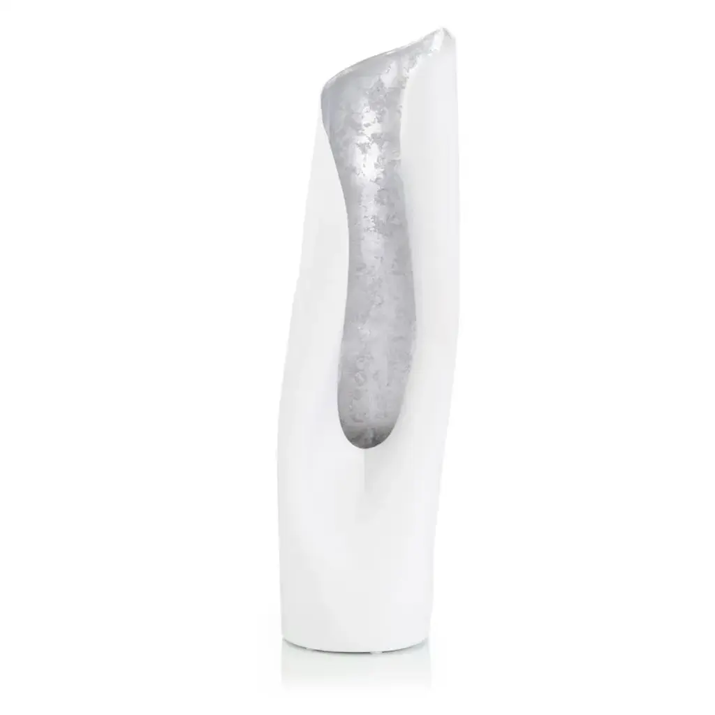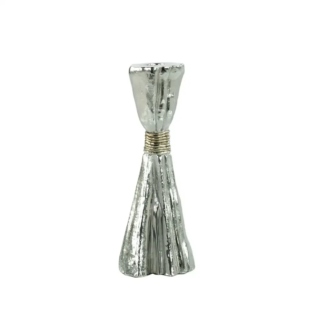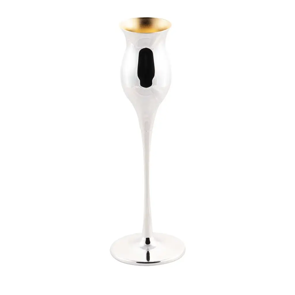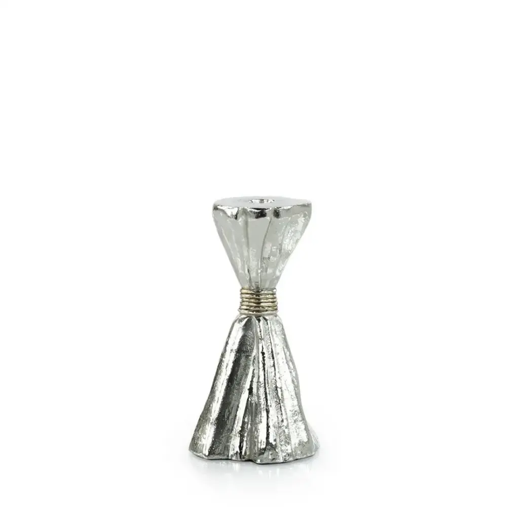 This exquisite vase takes its name from the playful and elegant shape: it is reminiscent of a small man with a hat (piccolo uomo con cappello in Italian). Made of silver with a partly shiny and bark texture, it may function as vase or candlestick. This piece is a sculptural work of art that will add an accent of luxury to any interior. The man's hat can be used as a candle-holder, while, if removed, this unique sculpture becomes a vase.