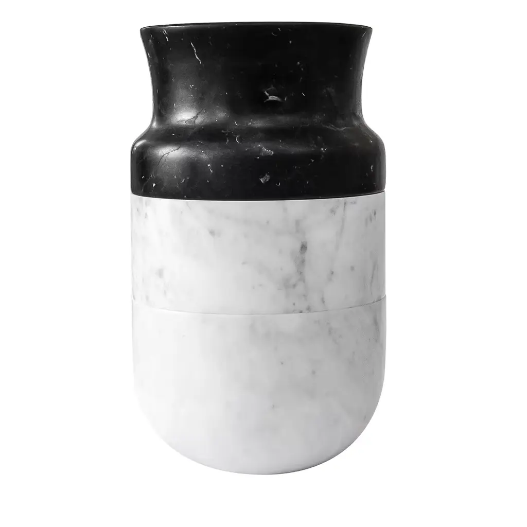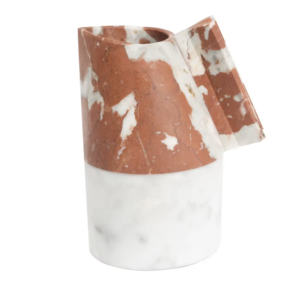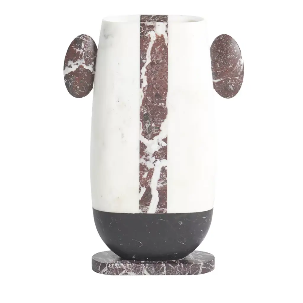 Inspired by the elongated shapes and graceful profiles marking Amedeo Modigliani's subjects, this sculptural vase merging white Michelangelo and red Levanto marbles will make for a delightful addition to any contemporary decor. Its anthropomorphic design is comprised of an elongated base, two side oval elements evoking stylized ears, and a stripe in black Marquina marble represents the mouth. This one-off piece is not watertight. Please note that marbles and stones are natural materials and they can differ also if coming from the same quarry or the same block. The product shown may differ from purchased items. Every piece is unique. Vases made of various marbles cannot guarantee water tightness, better not to use for cut flowers unless with vials for each flower, an internal glass/plastic jar or gel water pearls. Please read carefully the unpacking and handling instructions.